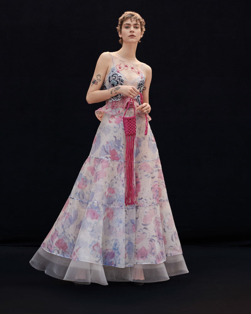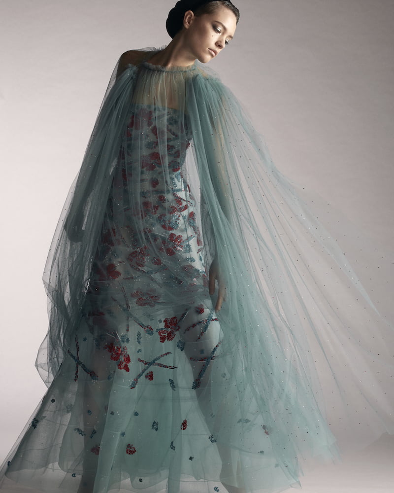 The show got to the very heart of Mr Armani’s aesthetic. Ease, elegance, excellence and modernity are his signatures, backed up by the supreme craftsmanship of his ateliers. He started with shimmering pagoda shouldered suiting, and gauzy gowns encrusted with crystals which looked miraculously light. Then then the maestro moved from icy shimmers into glorious colour with watery blue transparent gowns scattered with floral embroideries that would have met with Monet’s approval.