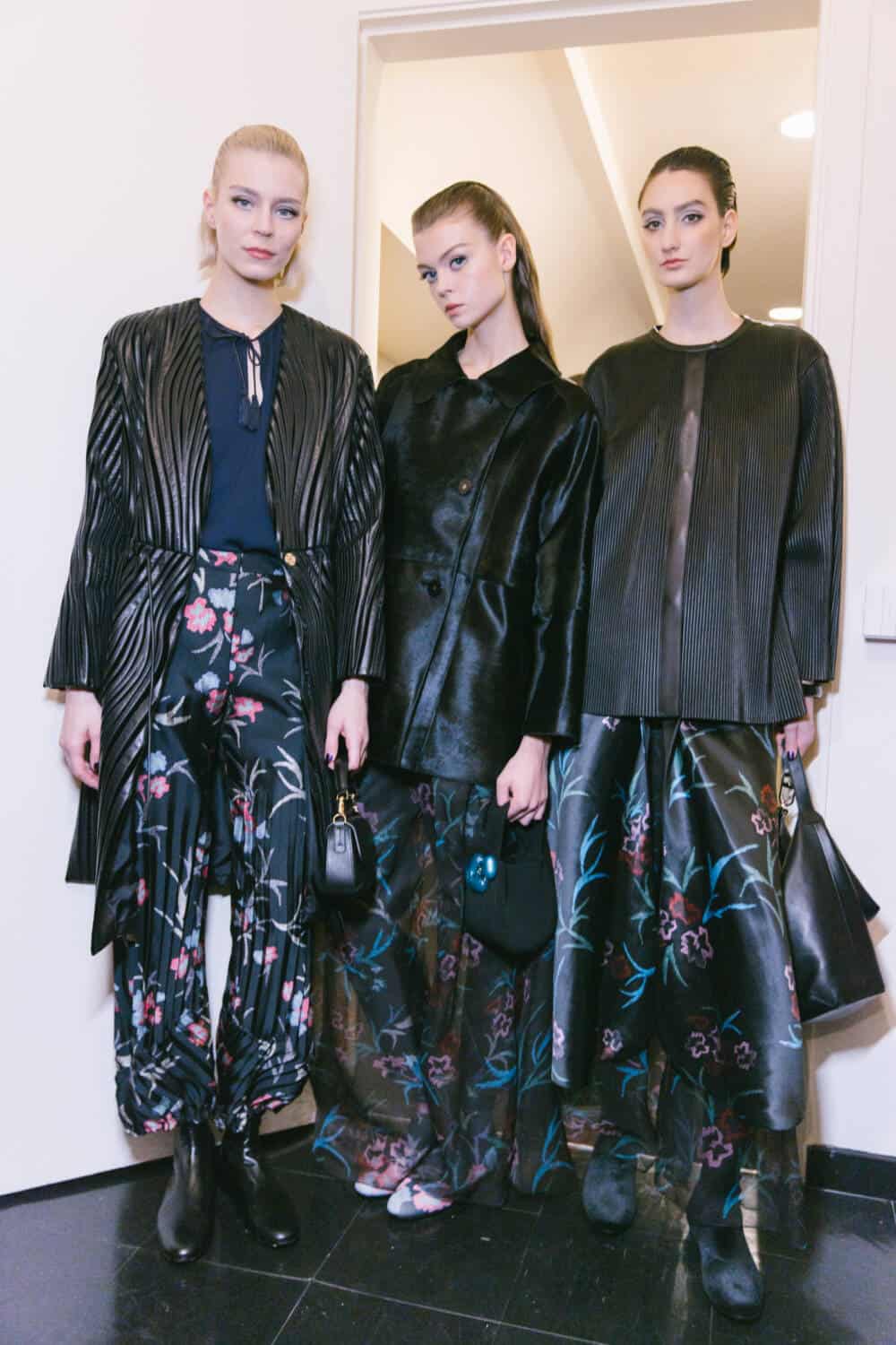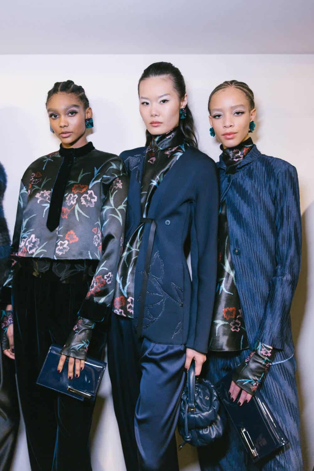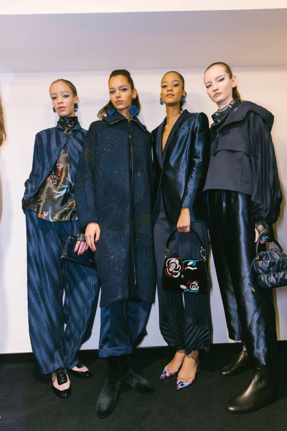 The show opened with, Gina di Bernardo, a favourite face of the house in the 1980s, wearing a soft, graceful coat worn with silk pyjamas underneath and a floral appliqué felt hat. The look telegraphed Armani’s trademark easy elegance.