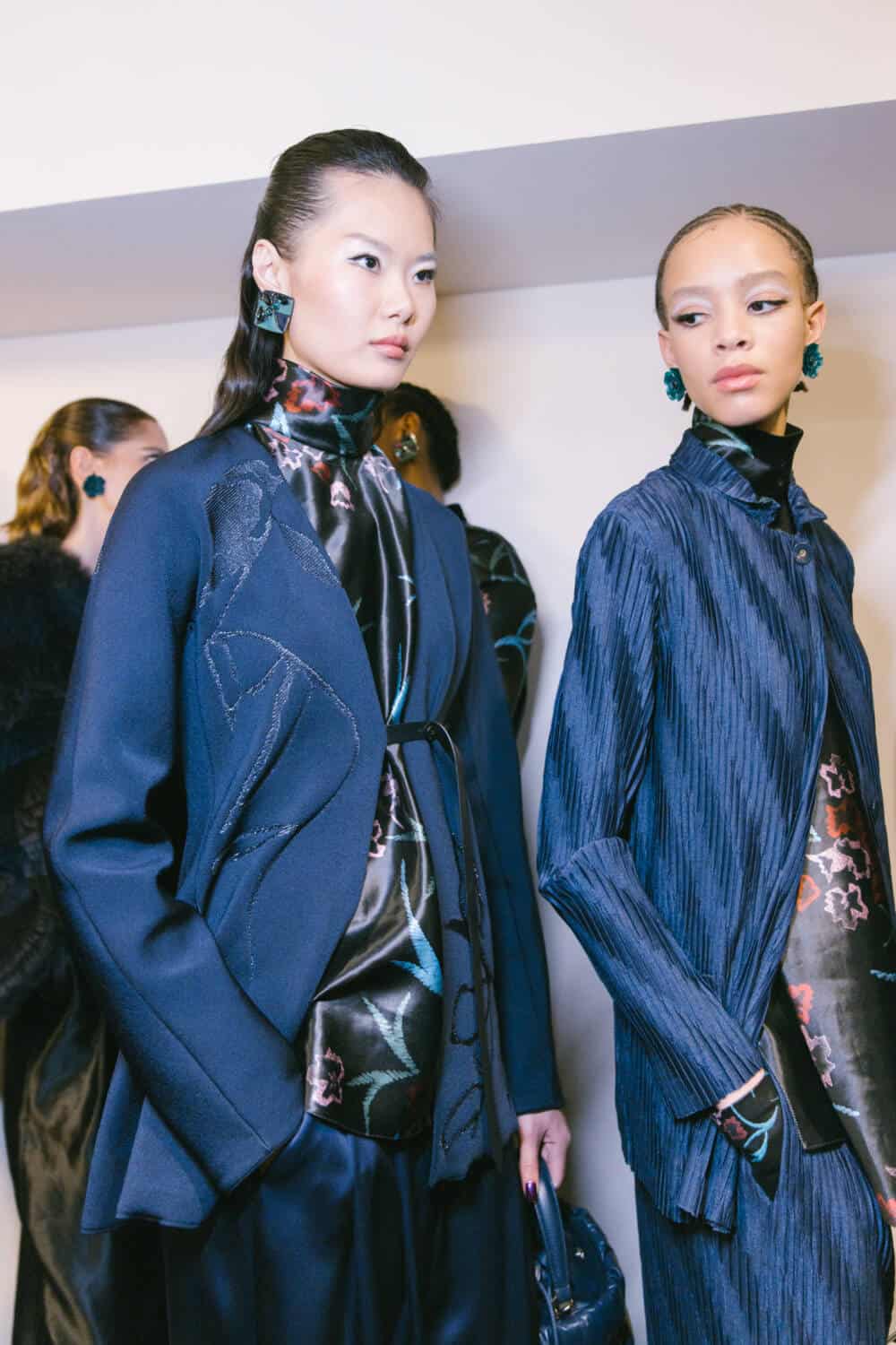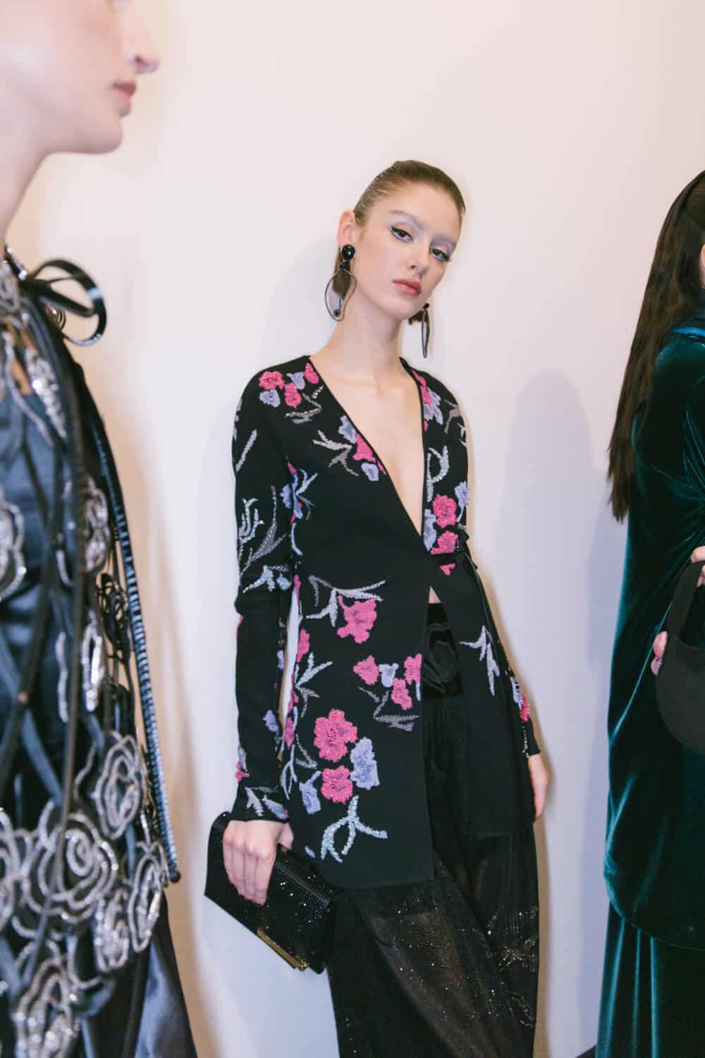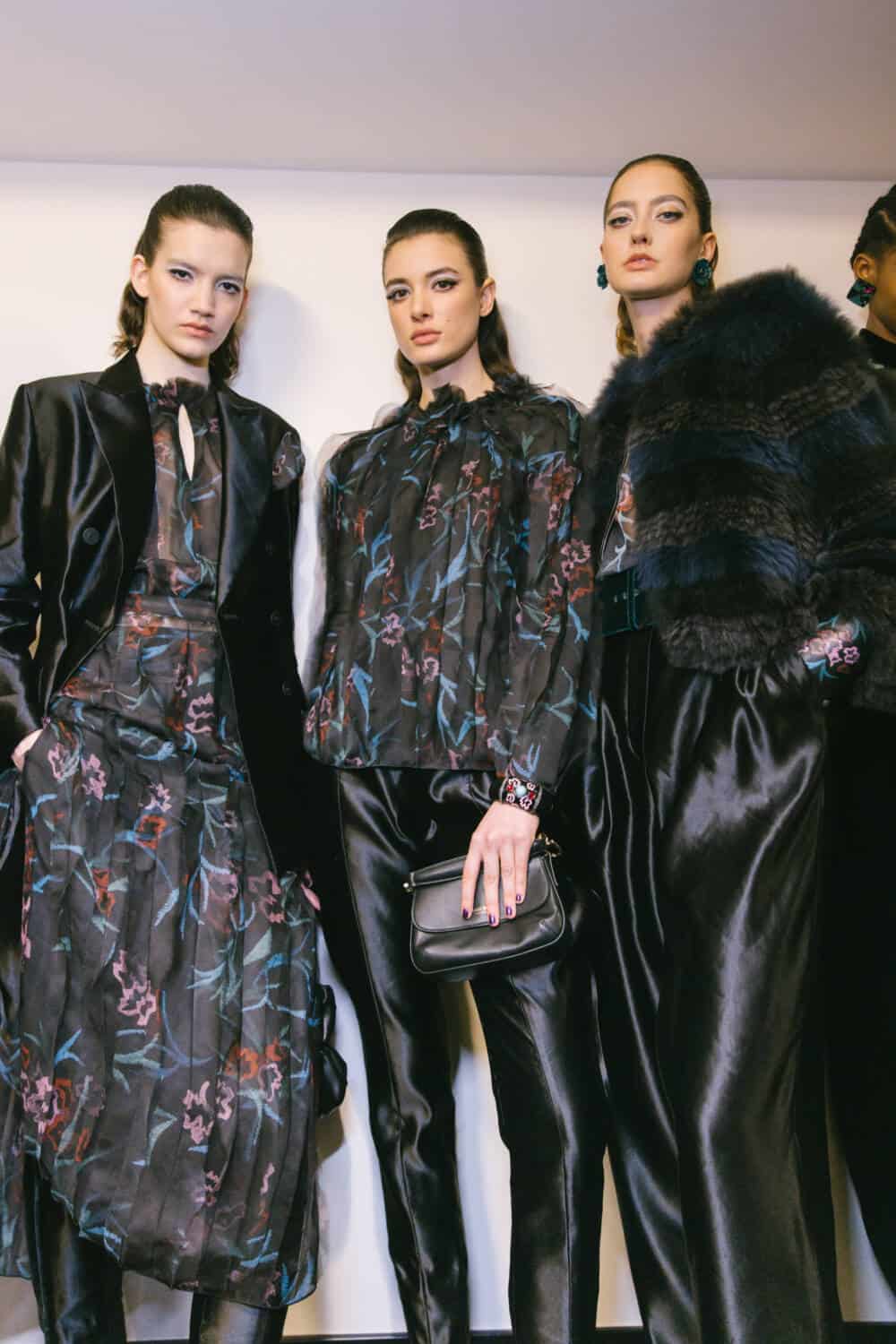 The silhouettes were soft, easy, sensual and enveloping. All harshness and sharpness was banished. Instead, fluid coats worn over liquid silk trousers, easy jackets in the softest silk velvet, and delicate flower-strewn gowns projected a feeling of poetic romance.
