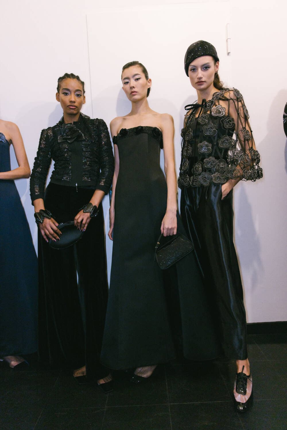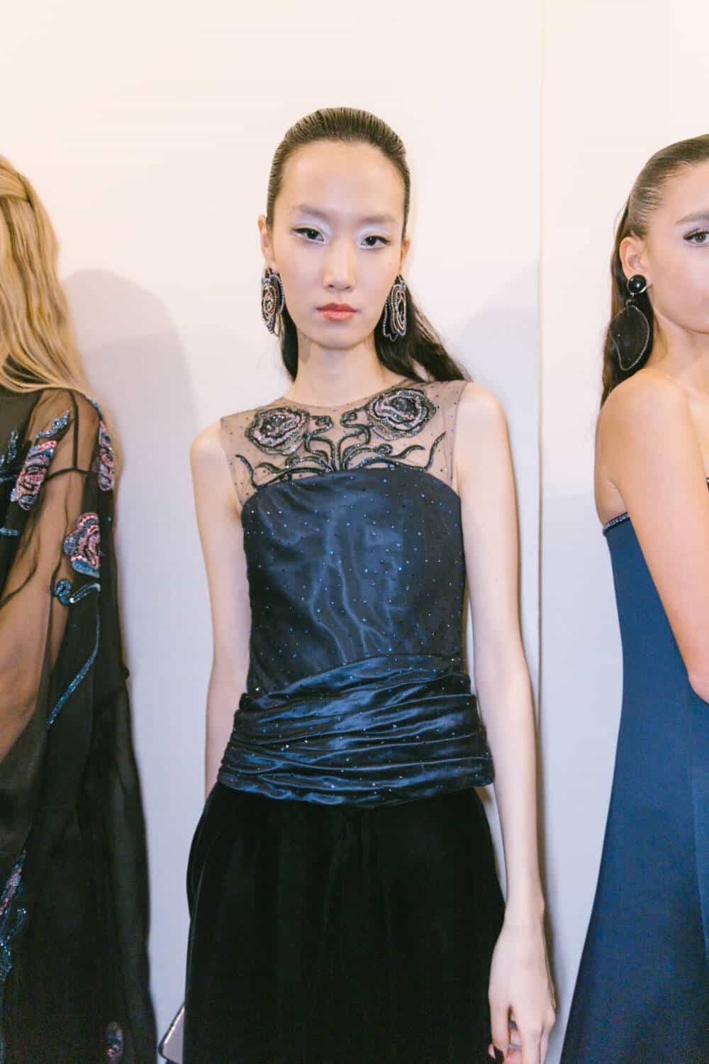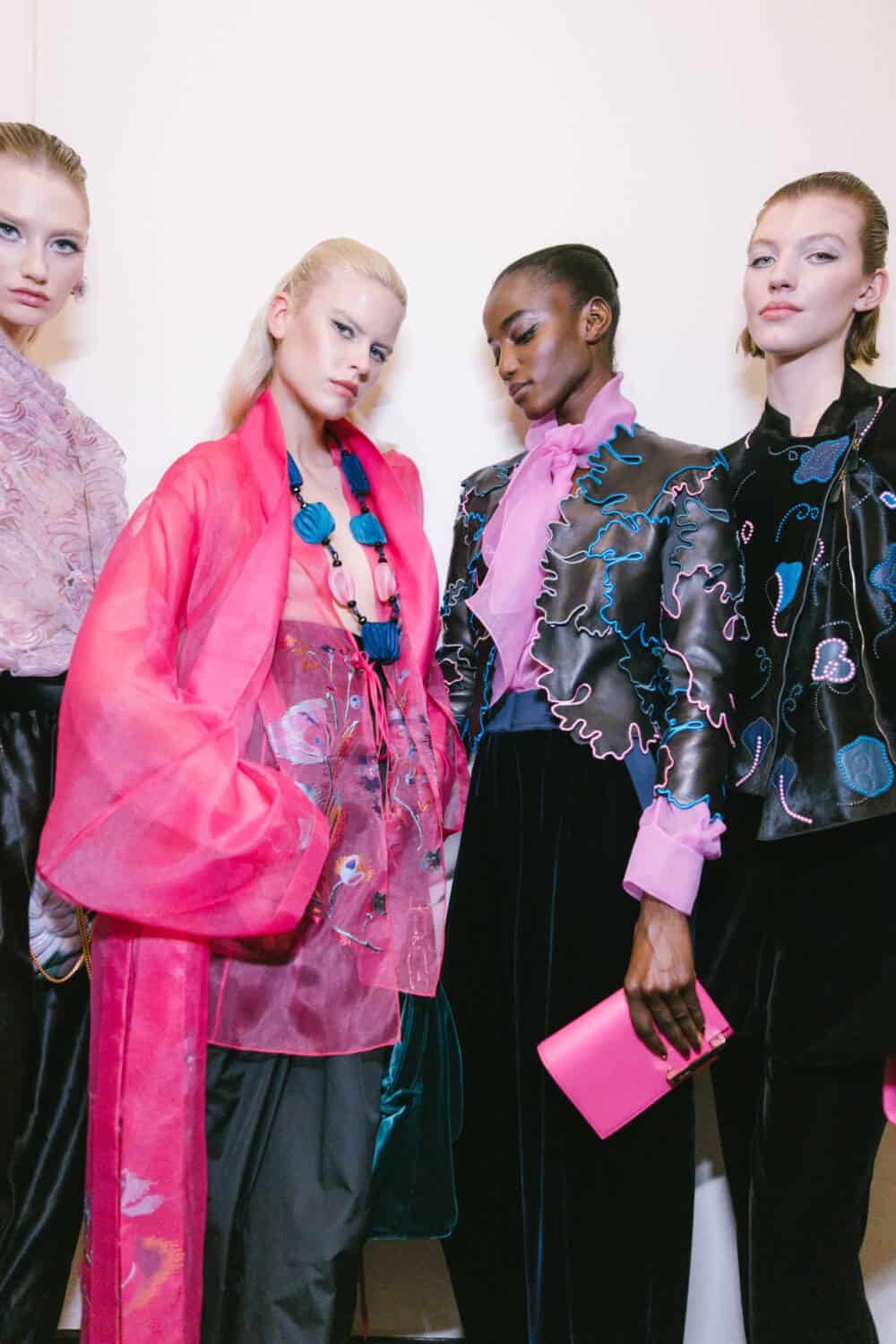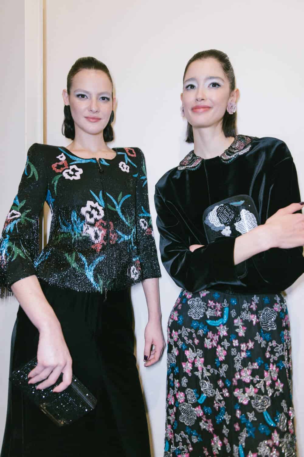 There was a playful eccentricity to some of the pieces – especially after dark. One evening cape cape was made of organza flowers applied to a cage of silk ribbons, a velvet coat was dotted with sequin petals, a humming bird embroidery fluttered over inky velvet jackets, charming rows of bows forming the asymmetrical straps on an being gown and a vivid pink flower embroidered organza opera coat offering a soaring sense of lightness. The mood was uplifting, whimsical and romantic then soared like an operatic aria with spectacular crystals embroideries on velvet evening jackets and gowns.