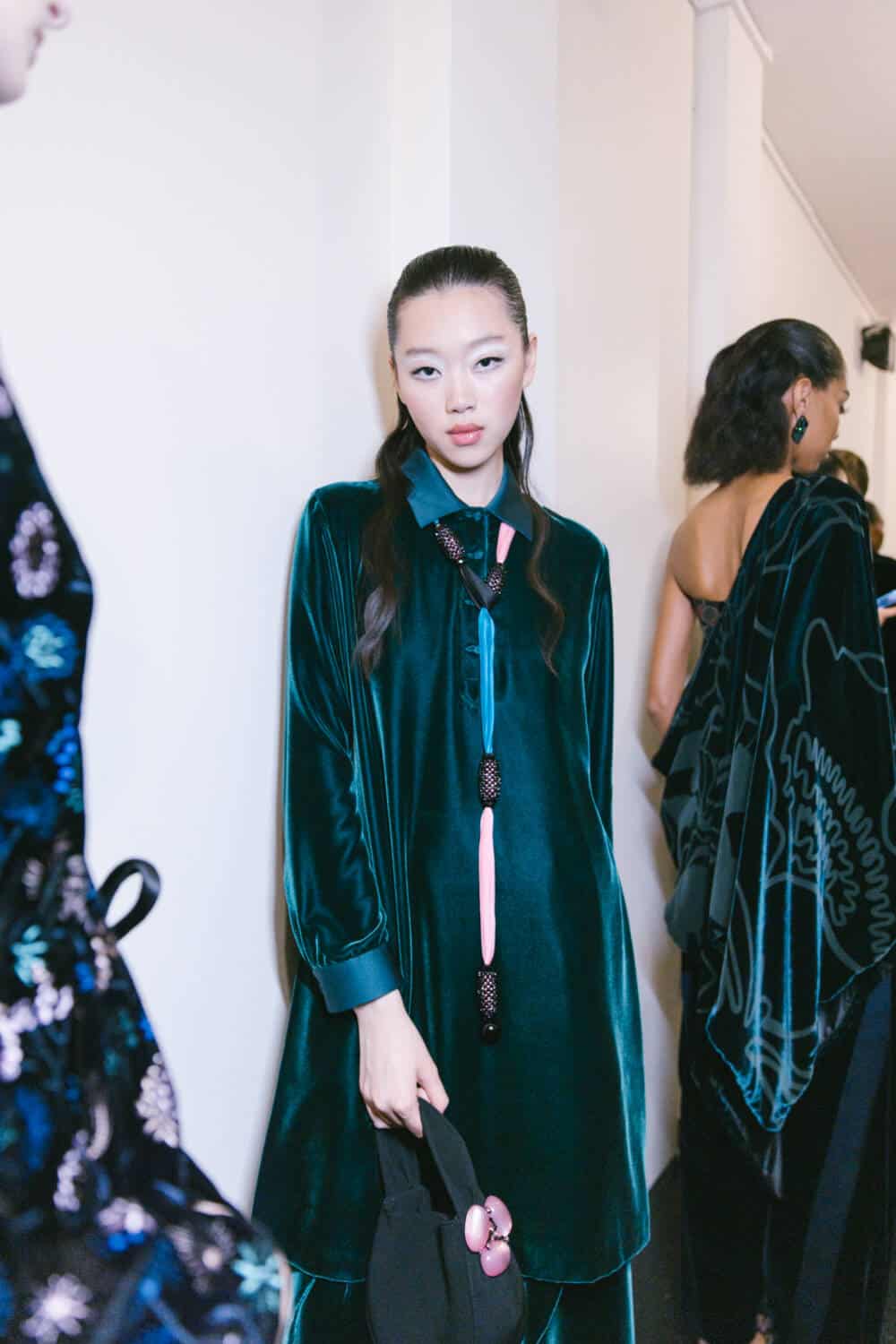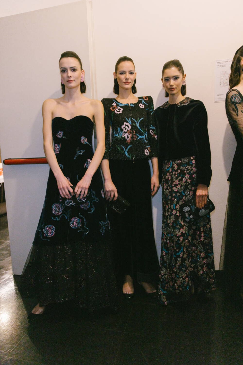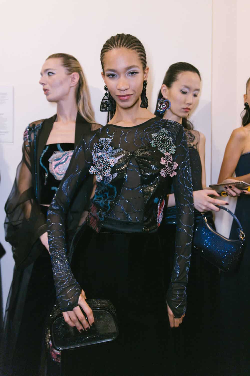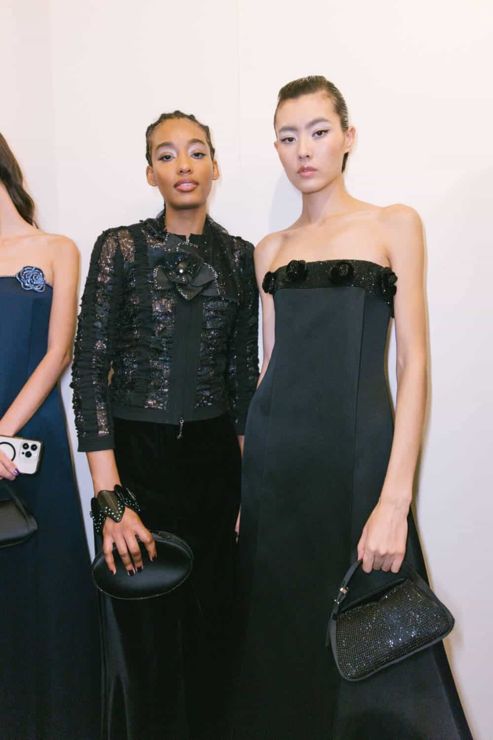 There was a playful eccentricity to some of the pieces – especially after dark. One evening cape cape was made of organza flowers applied to a cage of silk ribbons, a velvet coat was dotted with sequin petals, a humming bird embroidery fluttered over inky velvet jackets, charming rows of bows forming the asymmetrical straps on an being gown and a vivid pink flower embroidered organza opera coat offering a soaring sense of lightness. The mood was uplifting, whimsical and romantic then soared like an operatic aria with spectacular crystals embroideries on velvet evening jackets and gowns.