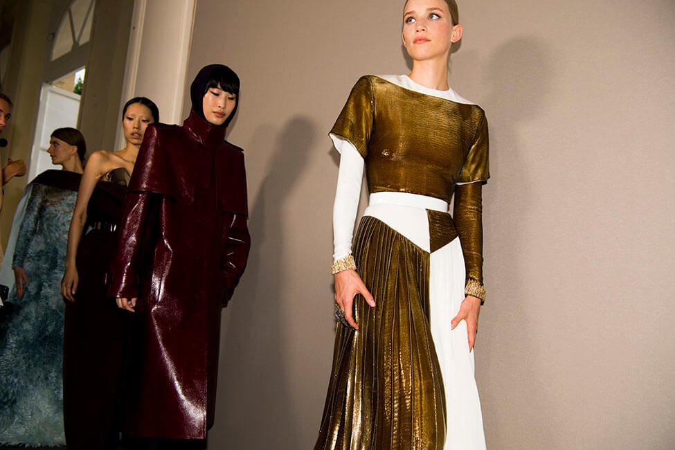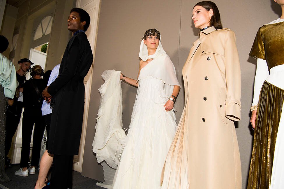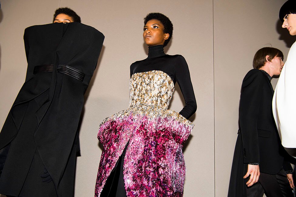 History is nothing to be ashamed of. That was the message of Givenchy artistic director Clare Waight Keller who staged her couture show in the garden of the French National Archive – a place where the past resides. She named the collection Caraman, after the Hotel de Caraman, home to the Givenchy couture atelier since the beginning. From Audrey Hepburn singing Moon River on the sound track, to the many archival references, this show embraced the legacy of Hubert de Givenchy. “He believed in elegance. He believed in chic,” said the designer, fresh from creating a pared down royal wedding dress for Meghan Markle. This couture show, the first since Mr Givenchy’s death in March, “felt like the right moment,” she said to pay homage. Recalling a conversation with him, she revealed, “He said to be strong and to have something that felt pure.” She looked to his clean, architectural designs of the 1960s and 1970’s for inspiration for her elongated silhouettes. Couture is a dream factory and this show was pitched at life’s Cinderella (or My Fair Lady) moments – there was no daywear. The Givenchy atelier is renowned for its workmanship which was on full display. Lean, molten metal column dresses were worn with curvilinear capes that arched across the body. One long cape was entirely encrusted with glimmering blue and green stones, inspired by crystal caves and the beauty within the earth’s core. Another white cockerel feather cape was sprinkled with thousands of crystals which glinted under the setting sun whilst a gown of molten metallic sequins burst into plumes at the hem. Her men’s couture was also encrusted with beads. Waight Keller said she aims for a very specific reaction with haute couture. “It’s the moment when a woman comes in and you are taken aback by the pure elegance and beauty and the refinement. That feels incredibly modern and fresh. “ Mr Givenchy mastered it, she said “and I wanted to resurrect that.” These were grand designs, built for big occasions.