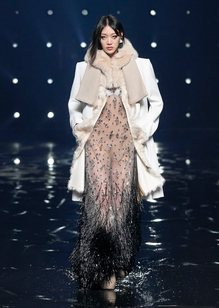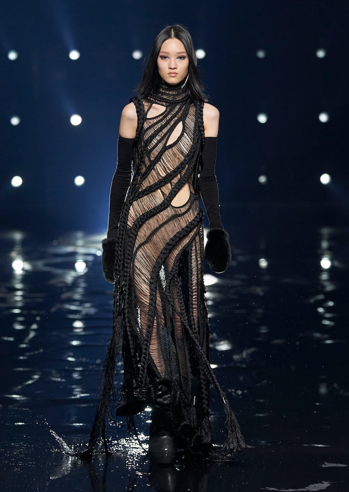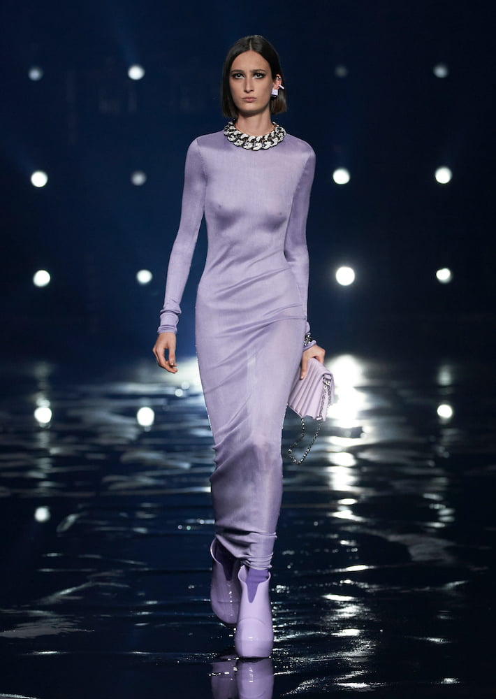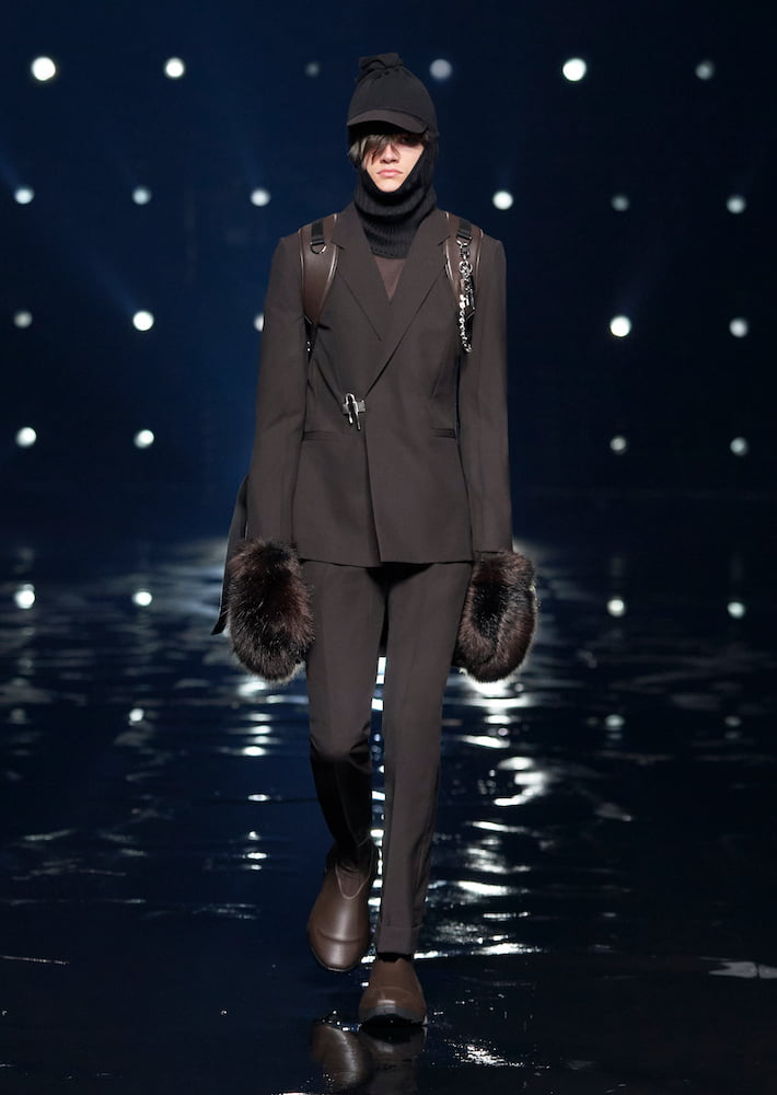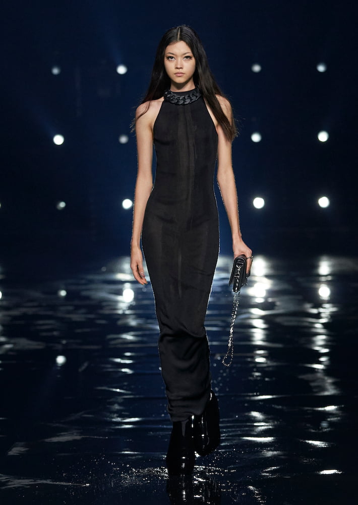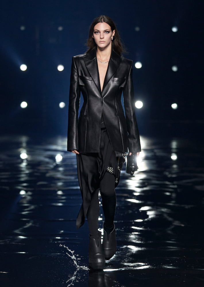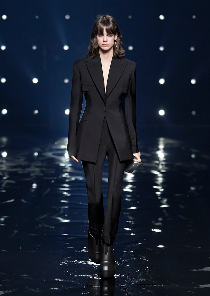 “In many ways, this collection is about a constant tension between two worlds,” wrote Williams in his show notes. He brought his sophomore Givenchy collection to the vast Paris La Défense Arena, where models trudged through water; their every move stalked by beaming spotlights.