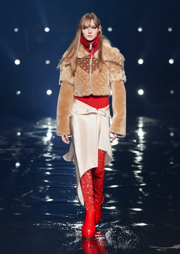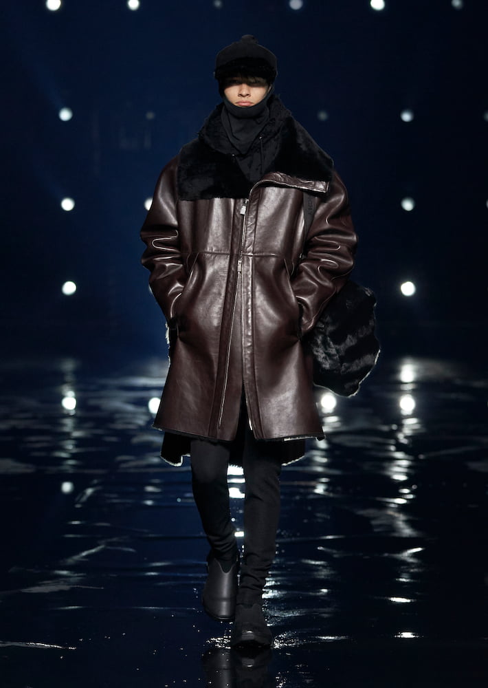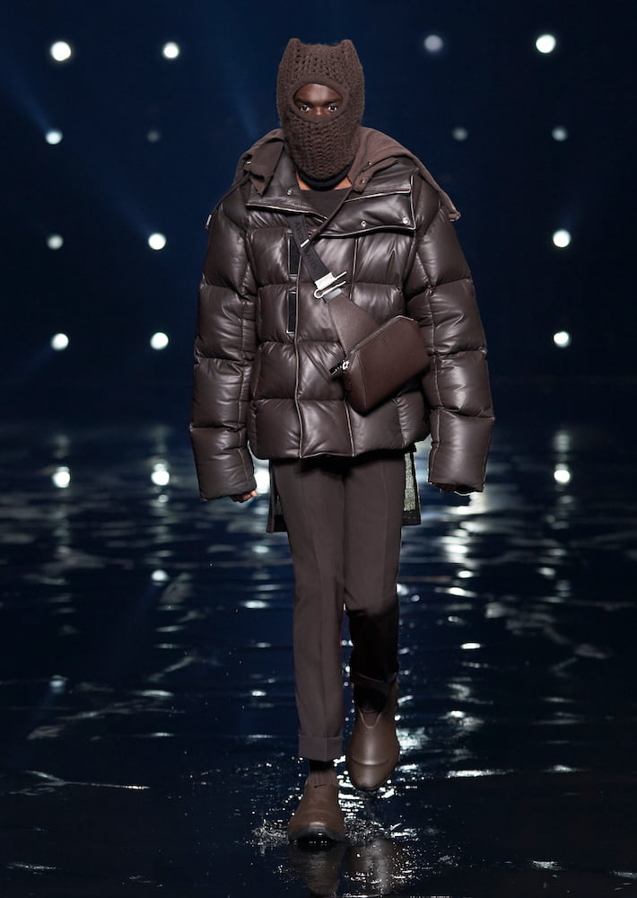Though, there’s a protective element to these garments, in particular heavy outerwear which cocoons the frame of the wearer. As models strode in choreographed formations, it appeared as they were commuting to a dystopian future, where their clothes served as armour in tackling the everyday. Emerging into the outside world post-pandemic, this mood feels more intuned with reality than sci-fi fantasy, and Matthew Williams is prepared to dress the unknowingness of tomorrow.