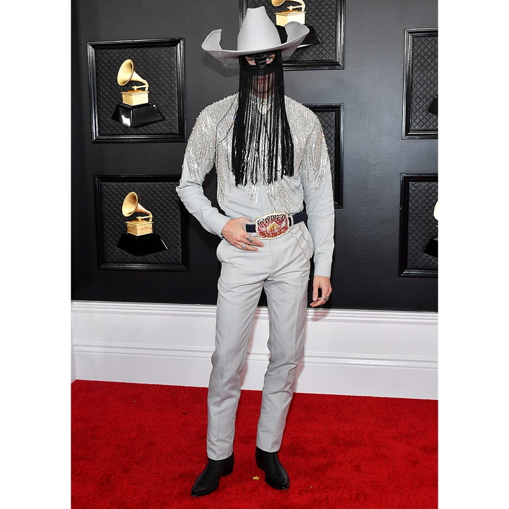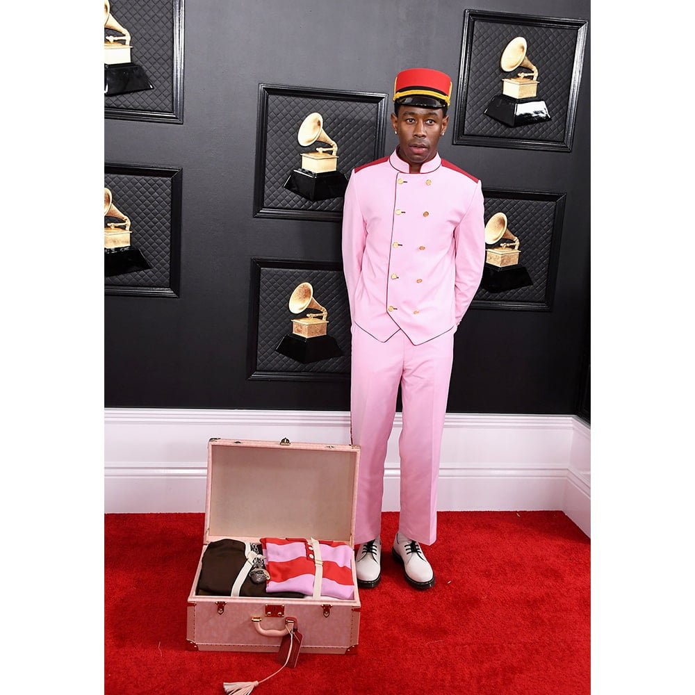 Going for something slightly more subdued was Maggie Rogers, who completed her starry Chanel number with with a CC bottle pouch she carried on the carpet in place of a bag. Staying hydrated without single-use plastic can look very glam indeed. And when it came to practical accessories we aren’t used seeing at award ceremonies, Tyler the Creator brought it. Looking like out of one of Wes Anderson’s flicks, the musician wore a custom lobby boy uniform in soft pink and a vintage-style suitcase which he posed with open, showing off its stylish contents. Everything was Golf Wang, of course – Tyler’s own brand originally launched in 2011 and still selling out. We’re sold on it too.