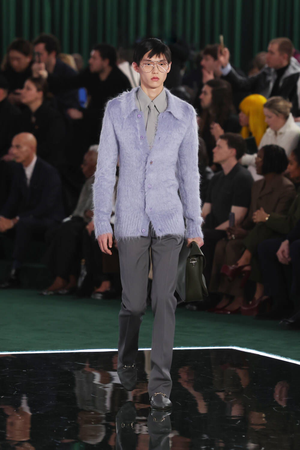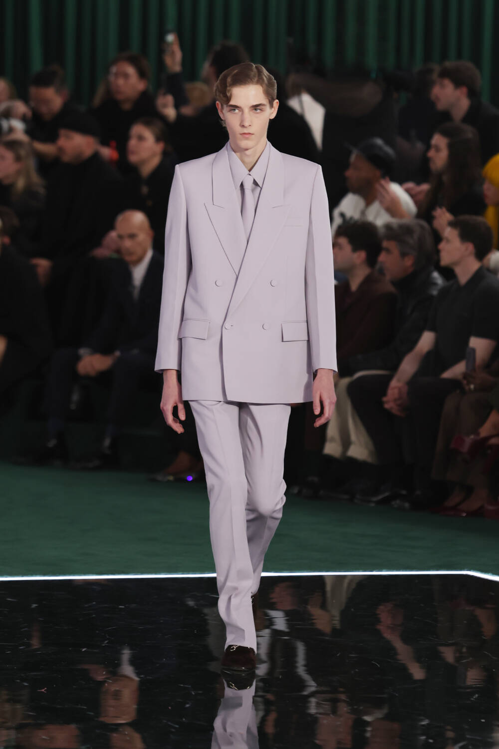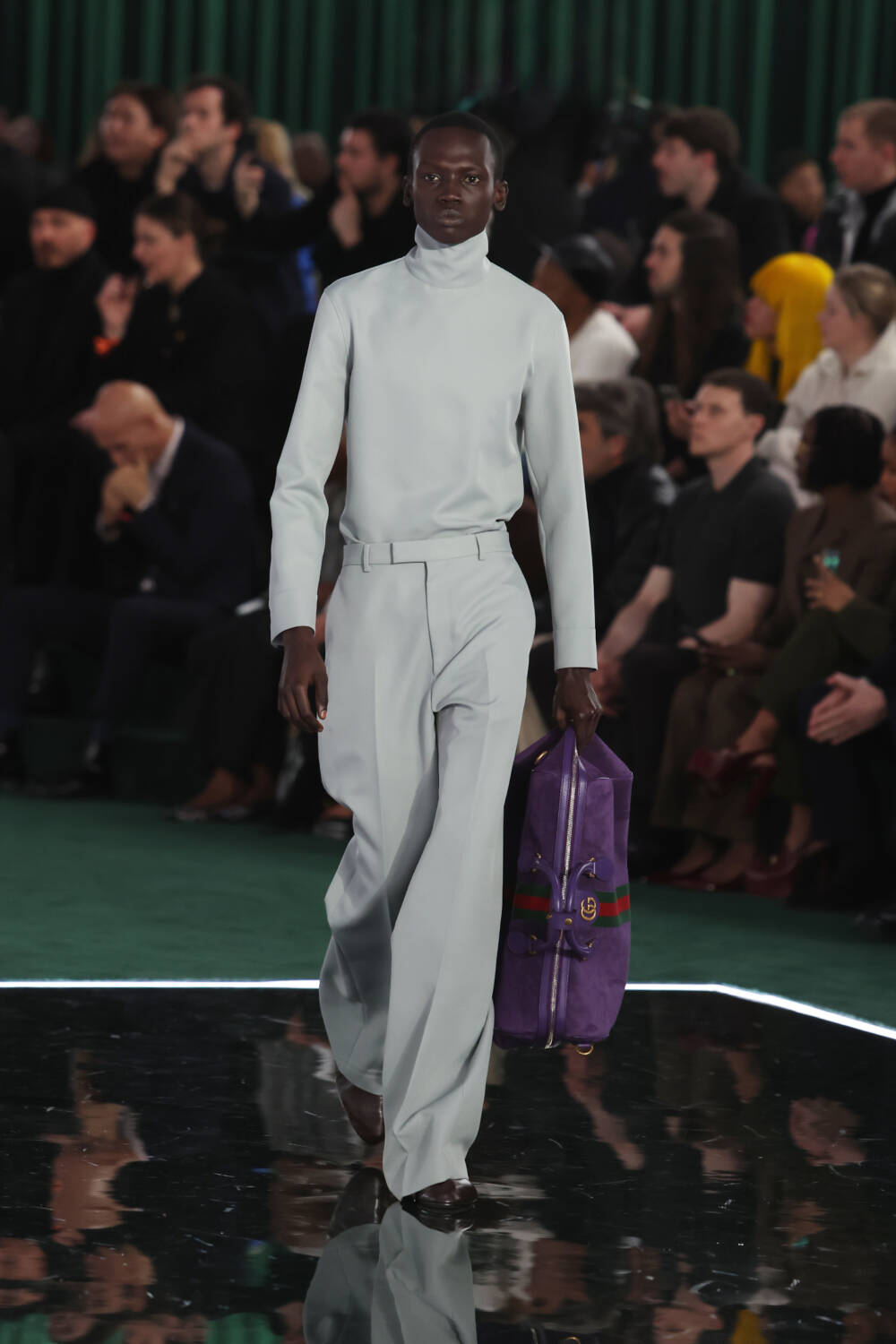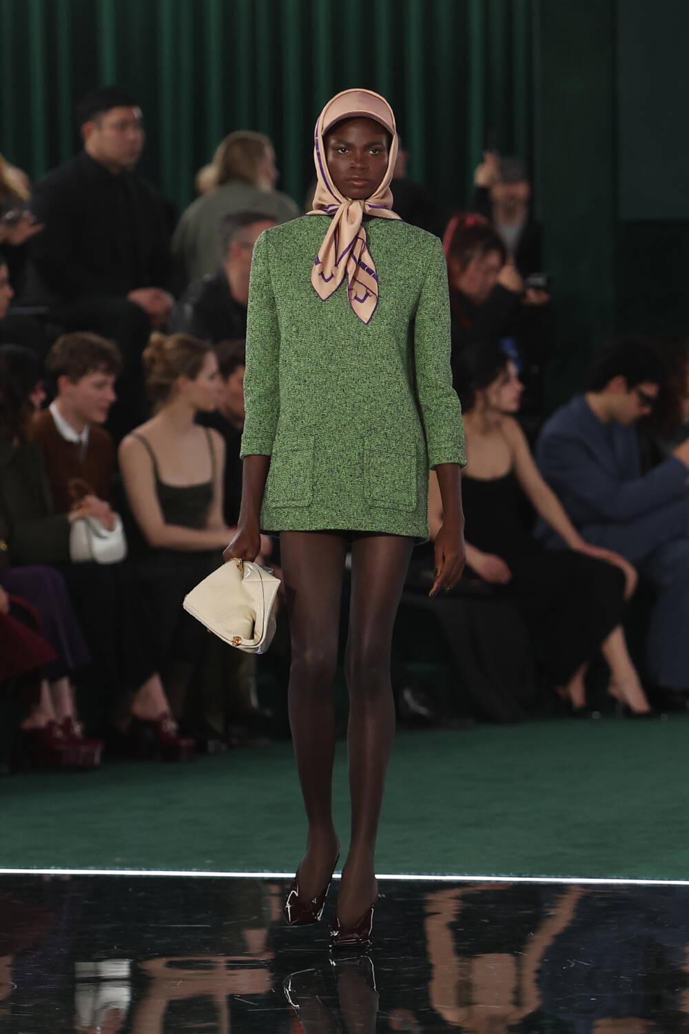 The big brand message was emphasised by the staging. The models walked on a vast Gucci green catwalk which mirrored the brand’s the interlocking G logo, as musicians performed to an original score by Oscar-winning composer Justin Hurwitz. The accessories motored along with a focus on the horsebit. It’s 50 years old this year but appeared on many new iterations – on fluffy totes, squishy little pouches and ladylike handbags. There’s plenty to buy here and many covetable pieces particularly outerwear. That was reflected in applause for the design team, dressed in Gucci green T-shirts as they took a collective bow. Gucci marches on.