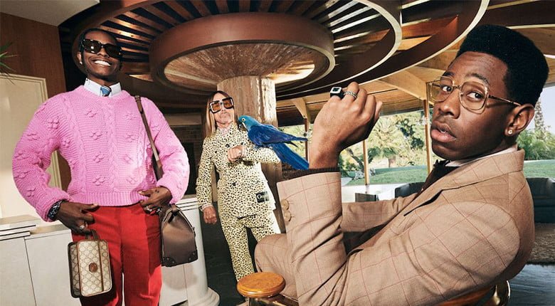 “The result is a group campaign with three men who I believe had fun too,” Alessandro Michele explains. “There is always this image of eccentricity because they are in fact eccentric themselves… It was beautiful to see these three men together, seemingly different but very similar.” In terms of the clothes themselves, we see Iggy Pop testing his knowledge with a crossword whilst wearing a white leopard print suit, A$AP Rocky in a hot pink knitted jumper paired with red suit trousers, and finally Tyler, The Creator, who wears a green sweater vest that could rival your Grandad’s, paired with a pink and blue candy-striped tie. The collection and the campaign are both sharp and fun, whilst providing a much-needed dose of male elegance. Michele explains, “perhaps elegance is something in the air that sometimes you are not even ready for. Male elegance can be unpredictable and strange.”