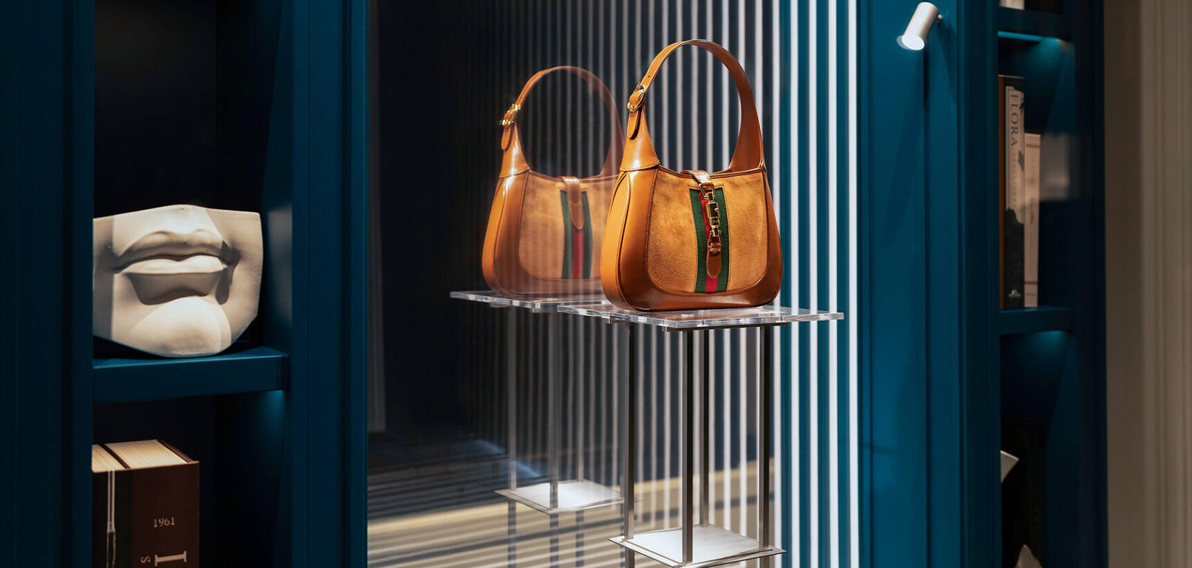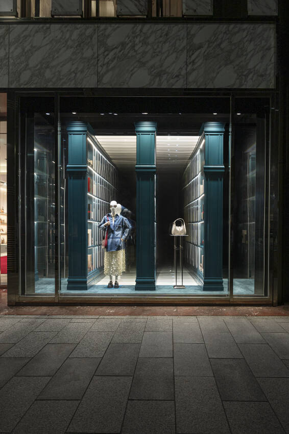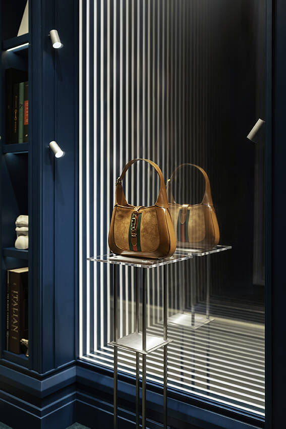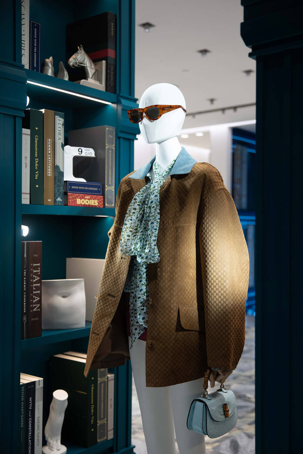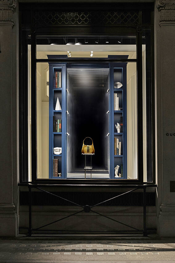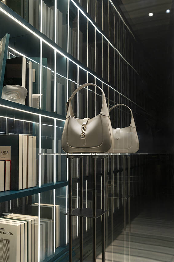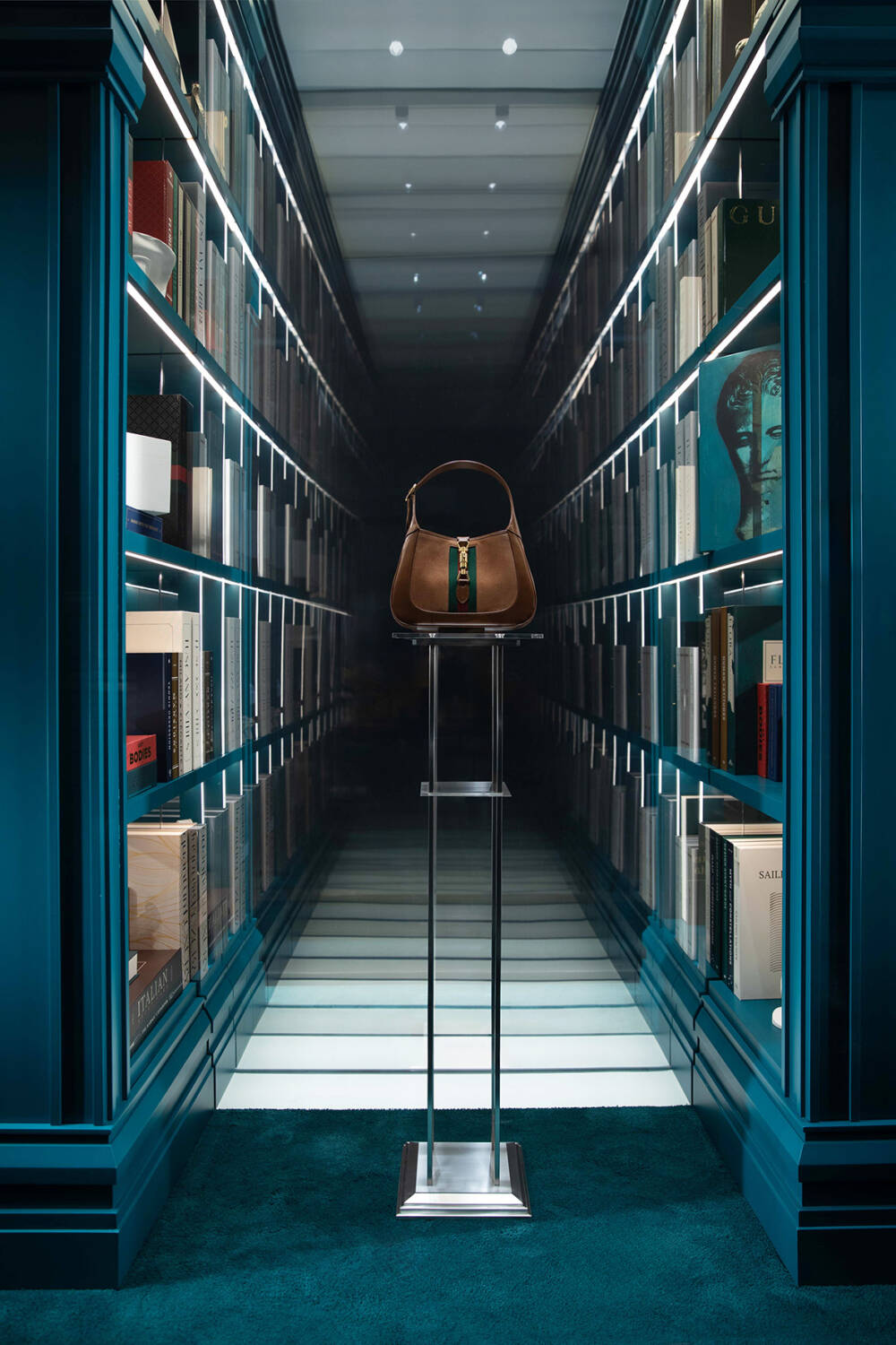 Coalescing the house’s heritage with its penchant for innovation to pen “endless narratives”, the display places replicas of Gucci’s archival bookends beside Jackie bags and alabaster statues on glass pedestals. Meanwhile the mirrored shelves, like portals to another universe, invite passersby to lean in close, to reflect and to uncover new perspectives.