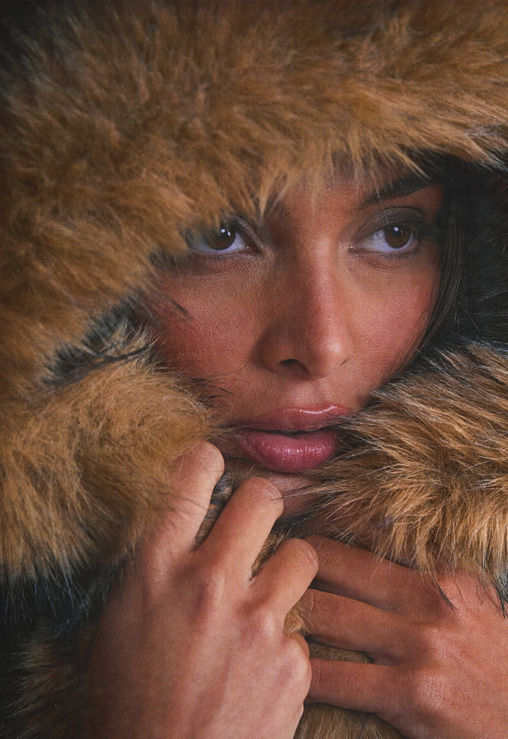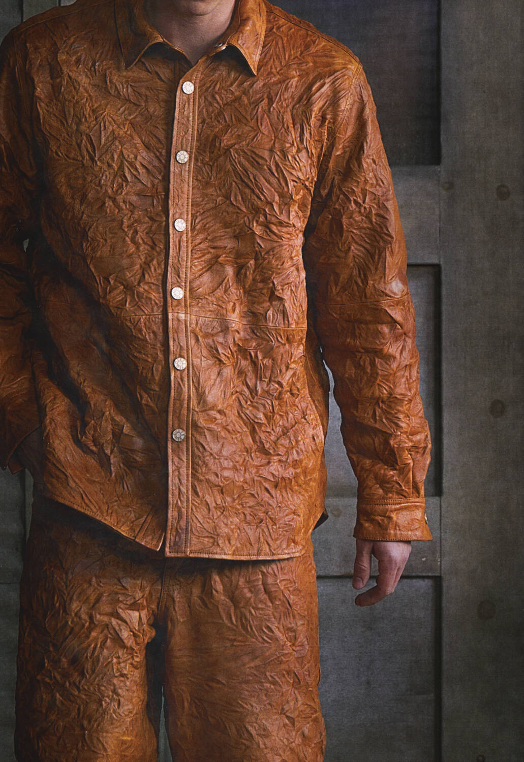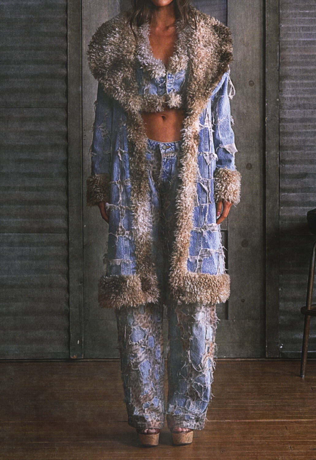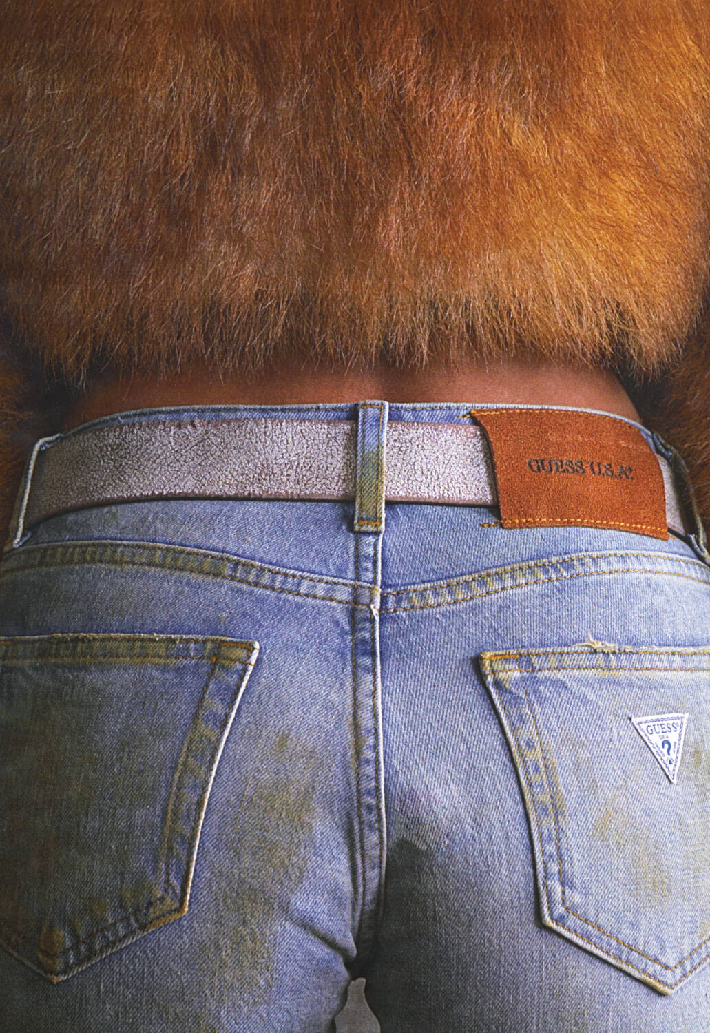 Faux fur takes centre stage, turning up the drama with gold-tinted boleros, patchworked animal-print bombers and a Penny Lane-inspired shearling jacket that wraps you up like your favourite roadie. Crinkled leather – straight from the Guess archives – is reimagined on long trenches, trucker jackets and micro miniskirts, giving off a perfectly dishevelled ‘I woke up like this’ feel. Meanwhile, baggy oil spill-dyed jeans and burnt-effect patchwork denim play dirty in the best way.