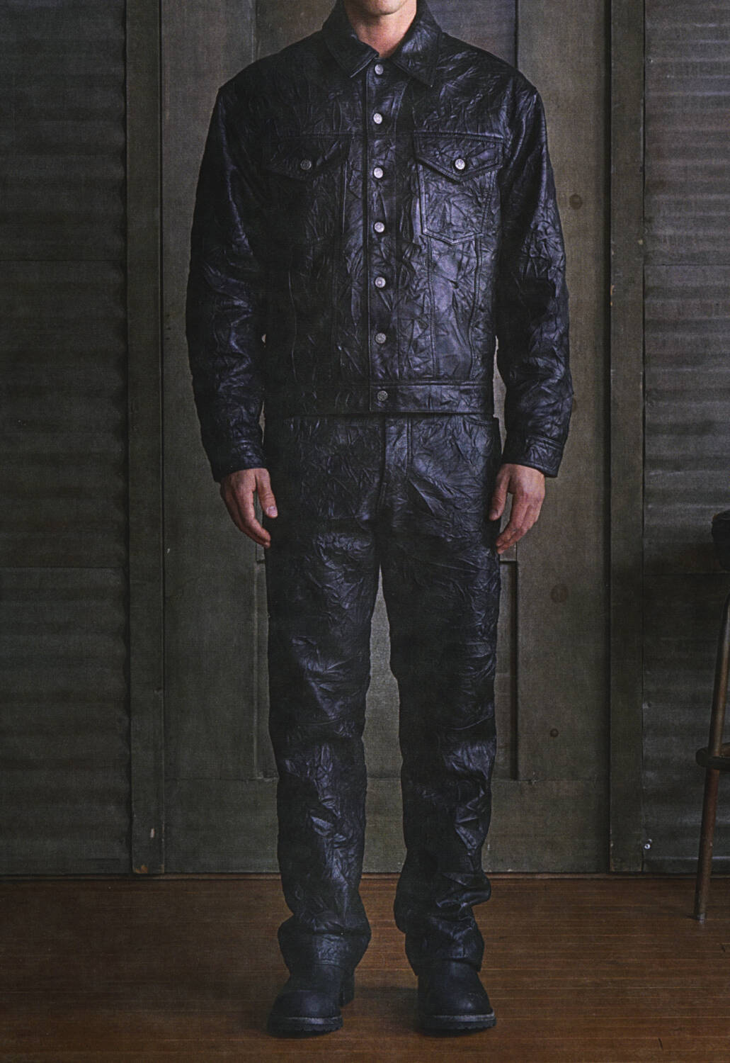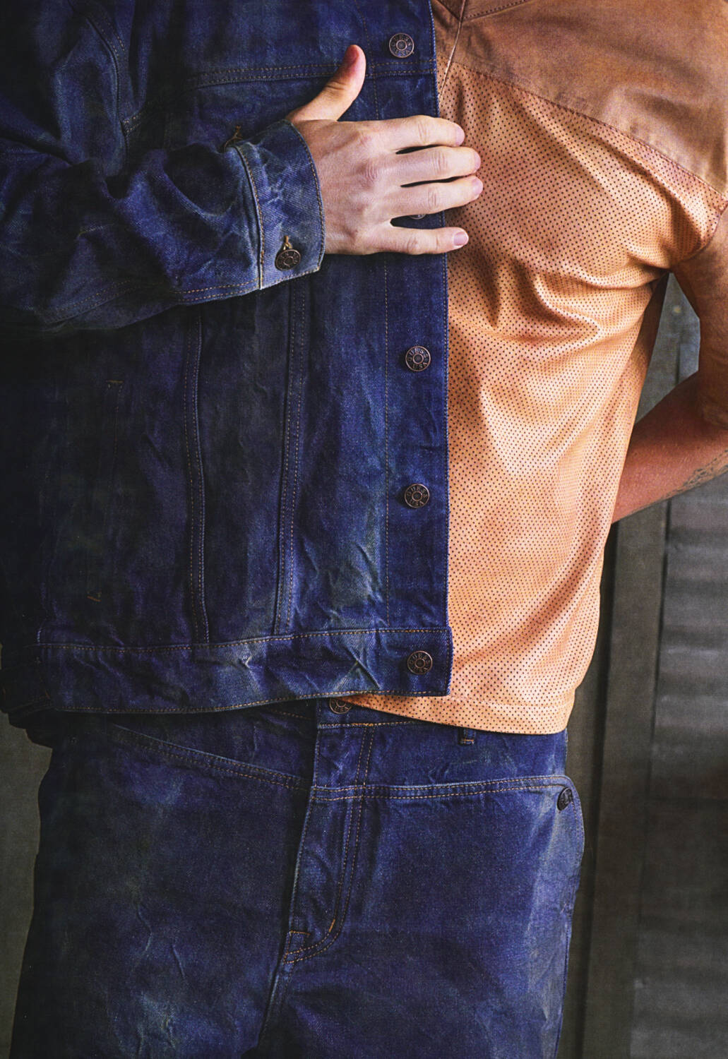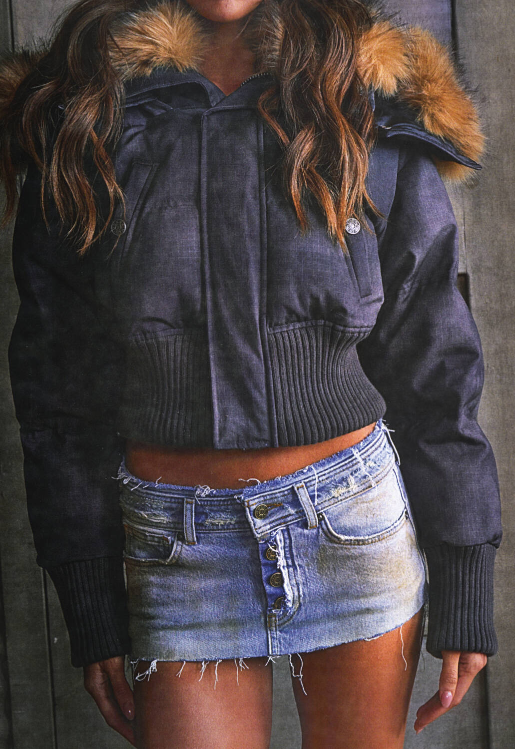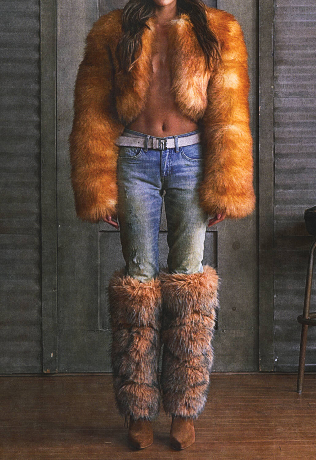 Faux fur takes centre stage, turning up the drama with gold-tinted boleros, patchworked animal-print bombers and a Penny Lane-inspired shearling jacket that wraps you up like your favourite roadie. Crinkled leather – straight from the Guess archives – is reimagined on long trenches, trucker jackets and micro miniskirts, giving off a perfectly dishevelled ‘I woke up like this’ feel. Meanwhile, baggy oil spill-dyed jeans and burnt-effect patchwork denim play dirty in the best way.