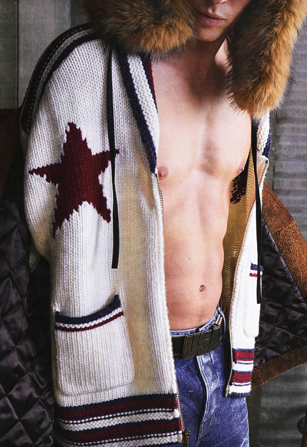 Distressed knitwear is delightfully trashed – think chewed-up cable knits and a black hand-knit dress cinched with a scuffed ‘USA’ logo belt. Accessories carry the same rebellious spirit: shearling-trimmed Claudia bags, oversized studded Buckle totes and cowboy boots that stomp straight out of the early 2000s.
