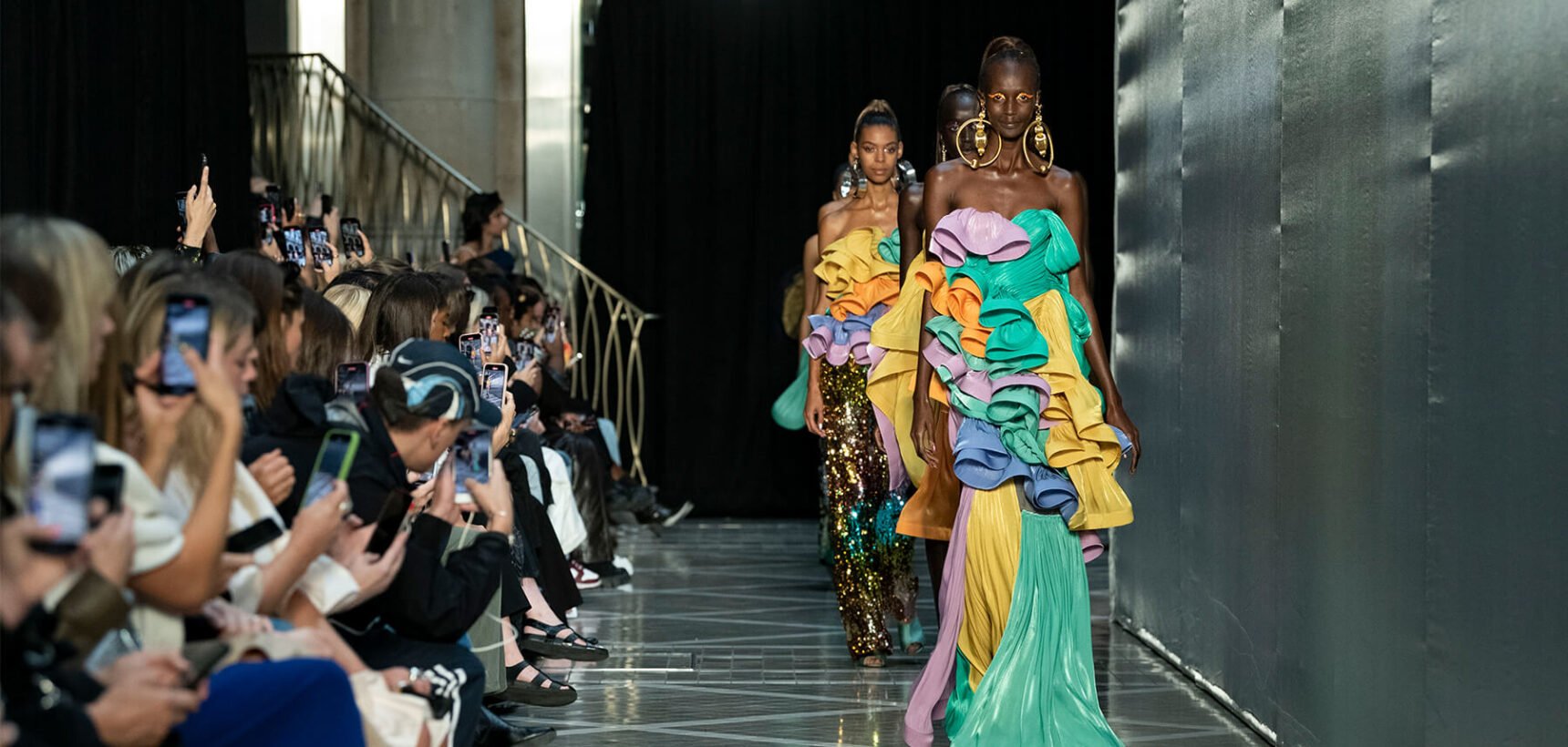 Halpern took his mother’s print of choice and fashioned it in velvet, dressing up a variety of frock silhouettes beloved by his loyal troupe of buyers. He also used velvet to elegantly drape an azure-hued, celestial constellation gown around a model with the ease of a dressing gown and wrapped swaths of candy-coloured fabric together which burst into a garden of rainbow ruffles on one standout look – all anchored by OTT hoop earrings.