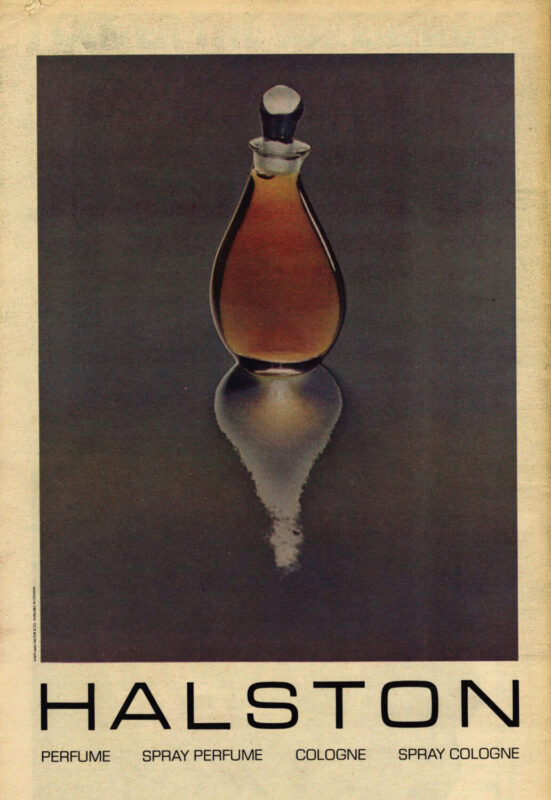 In 1973, Halston was the golden boy of American fashion. His companies generated $30 million plus in retail. That year, he sold his name to the firm Norton Simon Industries for dollars and stock options. Its first move was to make a fragrance. Before this, Halston said, everyone (Chanel, Arden, Revlon, Palmolive) had been asking for a perfume. But the deal was never right. If you read Steven Gaines’s 1991 biography Simply Halston it’s clear that, in those days, he was a workaholic. That was how he approached his fashion and how he dealt with his entrée into perfume. He spent two months sniffing oils, learning to discriminate smells. Involved in every aspect of his perfume, he had final say on advertising, ad copy and packaging, even specifying the cardboard and cellophane to be used.
