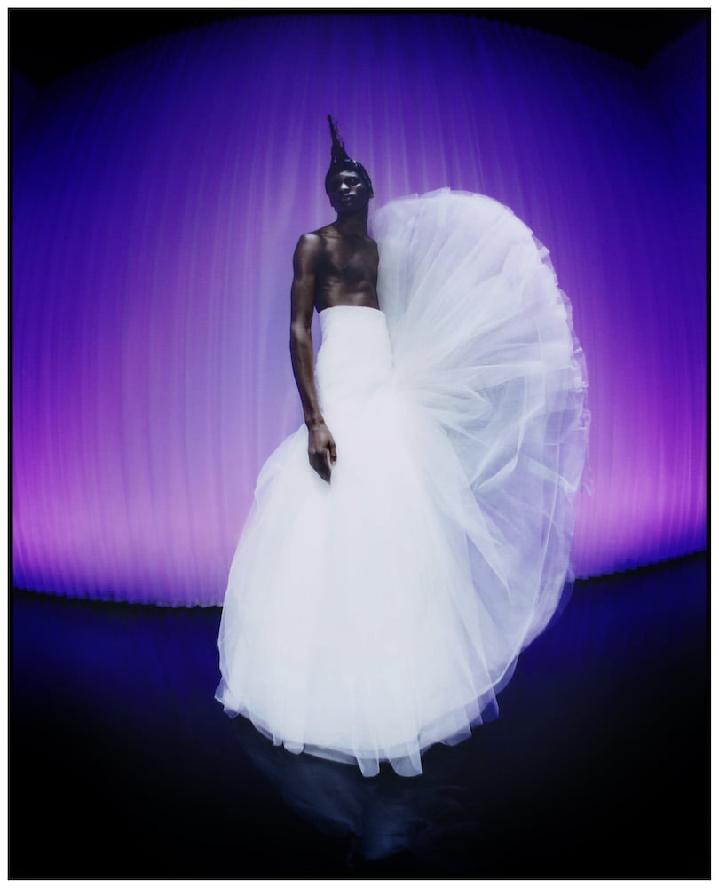 Whilst his vision for the collection began light and ethereal, lockdown confinement caused Reed to begin feeling outraged, rebellious even. He turned his eye to the anarchy of London’s punk movement, hand spray-painting meters-upon-meters of tulle which seeps from sublime tailoring and demi-couture gowns. The look is completed with 18cm platforms made in collaboration with Roker and elaborate peacock-plumed headpieces by milliner Vivienne Lake, inspired by punk mohawks.