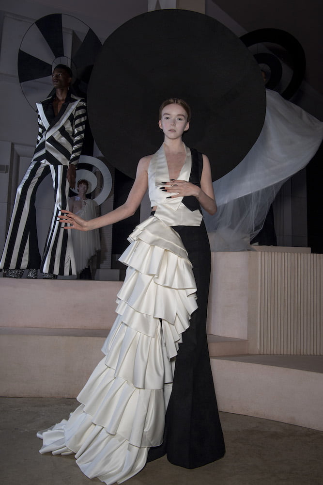The sun began to set on London Fashion Week and Harris Reed ensured it went out with a WOW. Taking over The Serpentine Pavilion, his back-lit models stood on concrete plinths designed by the architect Sumayya Vally. Reed had dressed them in elongated, demi-couture looks made from up-cycled Oxfam wedding dresses and morning suits. The lights rose and Kelsey Lu walked out in an enormous cloud of white tulle. Her sublime voice filled the space as Reed’s silent choir of models looked on like fashion saints, crowned with his enormous halo headwear.
