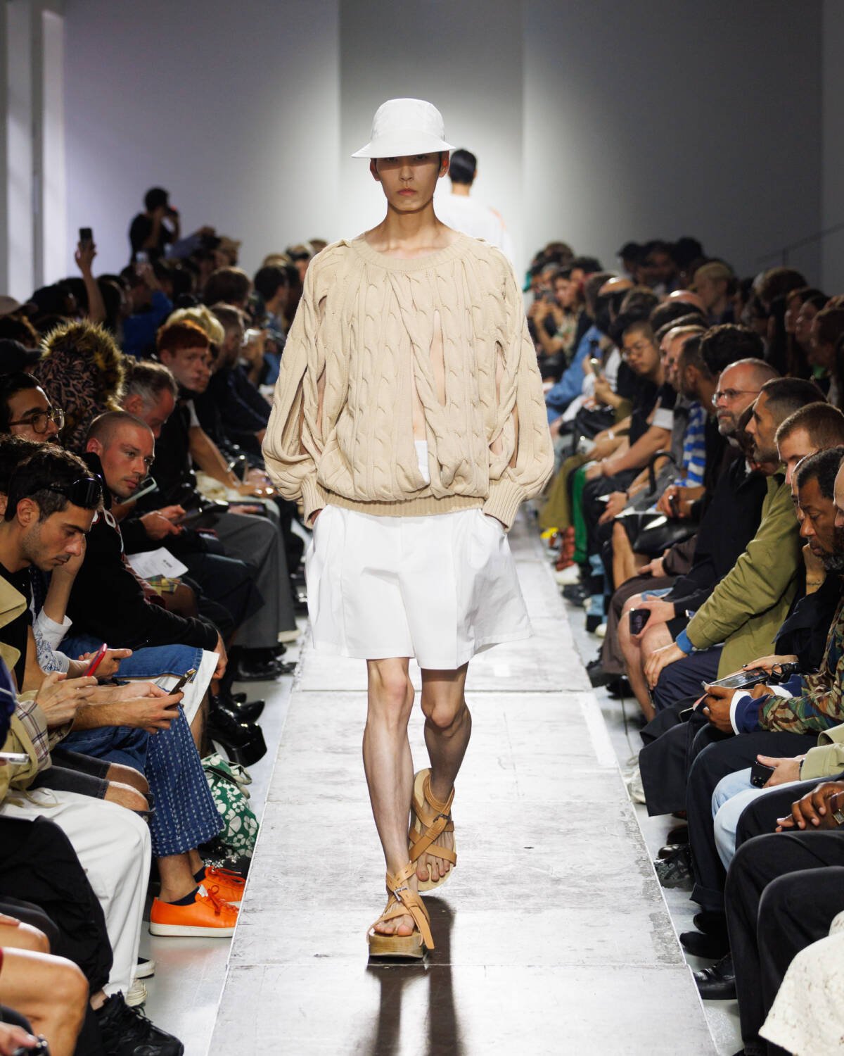 Focusing distinctly on textiles, Mayner allowed the materials to speak for themselves, featuring an assortment of finishes to emphasise dimension and nuance. Coated and uncoated, shiny and matte, layered and zipped; Mayner used the details of each piece to perfectly toe the line between experimental yet understated. Innovation was present in the patterns Mayner used too, with a slashed cable knit used almost as a guide for air across the skin. Shirts were unconventional, imbued with pleats, belts and back-to-front shaping to modernise the traditional.
