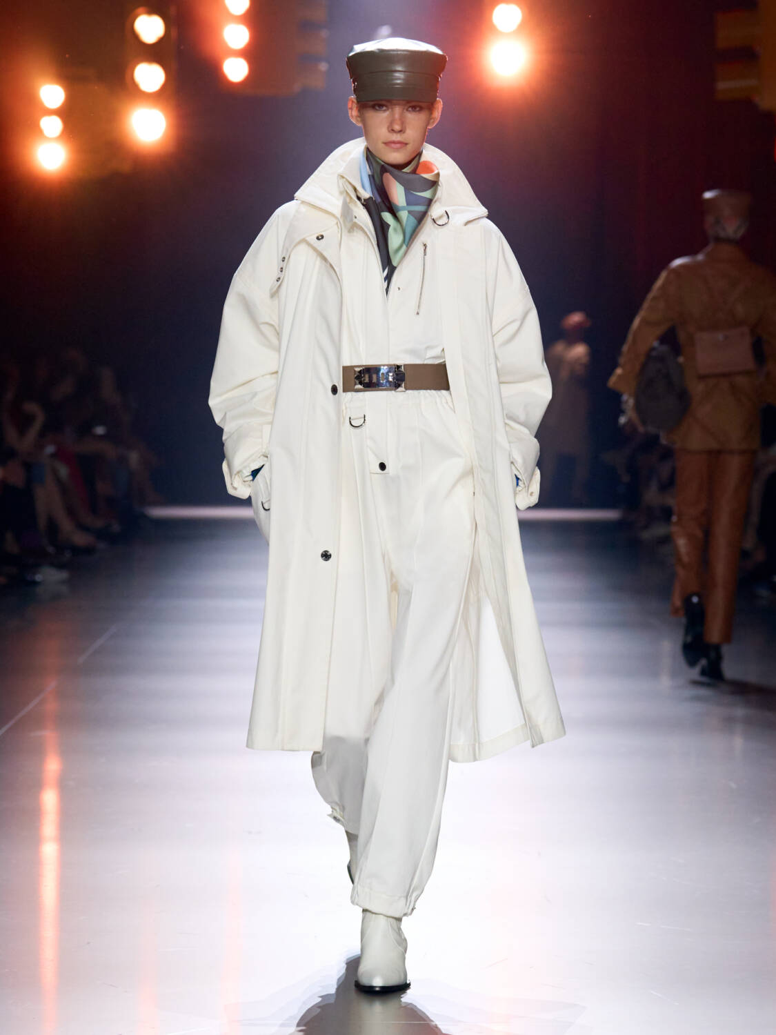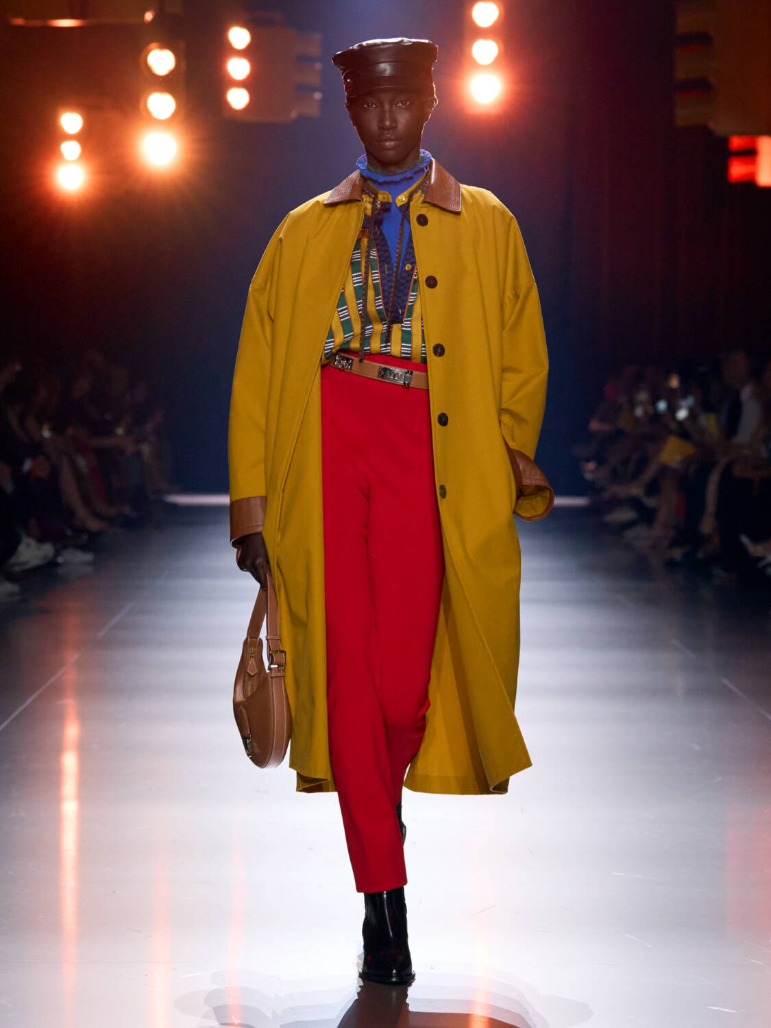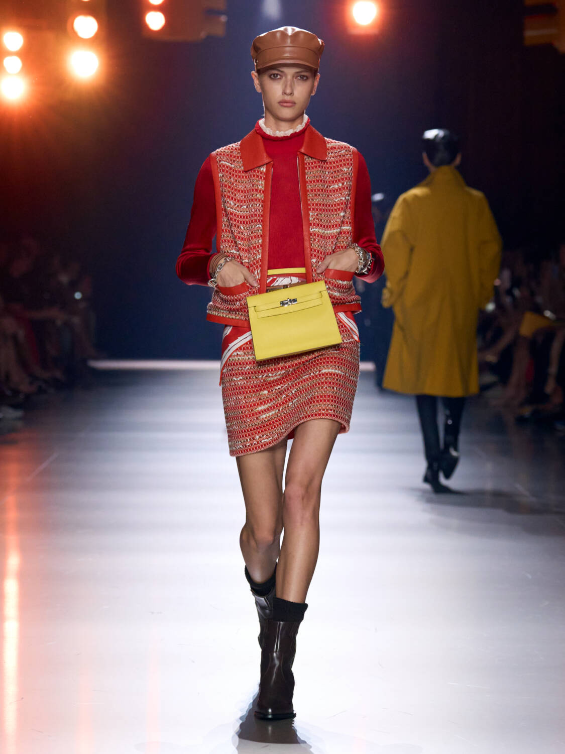 Of course, this being Hermès, all eyes were on the accessories. Looks dripped with leather accents, whether in the form of cuffs or belts but the biggest statement were the flat mariner caps. The headwear might be a very Parisian accessory but looked equally at home worn with equestrian-inspired ensembles as it did nautical outerwear. Bold printed scarves, another signature, were wrapped around the waists and necks. True fans will be quick to eye the handbags, namely a bright yellow Kelly worn as a waist bag as well as plenty of Arçon hobos. Expect those to be among the most sought out among by their most devoted clientele in the upcoming year.