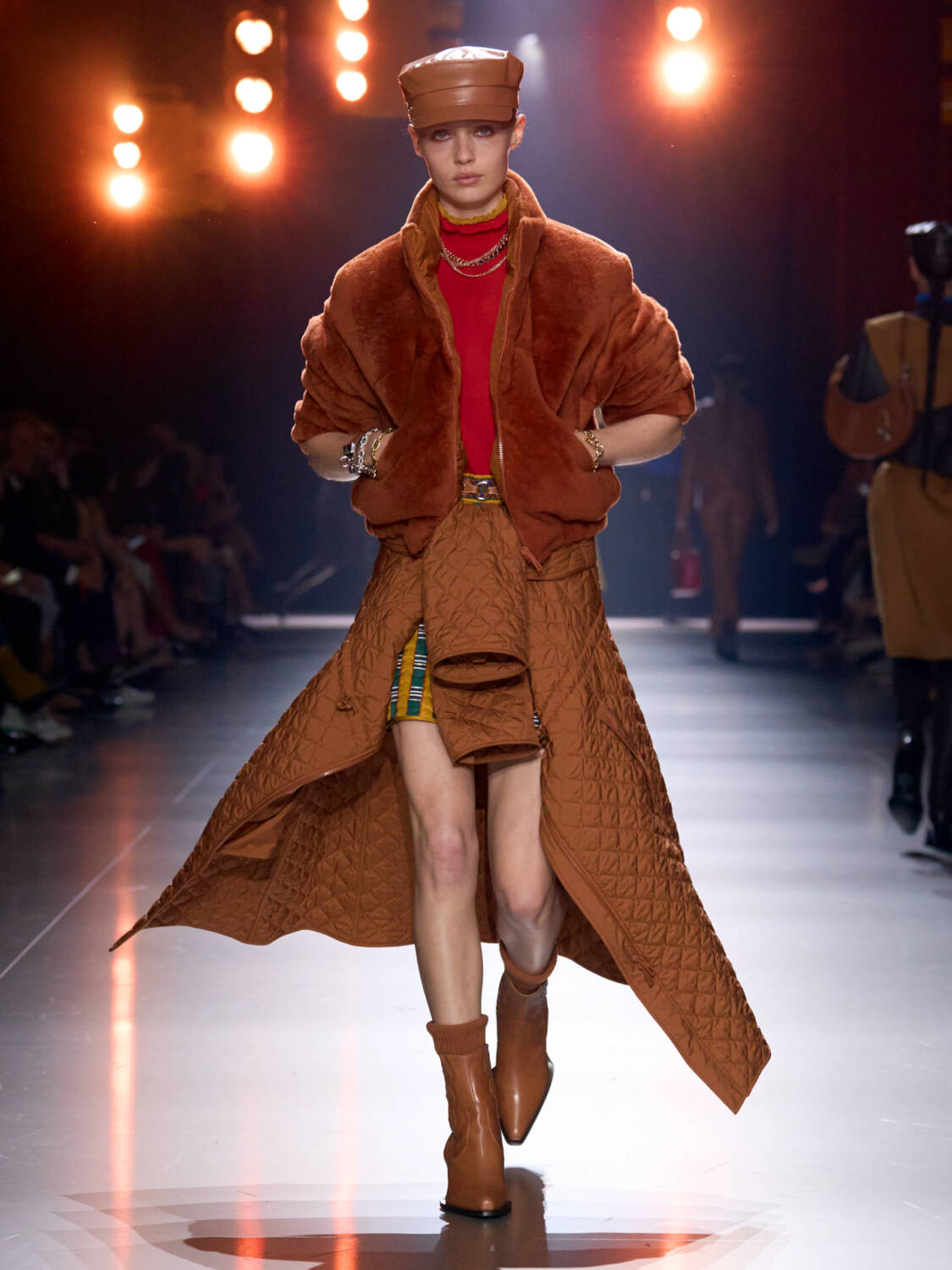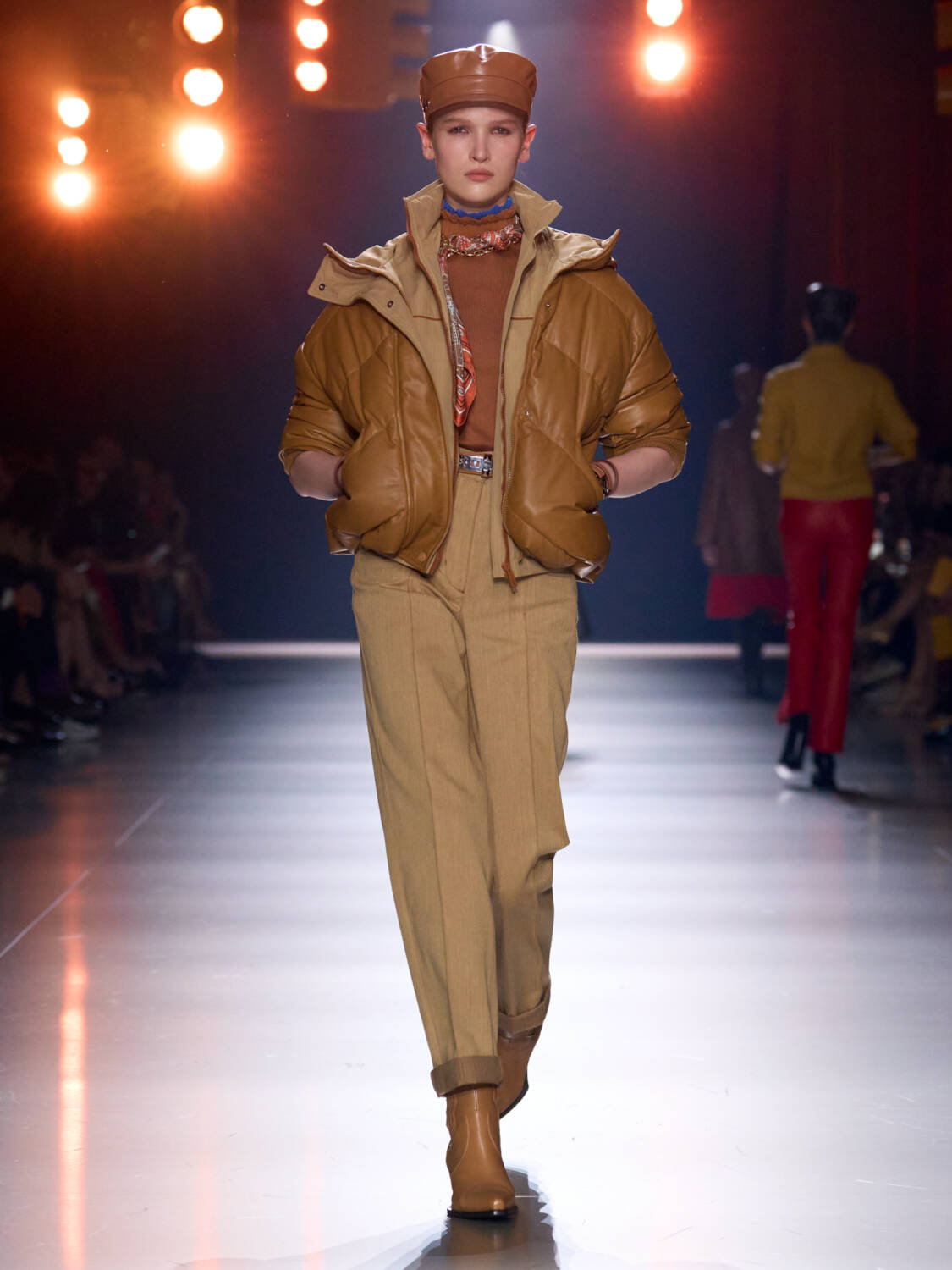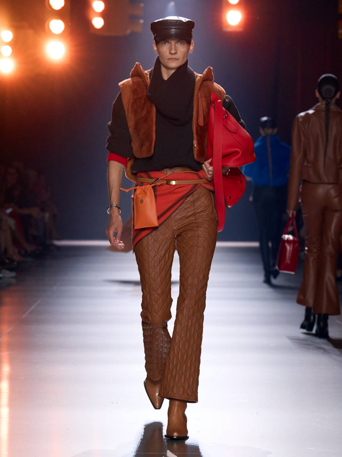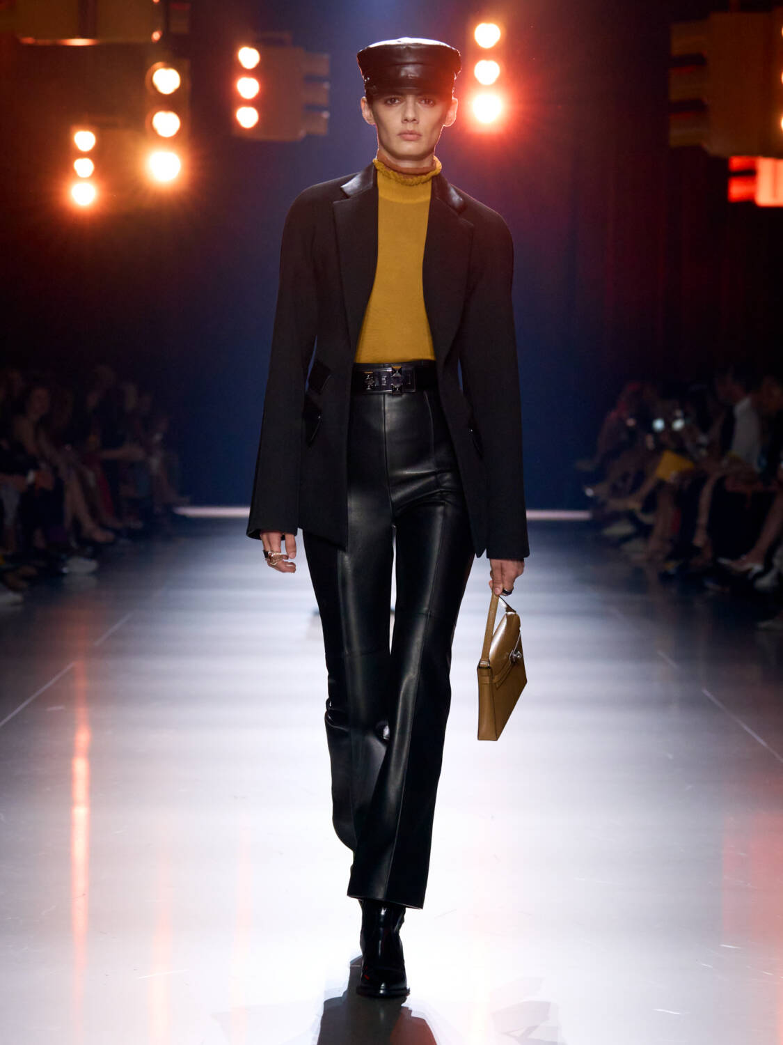 Of course, this being Hermès, all eyes were on the accessories. Looks dripped with leather accents, whether in the form of cuffs or belts but the biggest statement were the flat mariner caps. The headwear might be a very Parisian accessory but looked equally at home worn with equestrian-inspired ensembles as it did nautical outerwear. Bold printed scarves, another signature, were wrapped around the waists and necks. True fans will be quick to eye the handbags, namely a bright yellow Kelly worn as a waist bag as well as plenty of Arçon hobos. Expect those to be among the most sought out among by their most devoted clientele in the upcoming year.