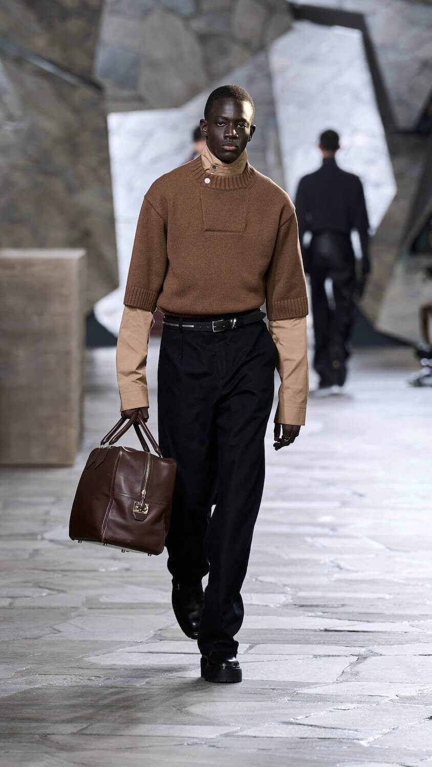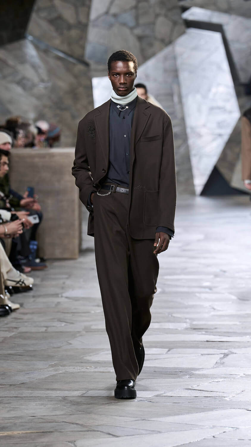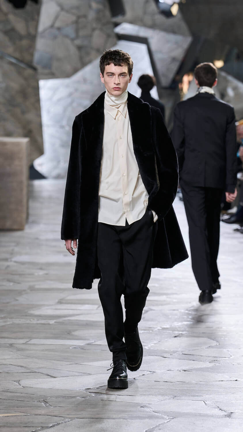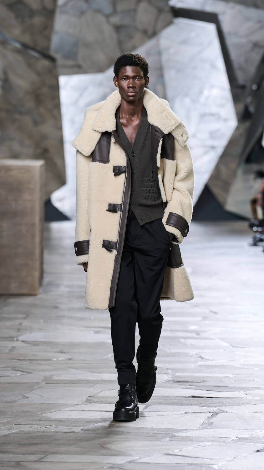 In a palette described as “gravier, aquarium and fog”, Nichanian proposed ways in which the essential components of our wardrobes can be zhuzhed up but done through a whisper, not a shout. Whether that translates to fuzzy duffle coats, buttery blousons, cleverly stitched Irish cable knits, or donkey jackets accented with leather patches, each season she skips the faff and lets her clothing speak for itself. When you’re as talented as someone like Nichanian, gimmicks are redundant.