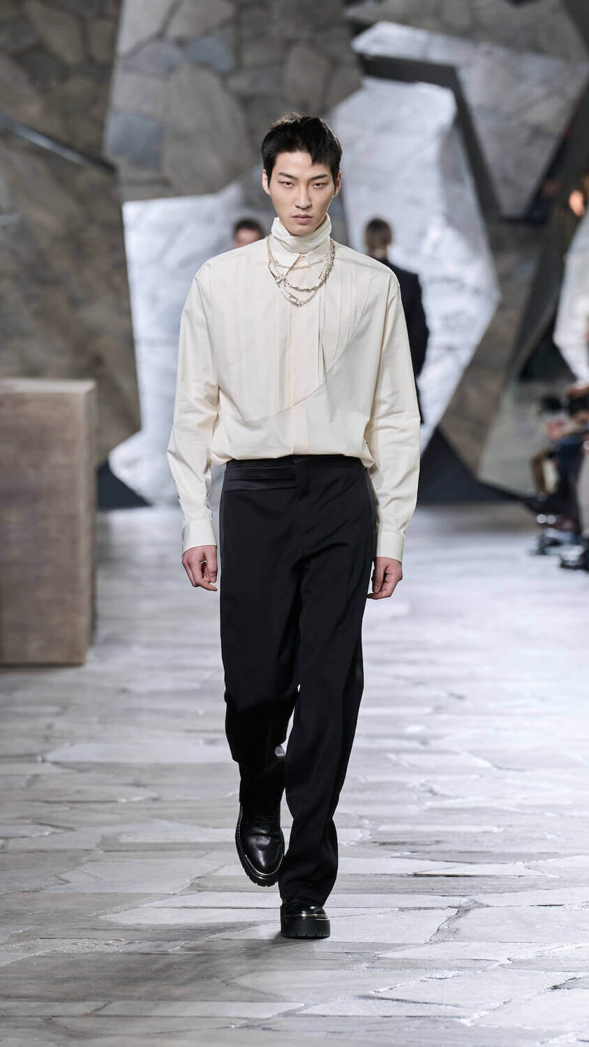 Taking place inside the UNESCO building, she described her latest outing as “sweet and sharp”, where proportions were tweaked and abbreviated to usher in a subtle, sensual edge. Like leather trousers which were cut wide or pulled tight – earlier that morning at Loewe, Jonathan Anderson said that simply wearing the material forces you to “have an attitude” – or cropped jackets that reveal a slither of the silky shirt worn underneath.