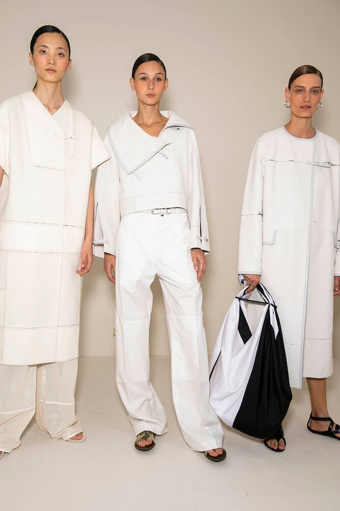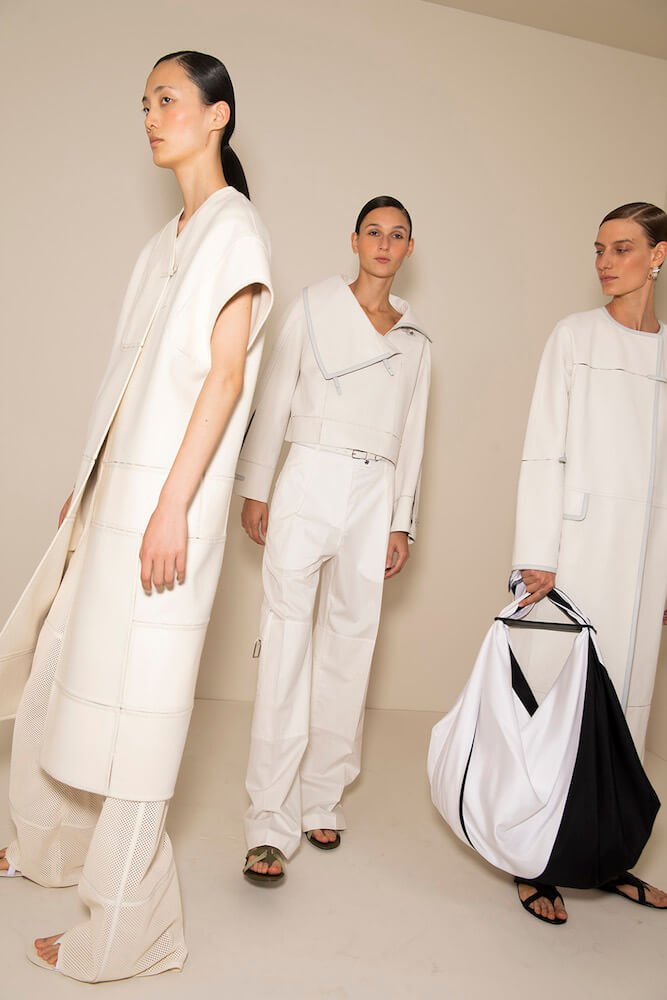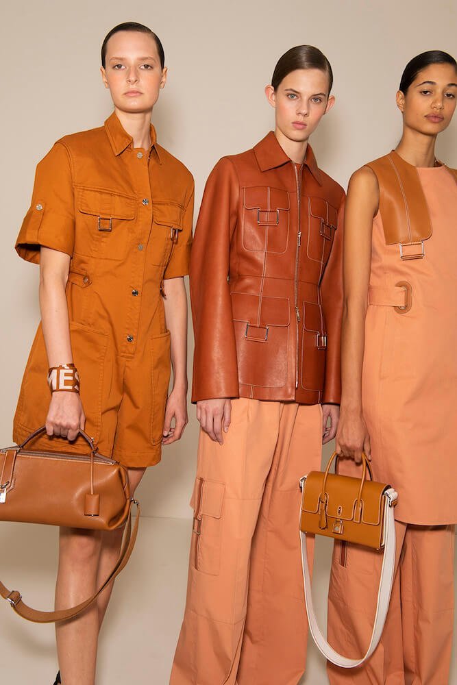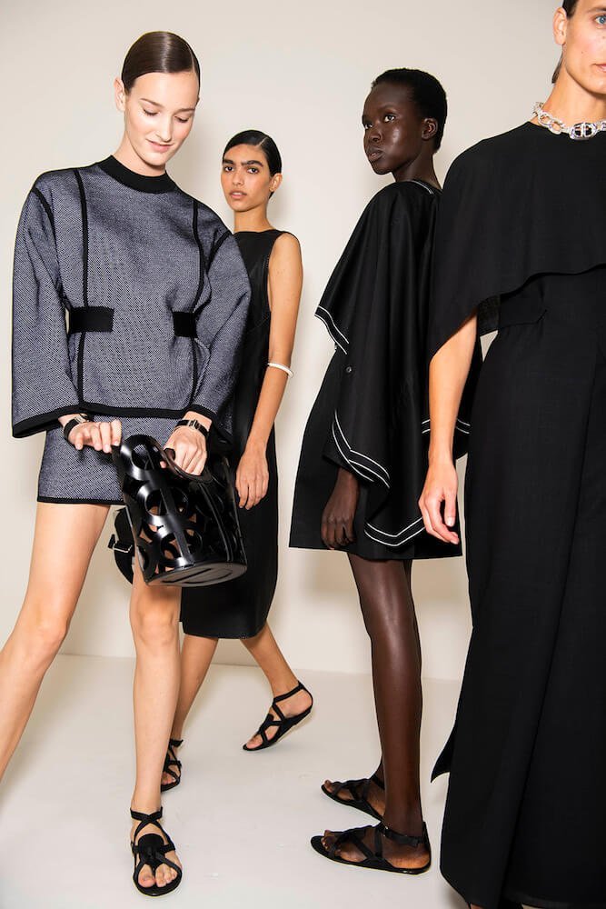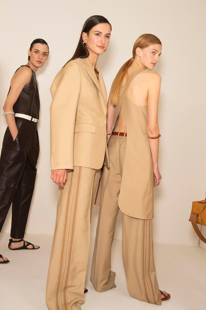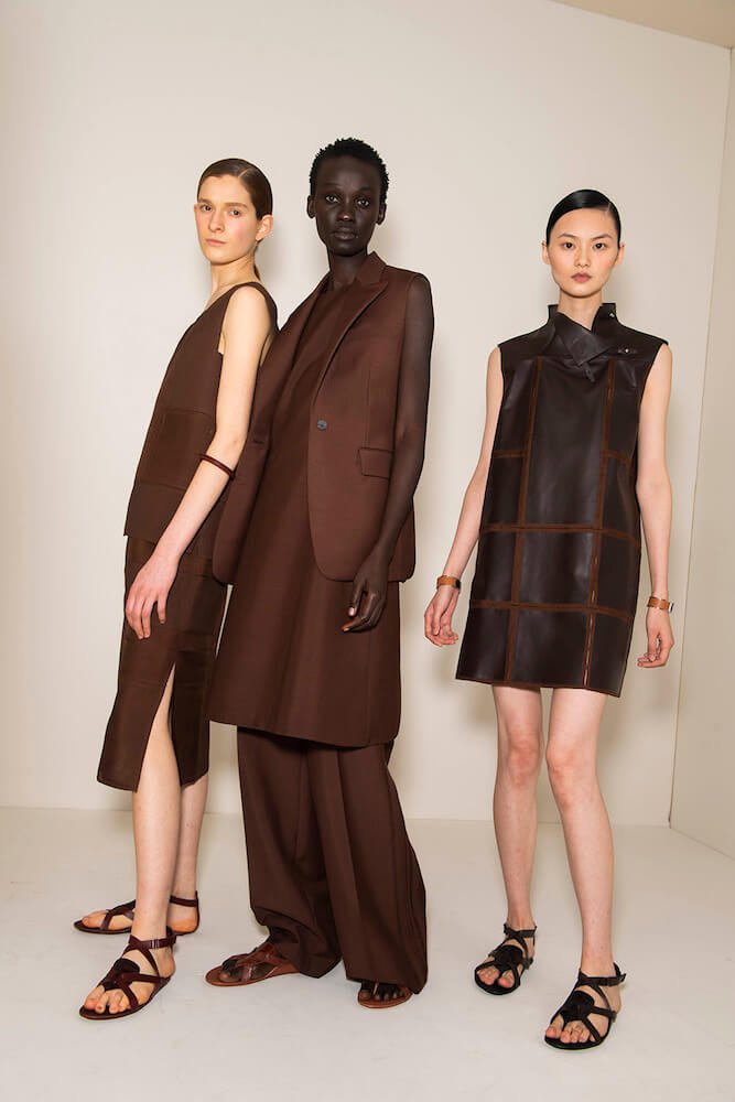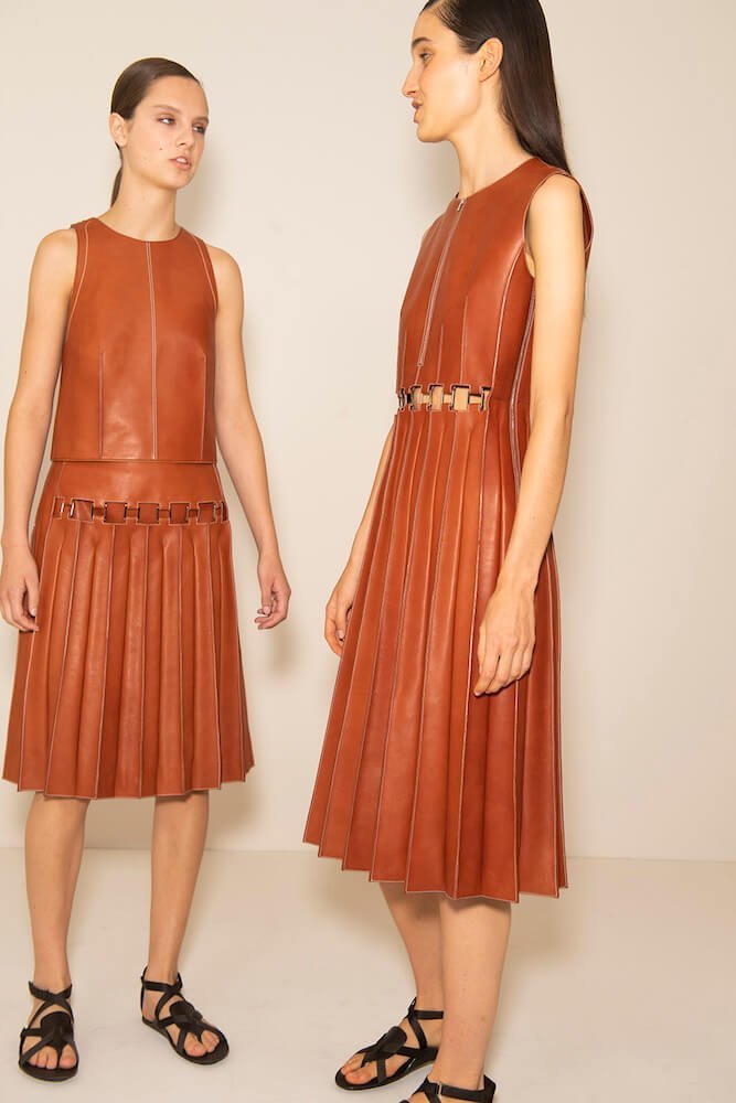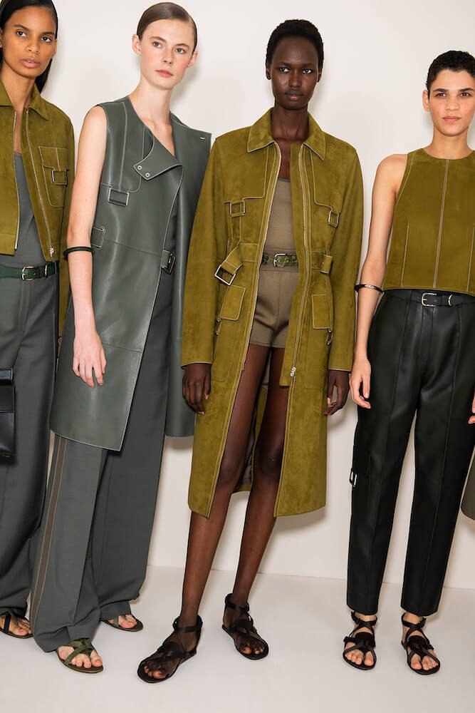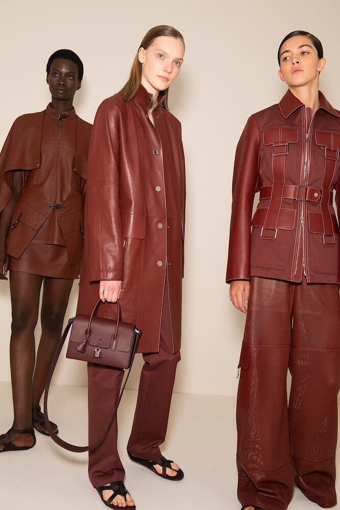 Nadège Vanhee-Cybulski’s show notes talked about replacing a quest for perfection with a quest for movement and her collection was full of supple pieces crafted for an active life. Utility and workwear played a big part. The aprons worn by Hermès craftspeople in their ateliers inspired leather apron dresses and vests cut away at the back to reveal bare skin. Leather utility trousers had perforated sections and shortie overalls and suede shirts sported metal loops and pockets flaps associated with the saddlery heritage of the house. Leather is at the heart of Hermès, but it’s also making a play for timeless tailoring. The last look, a sleeveless tuxedo tunic was impeccable.