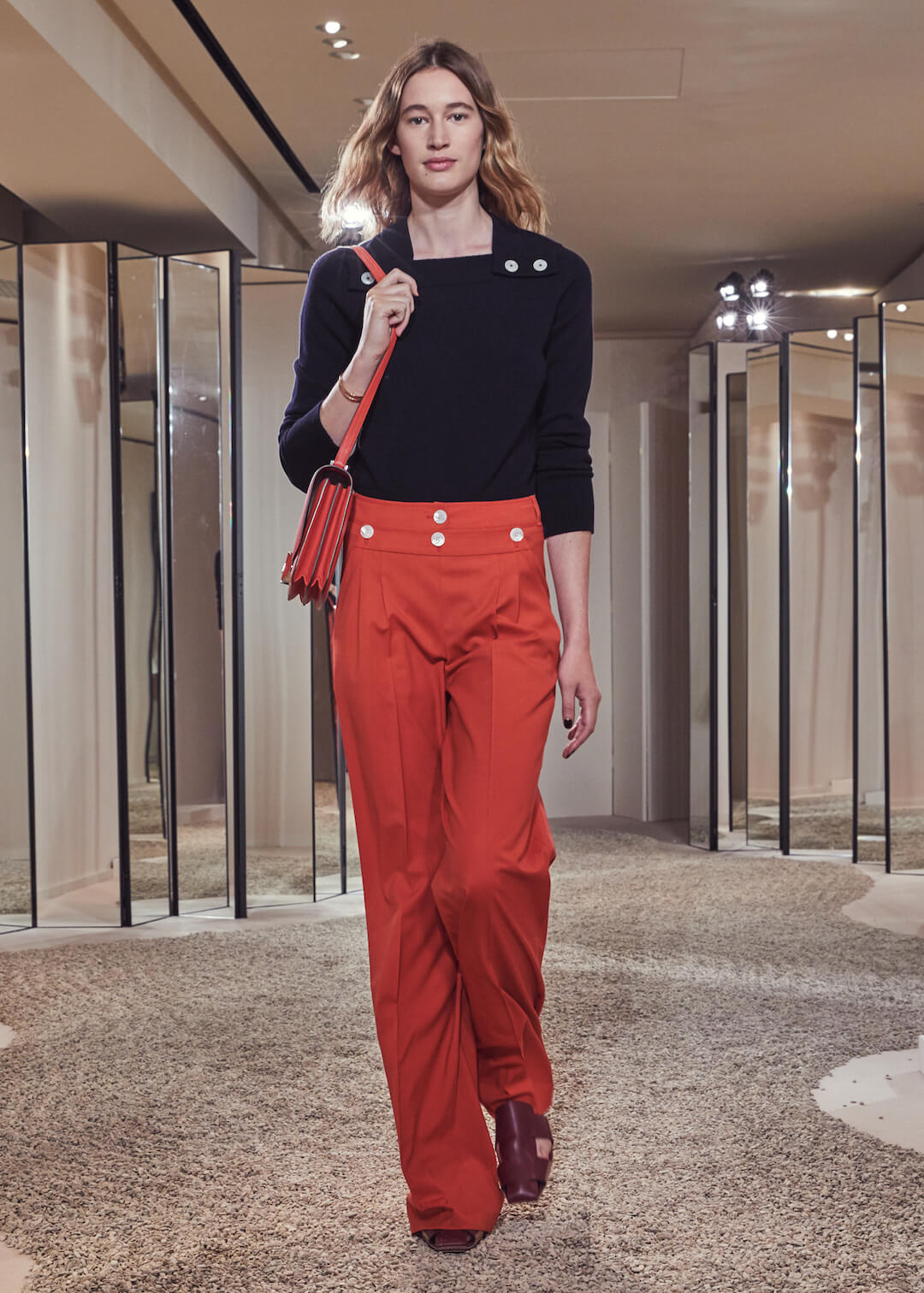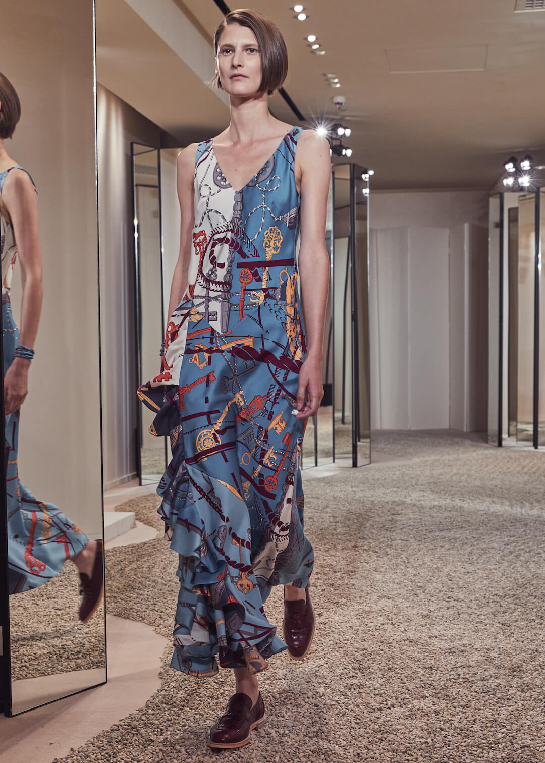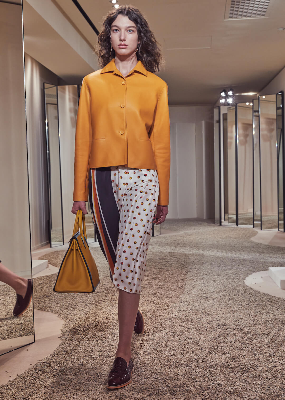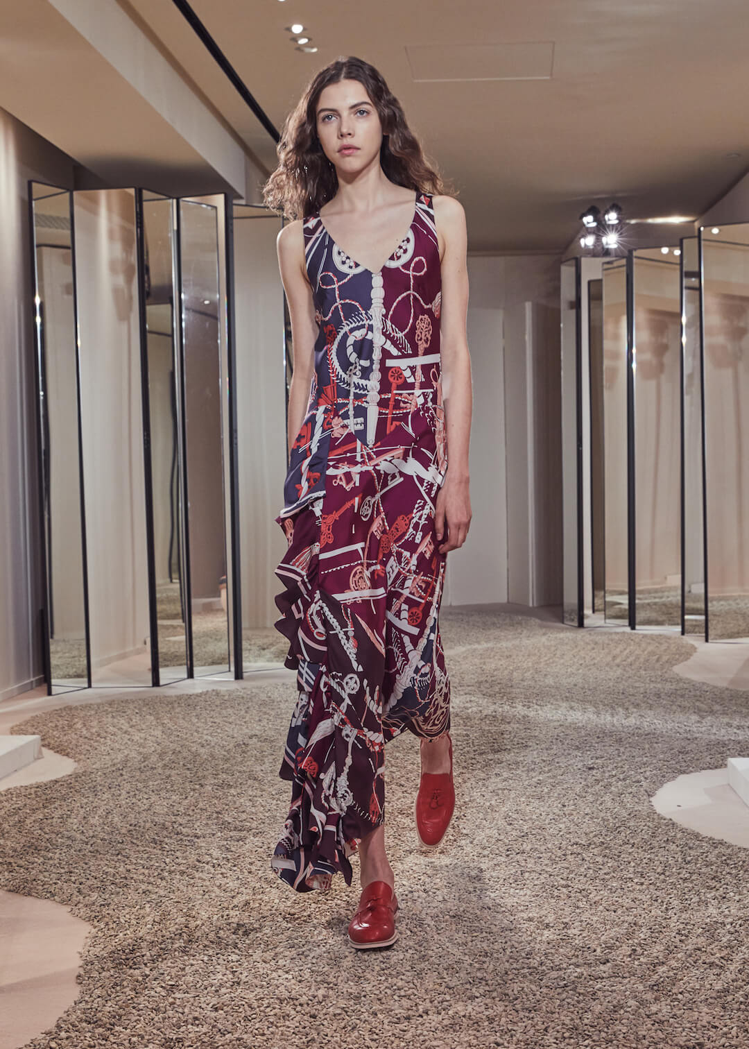 Hermés, can we count the ways that we love you? No, apparently, we have a word limit. And we’ve been told off for rambling. But it’s a lot. Can’t help but feel I am an Hermès woman born into a non-Hermès (poor) woman’s body. Today’s pre-collection took place in their store, which seems right – Hermès is about things to buy. There are ideas here – don’t get us wrong – the slinky, summery take on their silk scarf dress, scarves that also twisted round the girl’s waists, fresh touches of sportswear – top stitching and toggle fastenings – or those luminous Seventies swimsuits that fastened around the neck with rope. Garth was particularly fond of them. Said it was a moment. That all felt new.