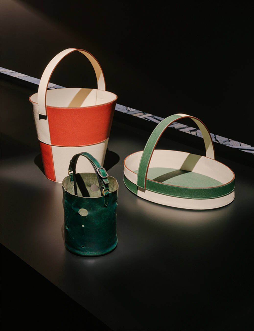 From left: leather buckets by Hermès; a Fendi Casa room set