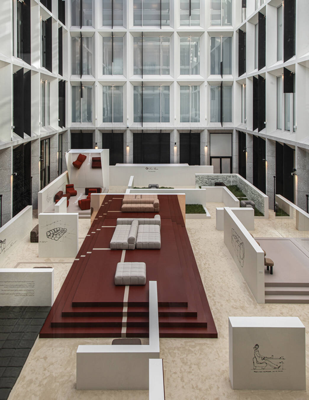 From left: Loro Piana’s tribute to the late Milanese designer and architect Cini Boeri, Faye Toogood presented her rug and sofa collaborations with Tacchini, CC-Tapis and Poltrona Frau