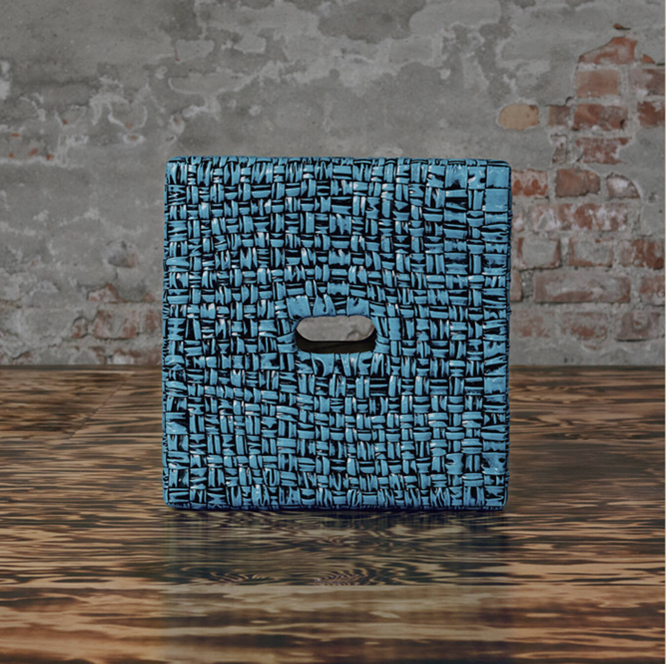 From left: the LC14 Tabouret Cabanon stool gets the Bottega Veneta intrecciato treatment; and a lamp from the Loewe Lights project