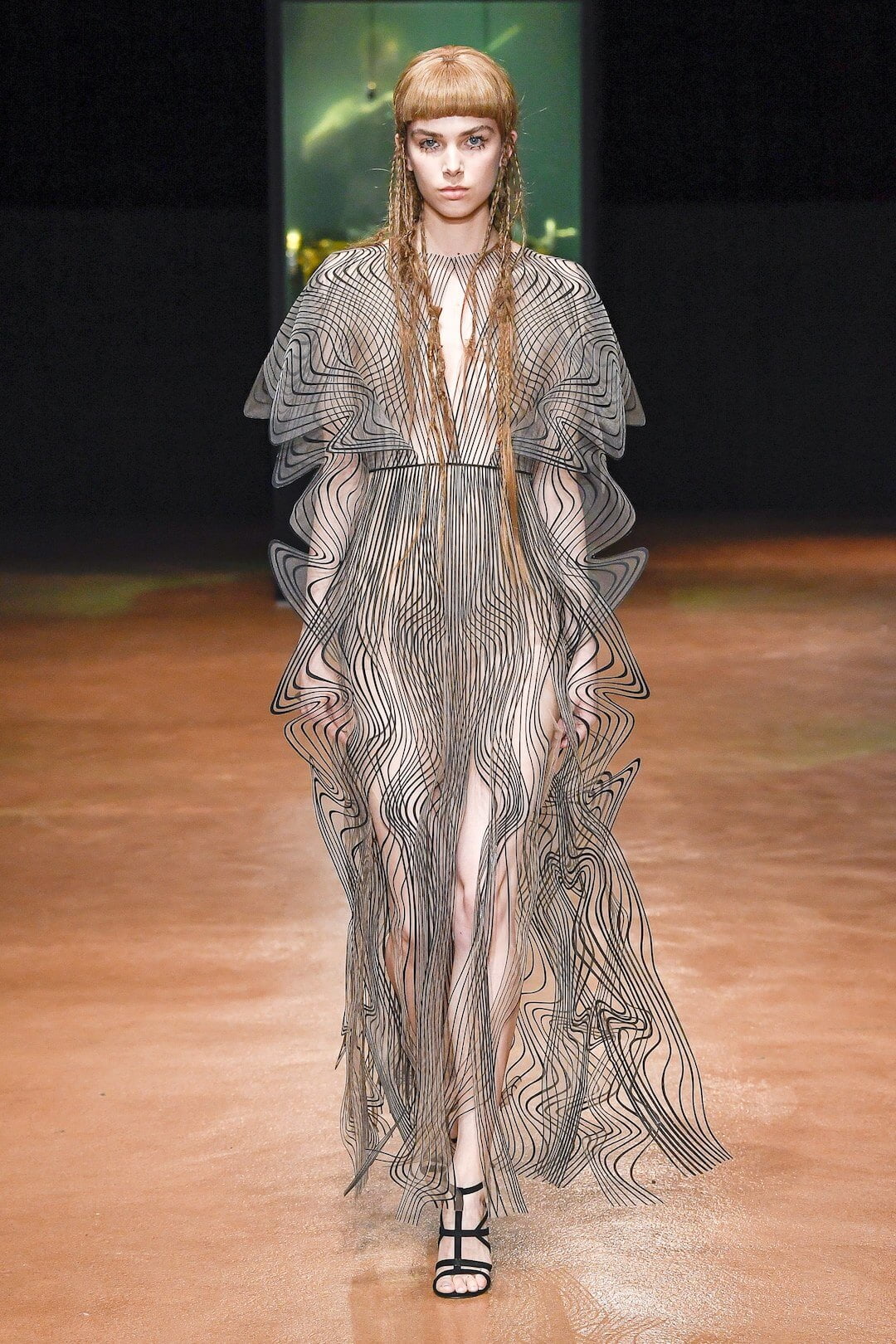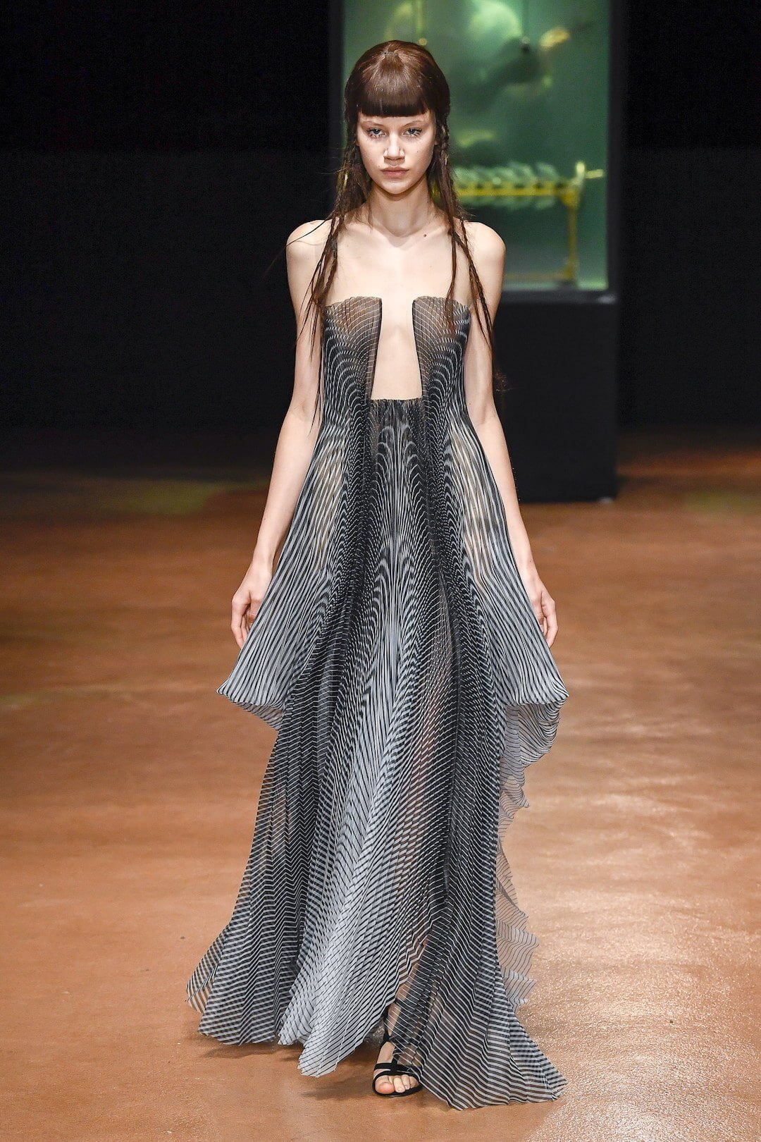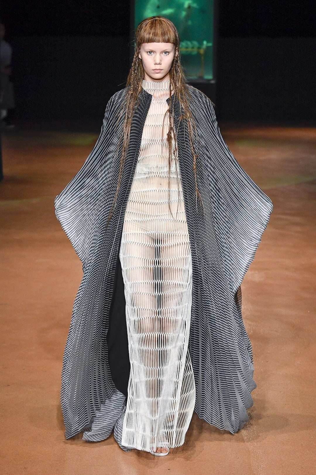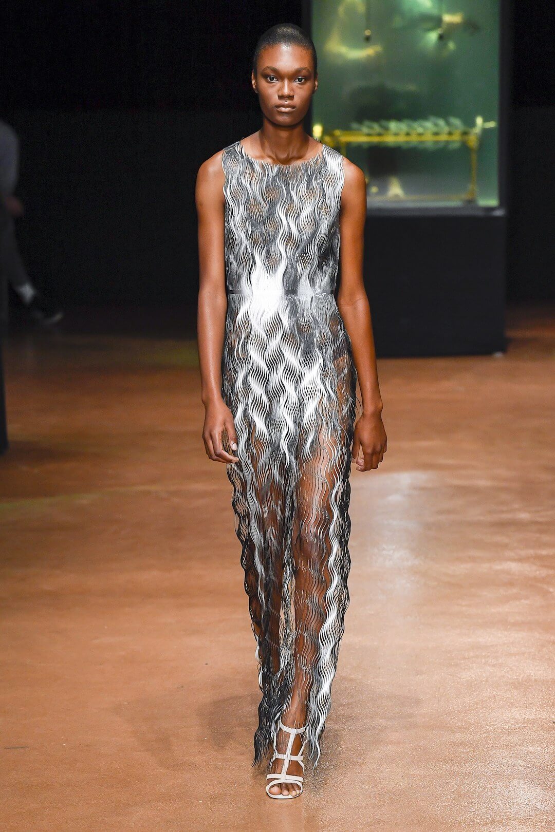We’re not usually lost for words, but it really was quite breathtaking. Clothes themselves were typically fascinated with the intersection of fashion, sculpture and technology – here looking at that through the filter of air and water – rippling patterns, sheer layering and these “biomorphic” gowns made from delicate, feather-light metal, mapping the surface of the model’s bodies. Iris spoke of the whole thing coming from first listening to Beyond Music’s work, saying: “it motivated me to dive into the contrasts between water and air, between outside and inside, between lightness and darkness.” Clothing for the futuristic fashion fiend. He’s to the next ten years.