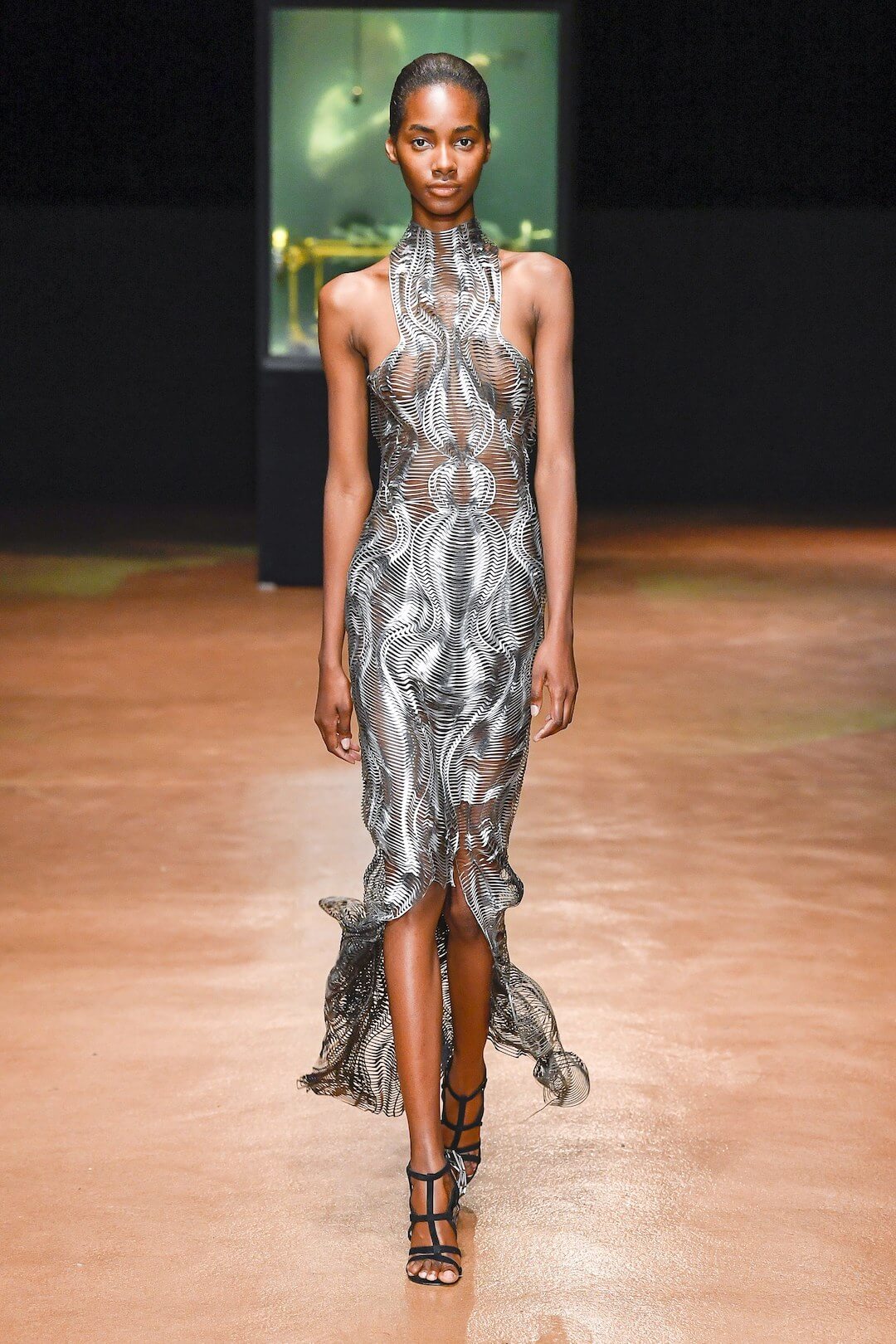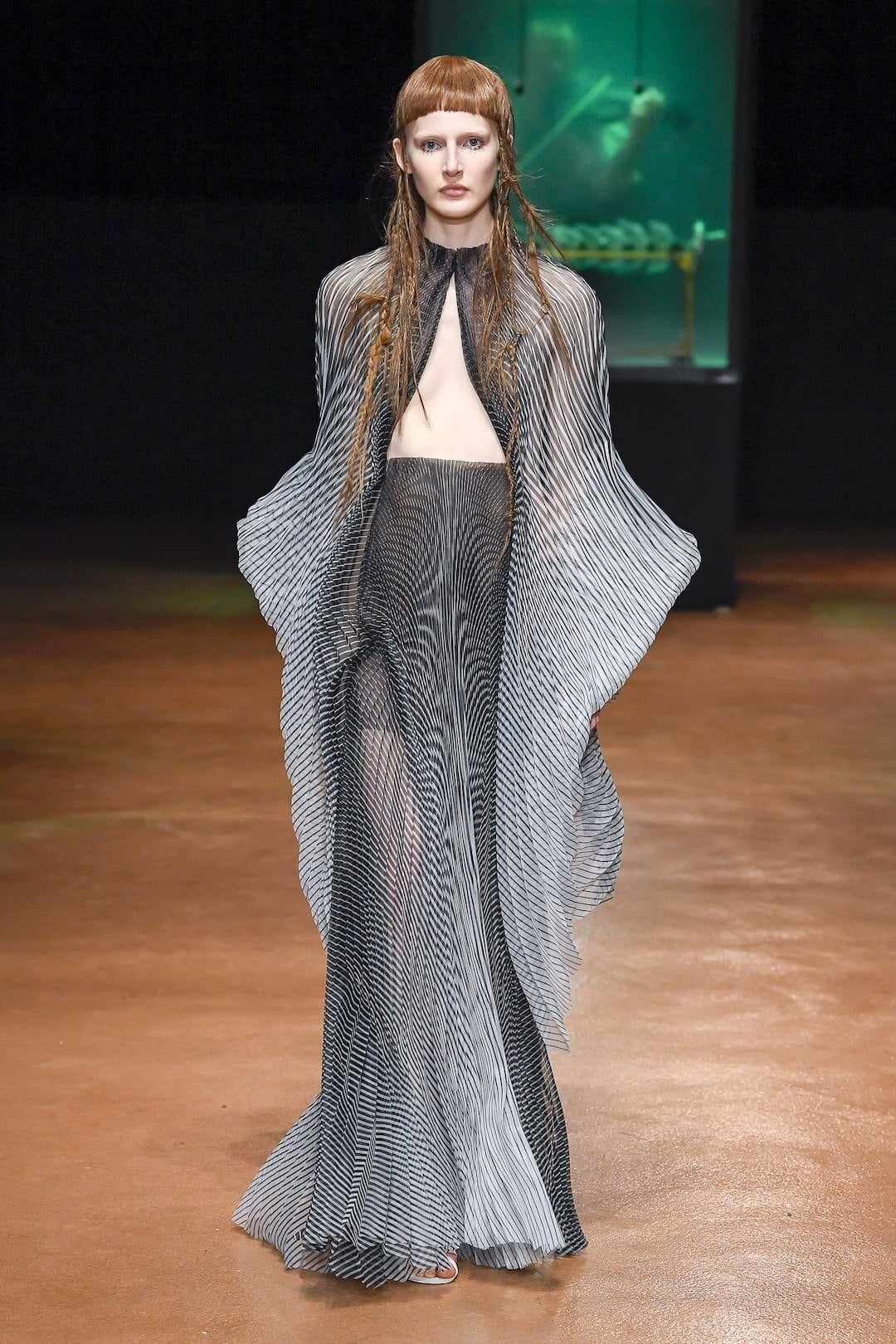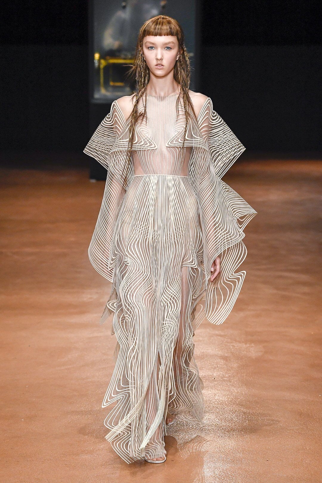 We’re not usually lost for words, but it really was quite breathtaking. Clothes themselves were typically fascinated with the intersection of fashion, sculpture and technology – here looking at that through the filter of air and water – rippling patterns, sheer layering and these “biomorphic” gowns made from delicate, feather-light metal, mapping the surface of the model’s bodies. Iris spoke of the whole thing coming from first listening to Beyond Music’s work, saying: “it motivated me to dive into the contrasts between water and air, between outside and inside, between lightness and darkness.” Clothing for the futuristic fashion fiend. He’s to the next ten years.
