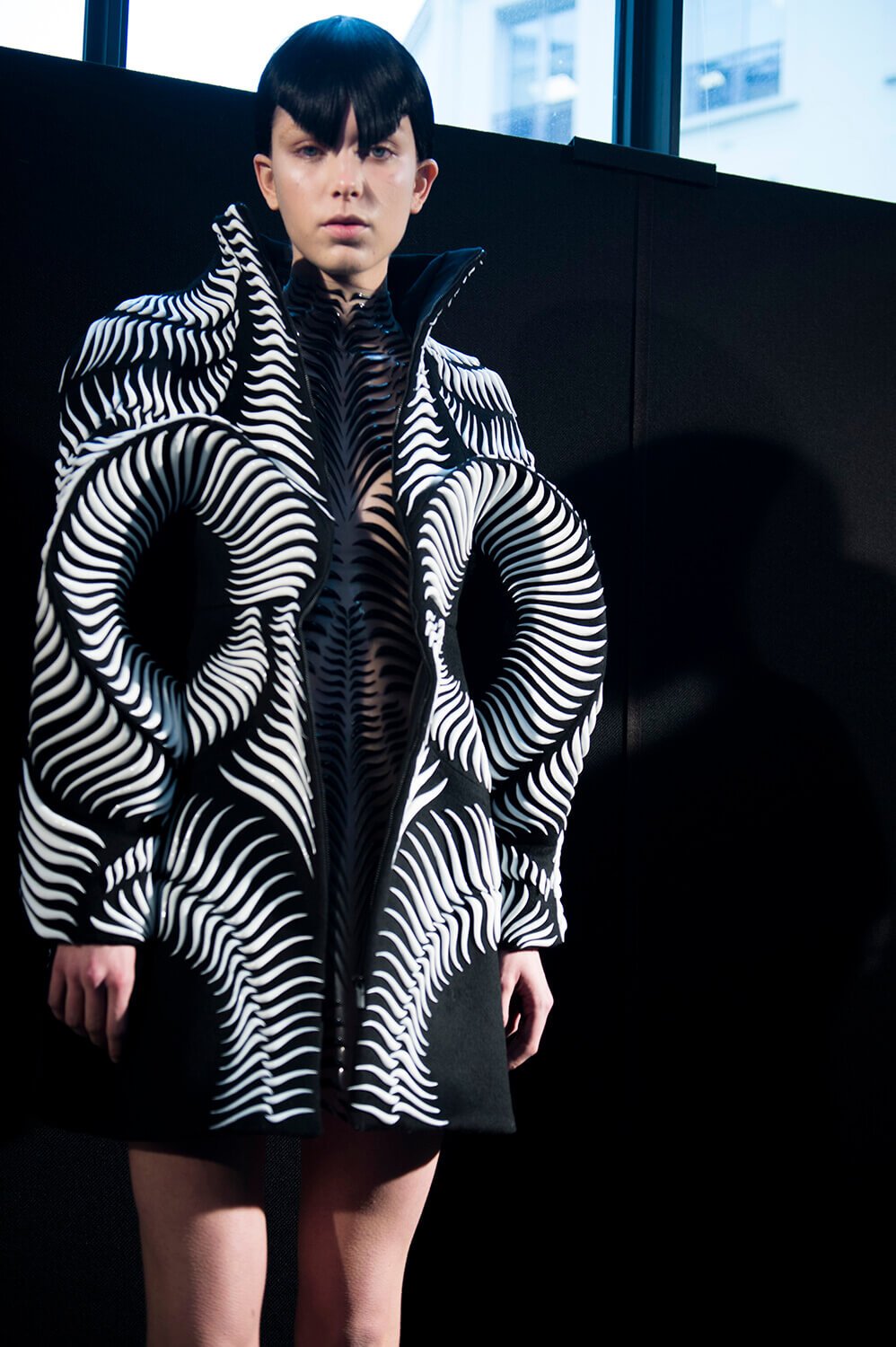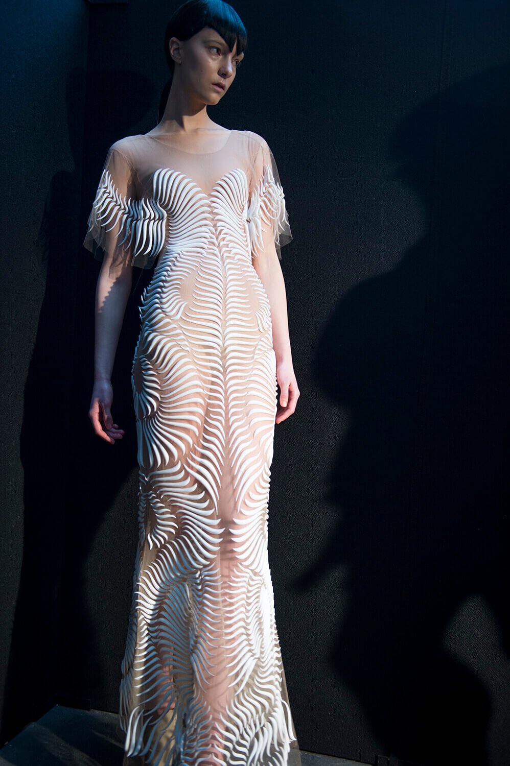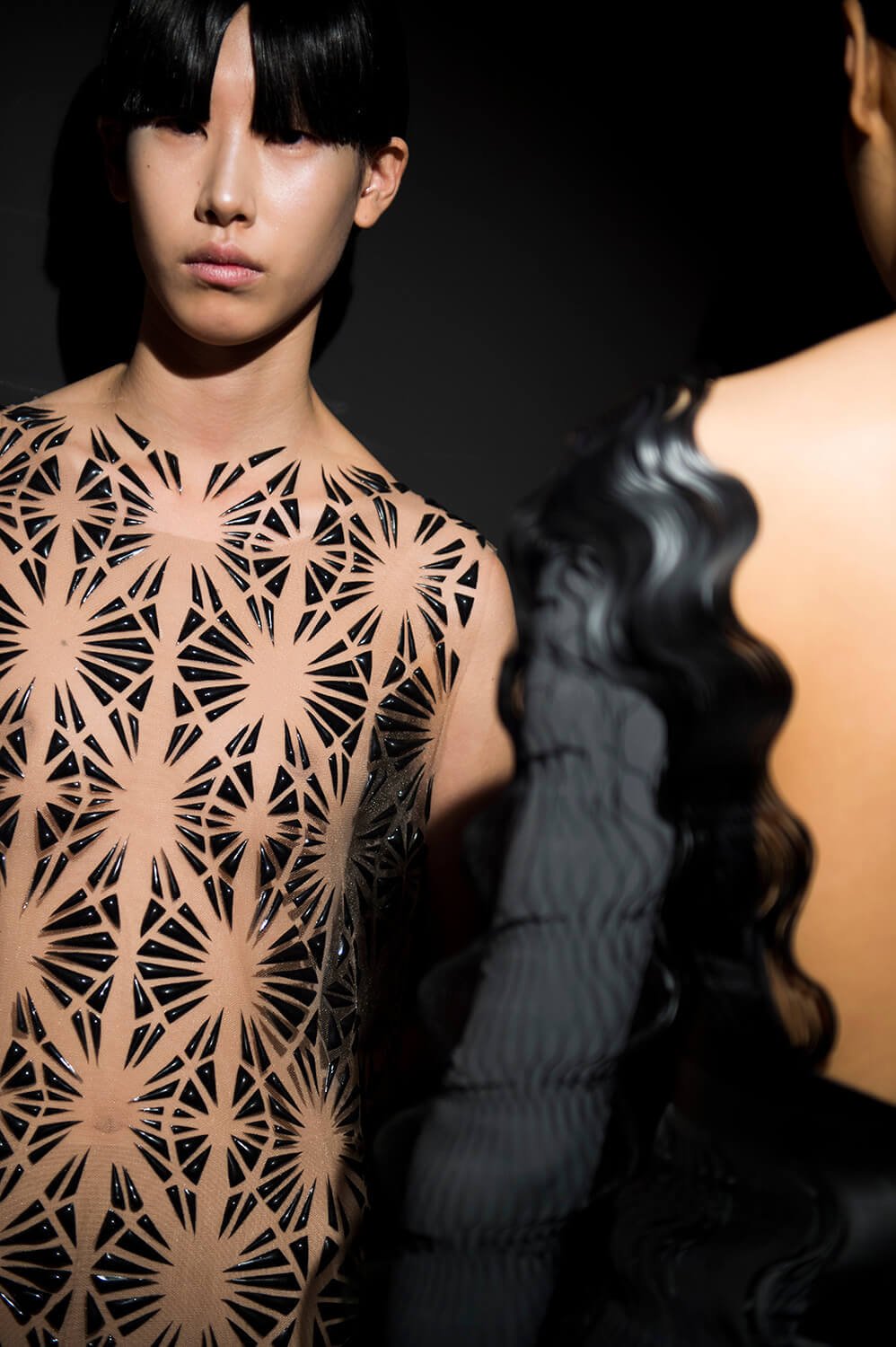 Made from processes we can’t quite understand (3D hand-casted PU fabrics and hand painted injection moulding? Huh?) so, with no time for a quick Wiki-tutorial, we shall instead enjoy Iris Van Herpen’s latest offering in a purely aesthetic way. Because this was, as Van Herpen is so adept, breathtaking fashions – clothing that looks as if it has been delivered to earth via space transportation, possibly from a distant utopia ruled entirely by powerful self-procreating women. Because this is a futuristic kind of beauty, instilled with a mythical power – clothes that make woman appear otherworldly, that almost live and breath – some layered like the back of an armadillo, others like they had been made from tiny droplets of water. Or those hypnotising, slinky-like curves. Final dress – a shimmering structure that looked something like a giant snowflake. Feels like we don’t even have a vocabulary for this. Clothing for the futuristic fashion fiend.