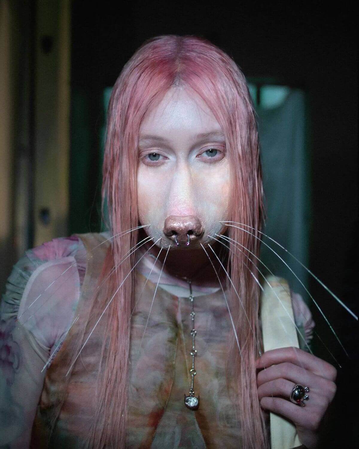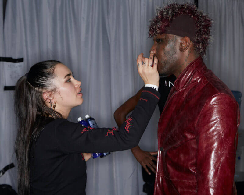 Isamaya Ffrench doing Yves Tumor’s makeup for Mowalola’s AW23 catwalk show