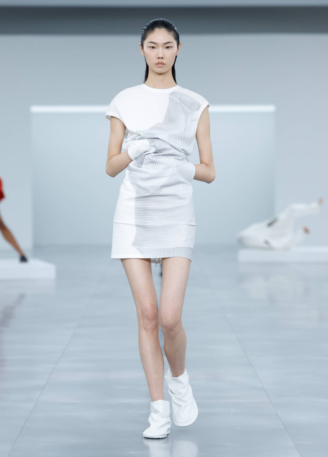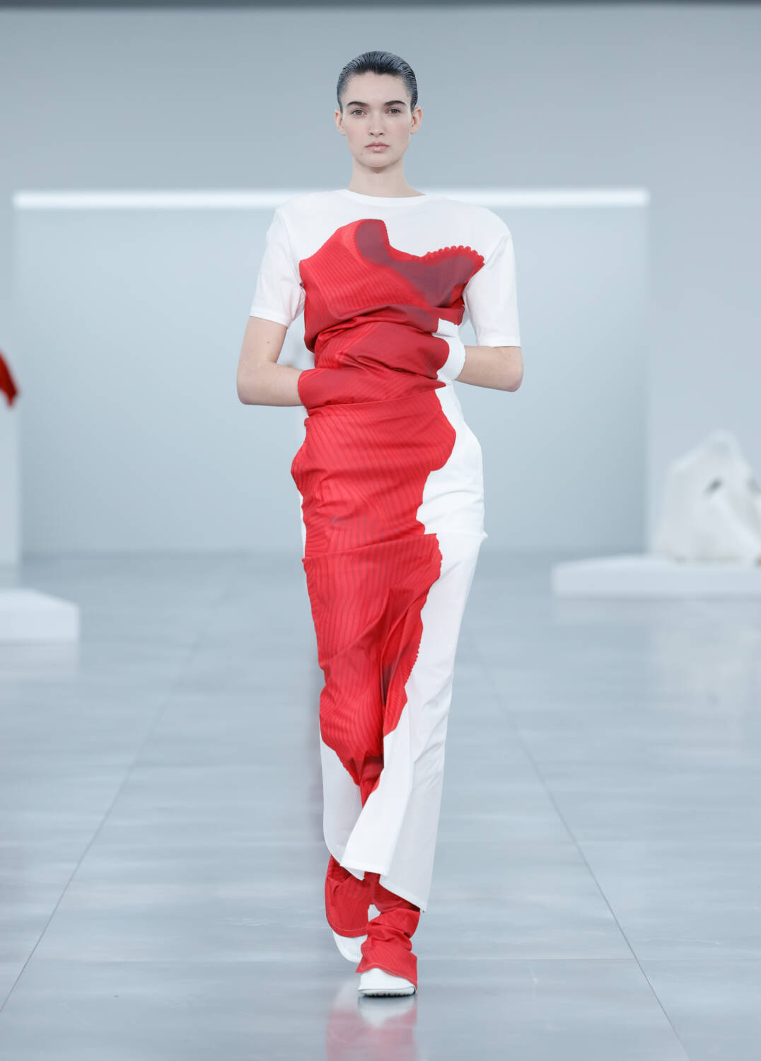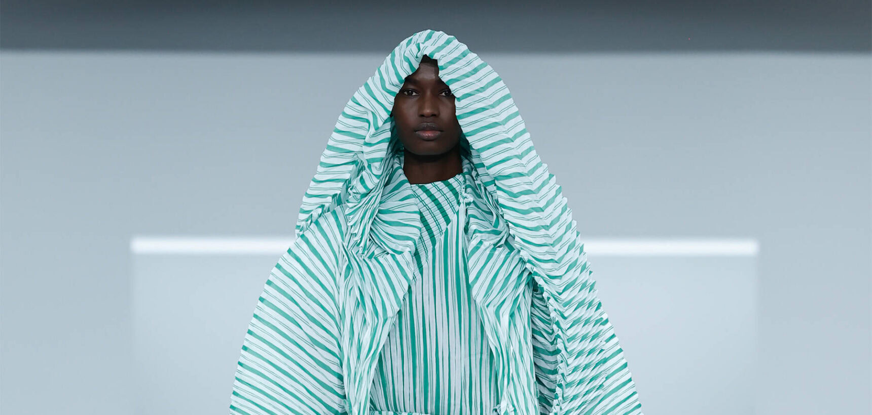 Steel emptiness, flickering lights and the silent swell of moving material. Issey Miyake’s AW25 show, [N]either [N]or, was fashion in its purest, most contemporary form. Staged at the Carrousel du Louvre in the centre of Paris, the collection unfolded like a living sculpture inspired by Erwin Wurm’s One Minute Sculptures.