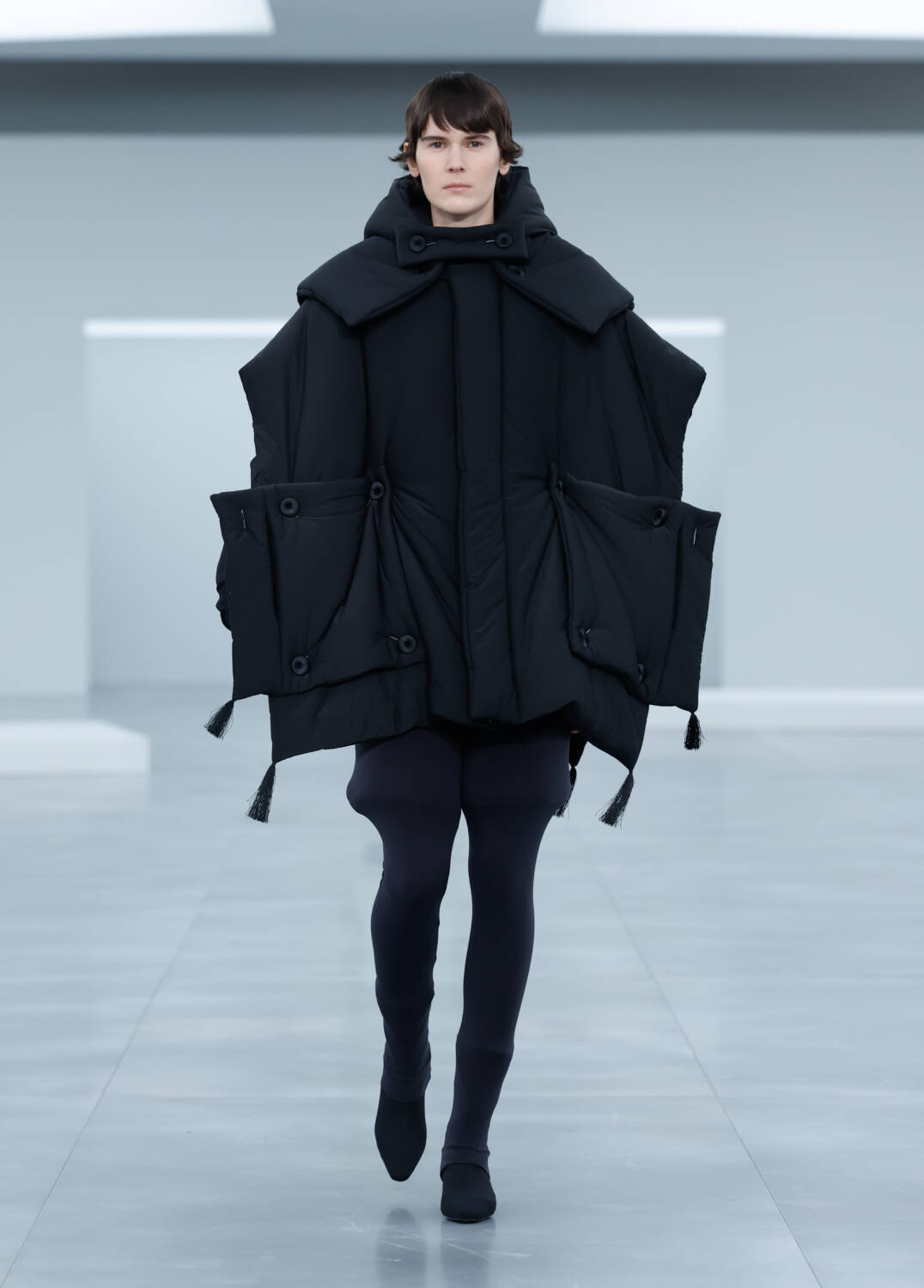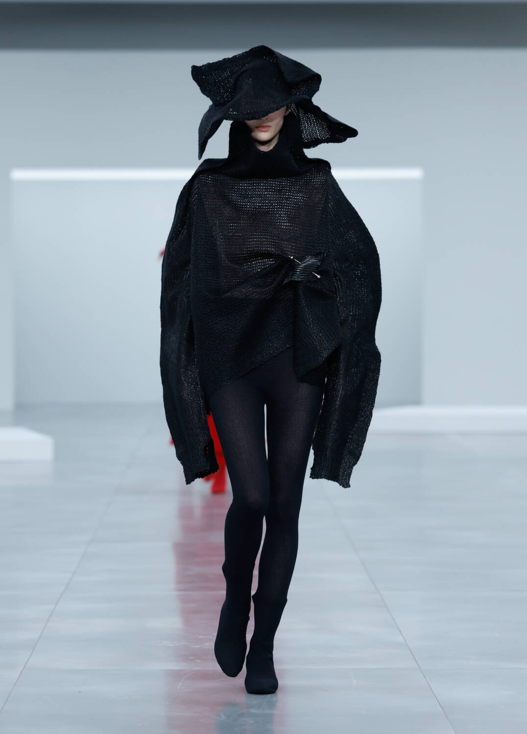 And at the end, a shift. Voluminous black forms stumbled onto the runway – life-sized pillow-puffers with tassels trailing behind. Peplum was reimagined, stripped of gender. Abstract trousers twisted into four-legged silhouettes, because who, or what, does Miyake dress? Folded pockets were turned inside out and became angular trousers. The final looks featured knitted faces (hats), concealed in cascading fabric (dresses). It as a reminder that a garment is only as powerful as the way it is worn.