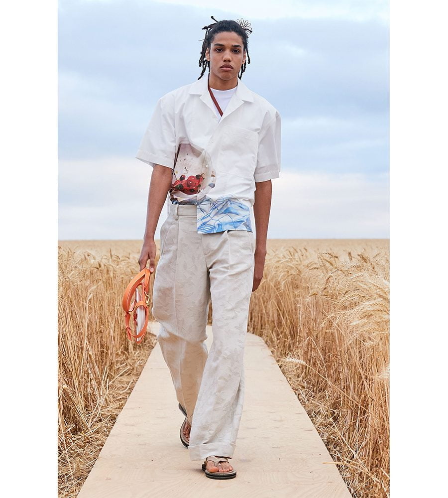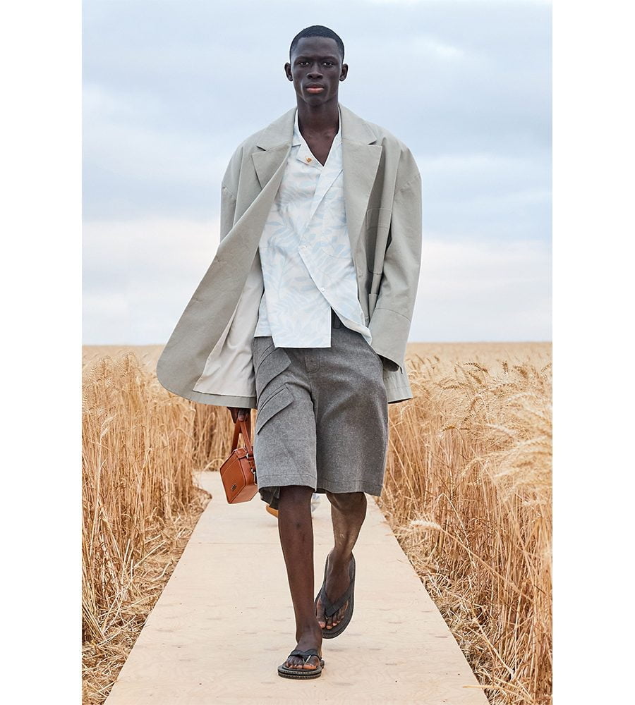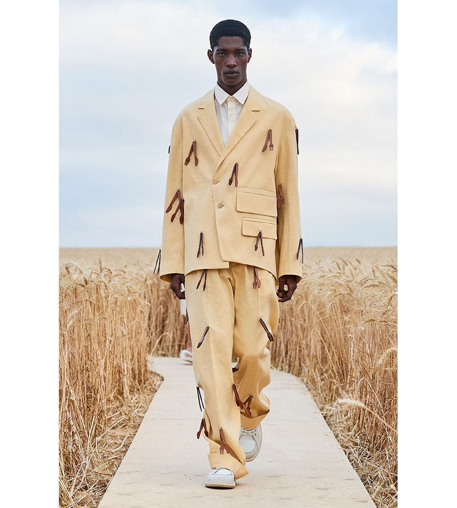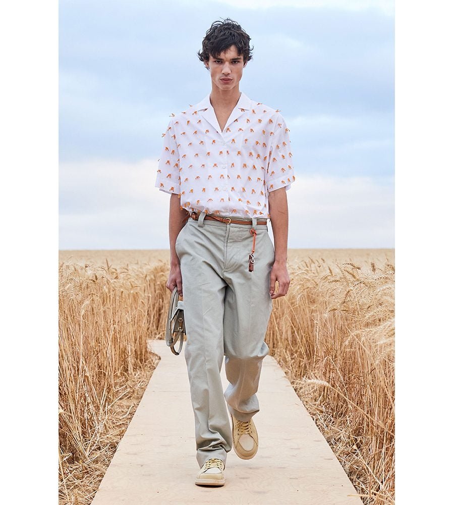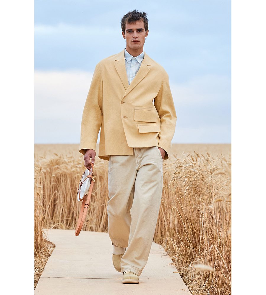 Titled L’Amour, a love letter for his team after a year none of us could’ve imagined, Jacquemus looked to the choreography work of Alexander Ekman and the fashions of Emir Kursturica’s film, Time of the Gypsies, for inspiration. Working in a washed-out palette of greys, greens and yellows, Jacquemus created a cohesive collection that will leave his legions of devotees thirsty for a summer get-away. For the men’s, it was suits in slightly oversized proportions and shirts covered with painterly finger-strokes. Many of the looks came embroidered with micro-beaded wheat sheaves that swayed as the model’s walked through the field. Keeping quintessentially Jacquemus, the womenswear was dominated by slip- and wrap dresses made in summery linens. Dainty bralettes worn with high-waisted trousers, belts adorned with tiny cardholders. The sort of stuff Jacquemus excels at. Model’s carried Jacquemus-stamped punnets of strawberries and a new version of the Chiquito Noeud bag, which can now hold a single plate. Anyone fancy a Jacquemus picnic?