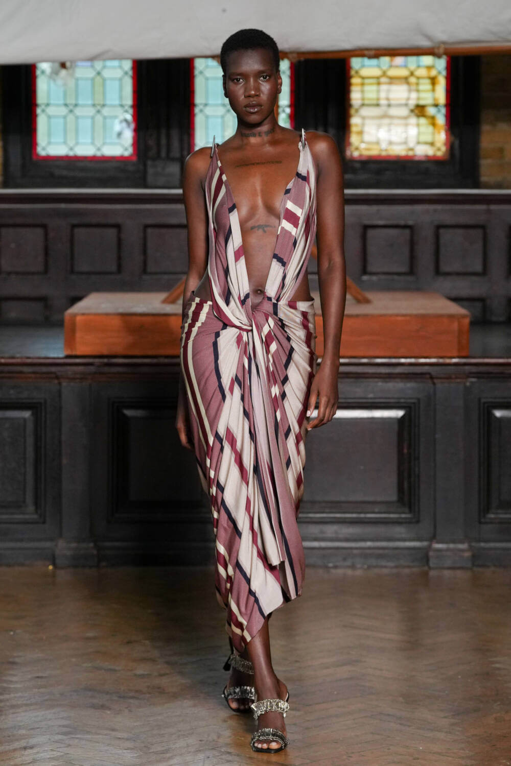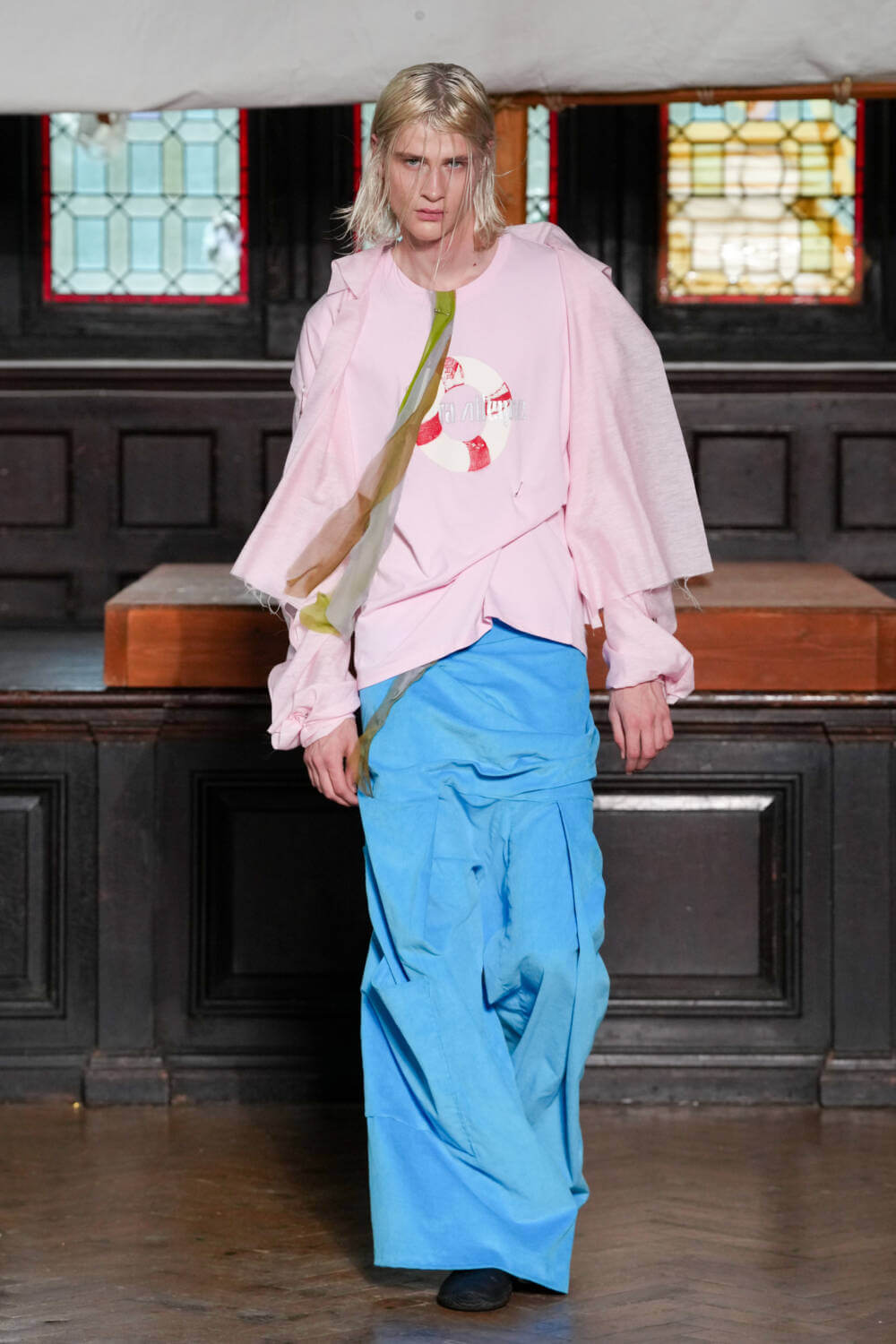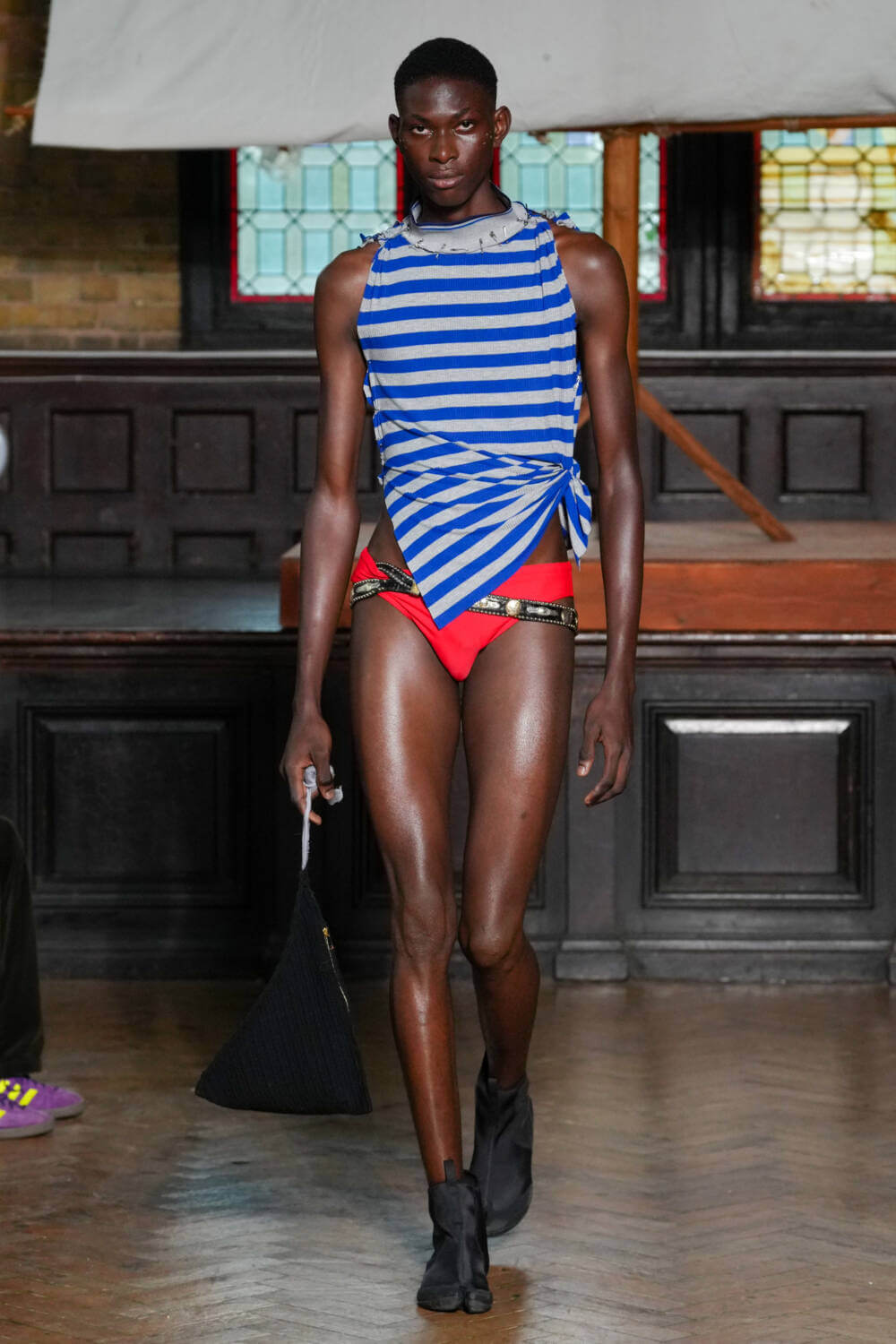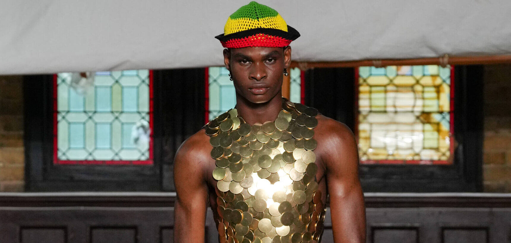 Backdropped by a hand-painted Ibby Njoya tapestry, models slowly skulked between aisles, disrupting the homogeneity of menswear with each draped, knotted and reconfigured look. Comfortable and loose shirting, skirts and baggy jeans were cut with a blasé kind of punk sensibility. One model wore a gold vest that resembled ancient armour with striped mariners shorts and a rastacap in a subtle nod to Alleyne’s Rastafarian father. Silhouettes were otherwise tighter than usual, with cuts skimming below the navel and pelvic line.