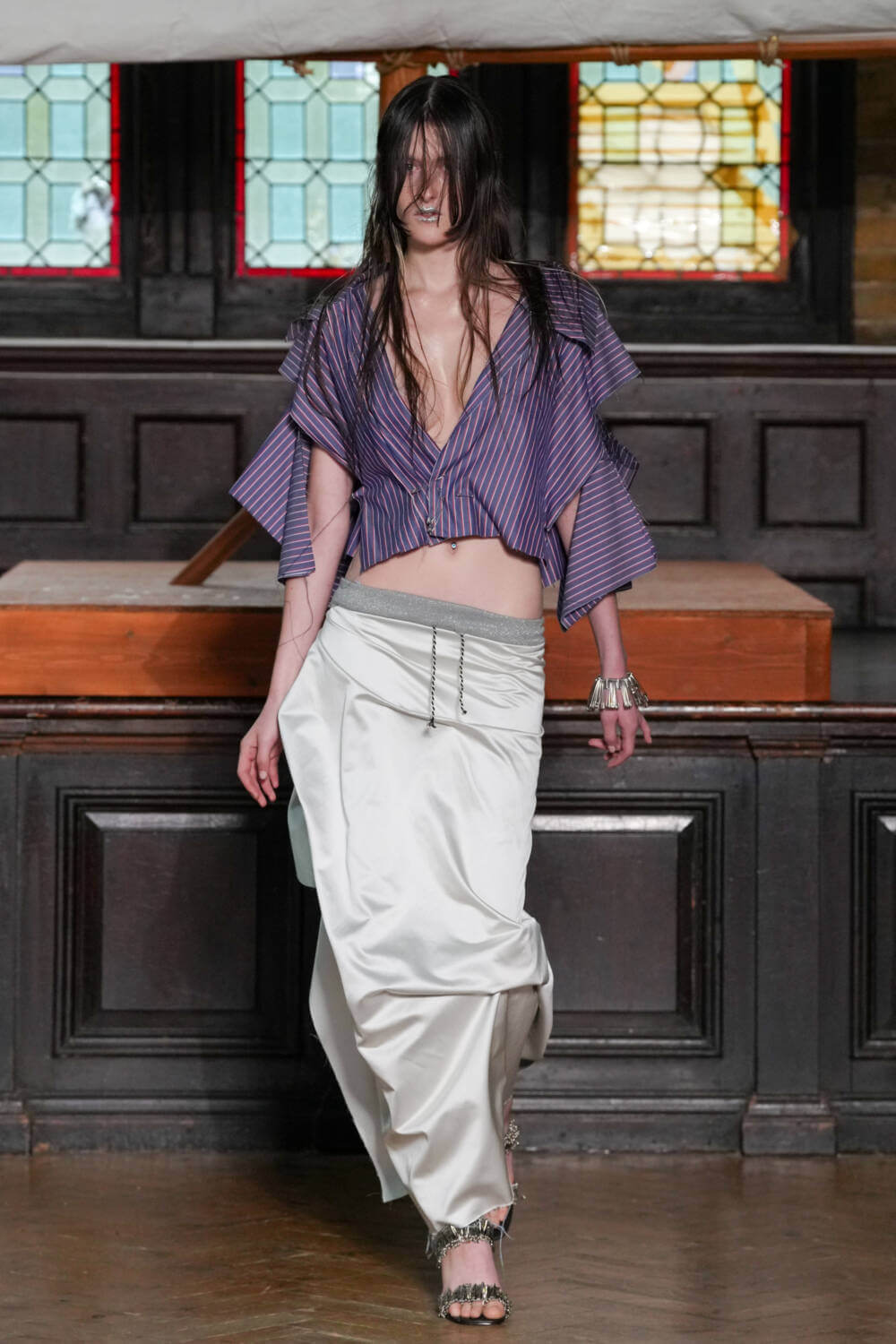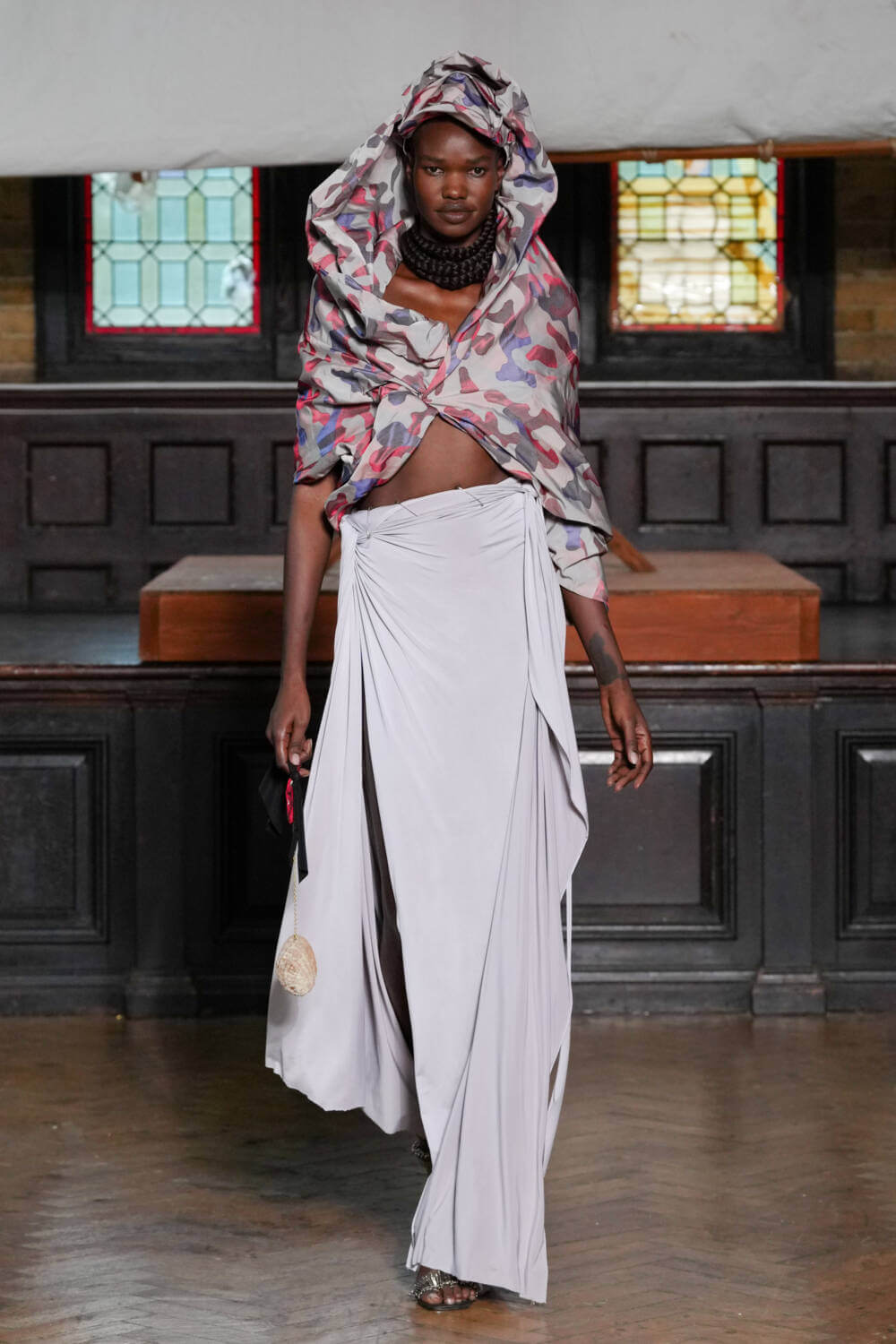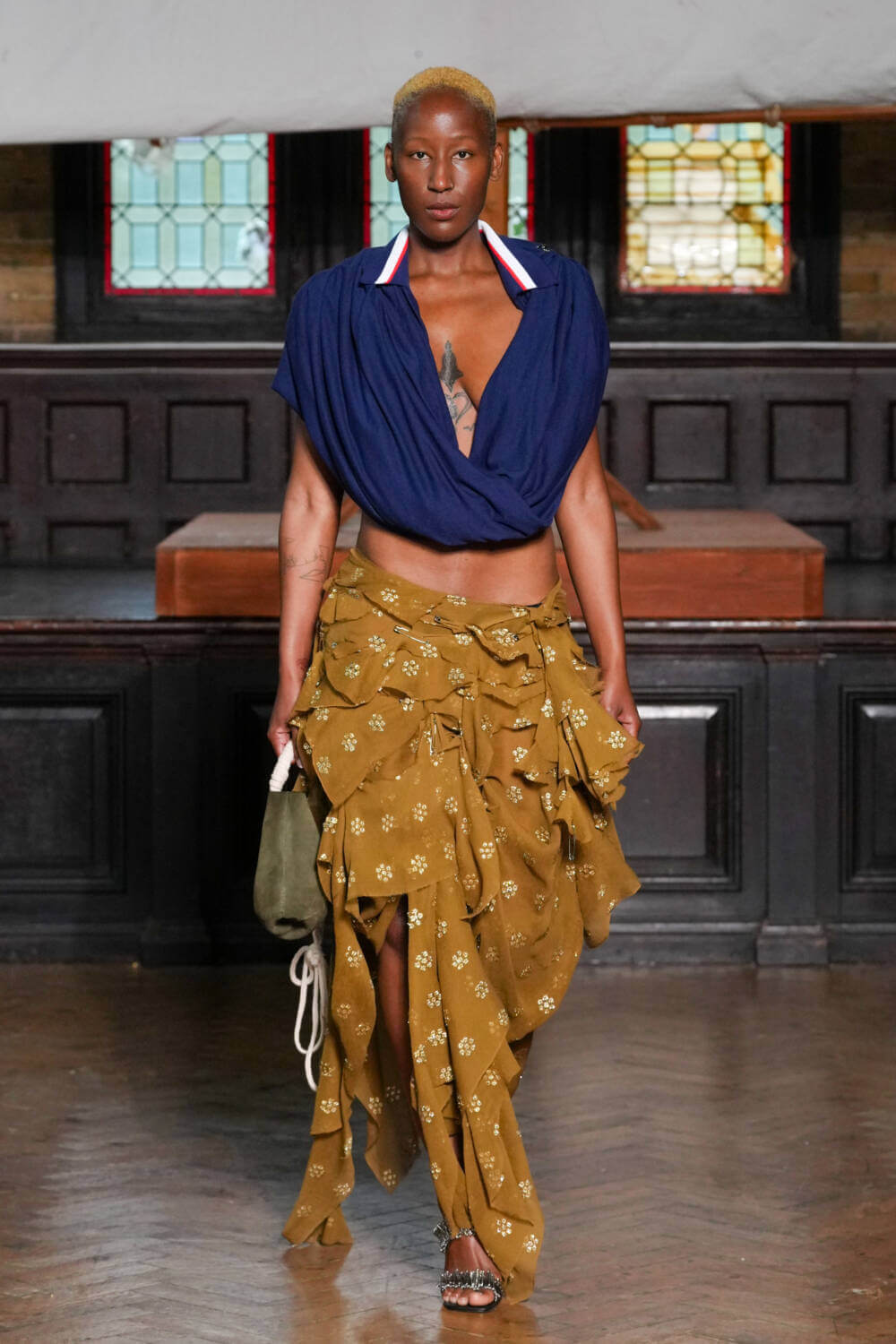 A captivating smorgasbord of Afrobeats, death metal and spoken word opened Jawara Alleyne’s SS24 show. Articulated by Tafari – the designer’s brother, a musician and muse – inside a converted church in Whitechapel, it was Alleyne’s first-ever standalone showcase since graduating from Fashion East last year.