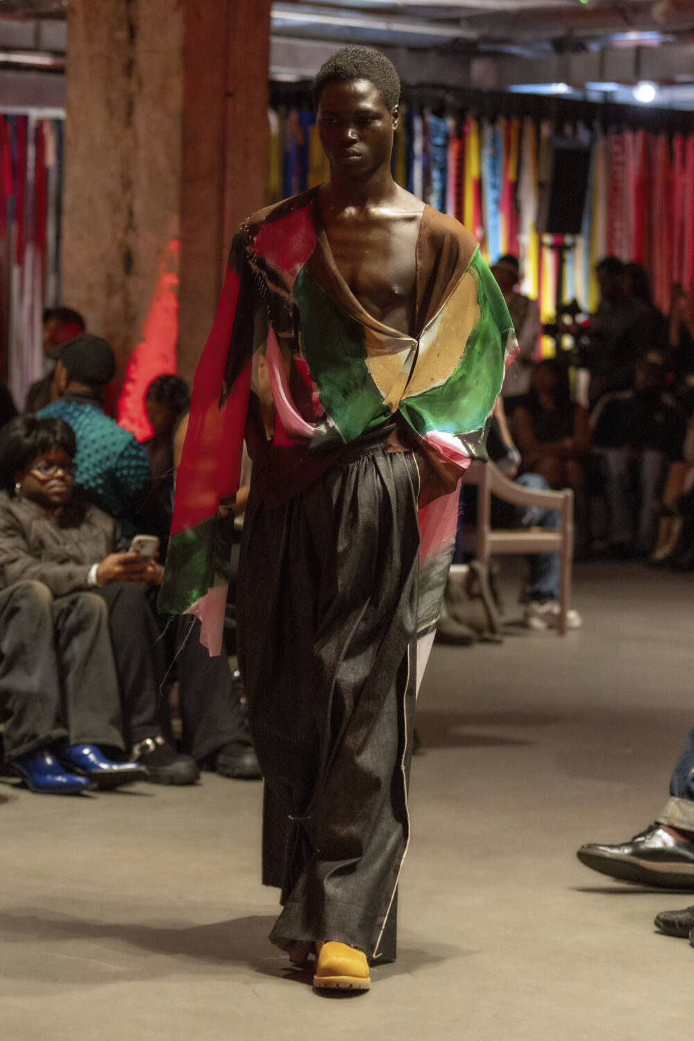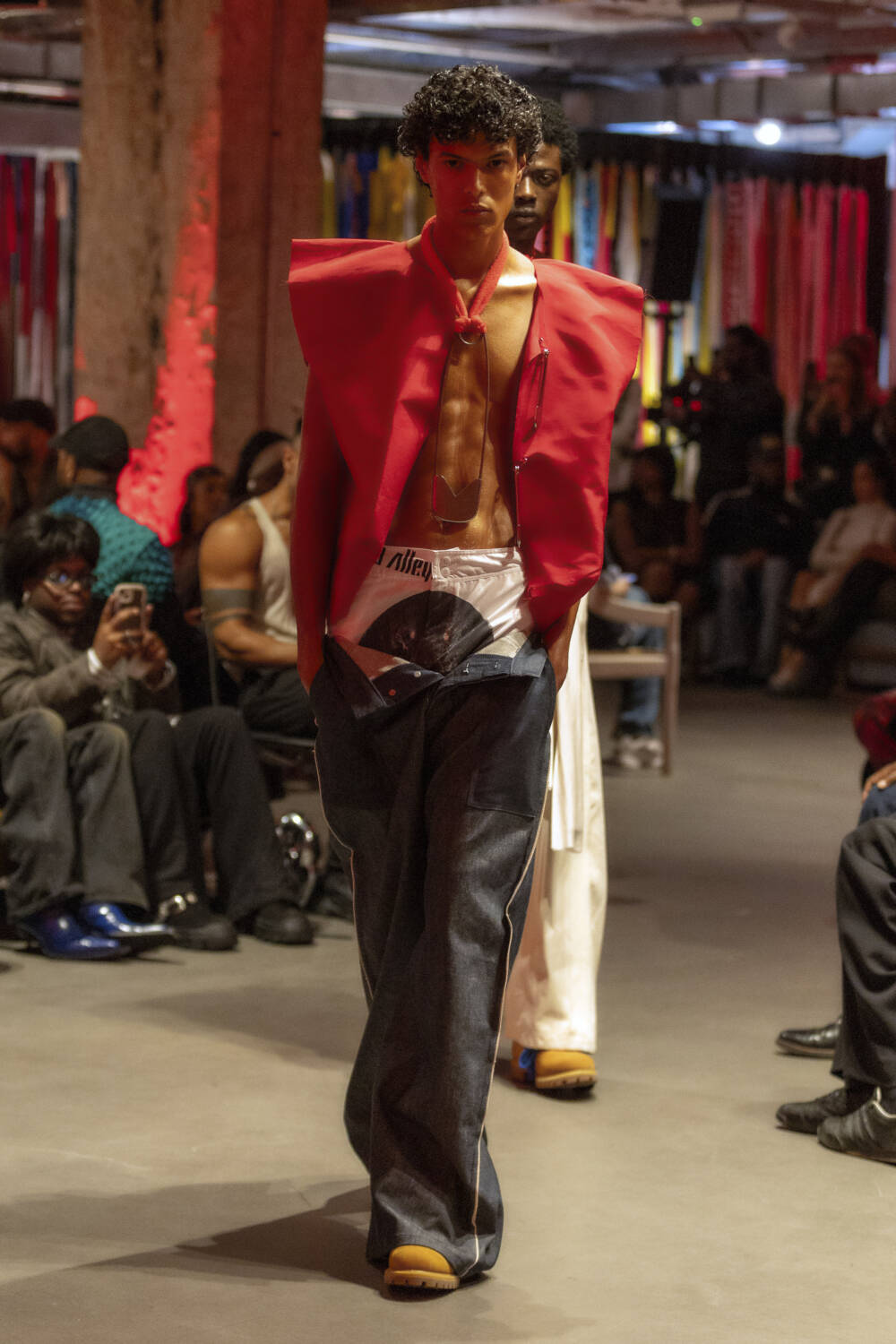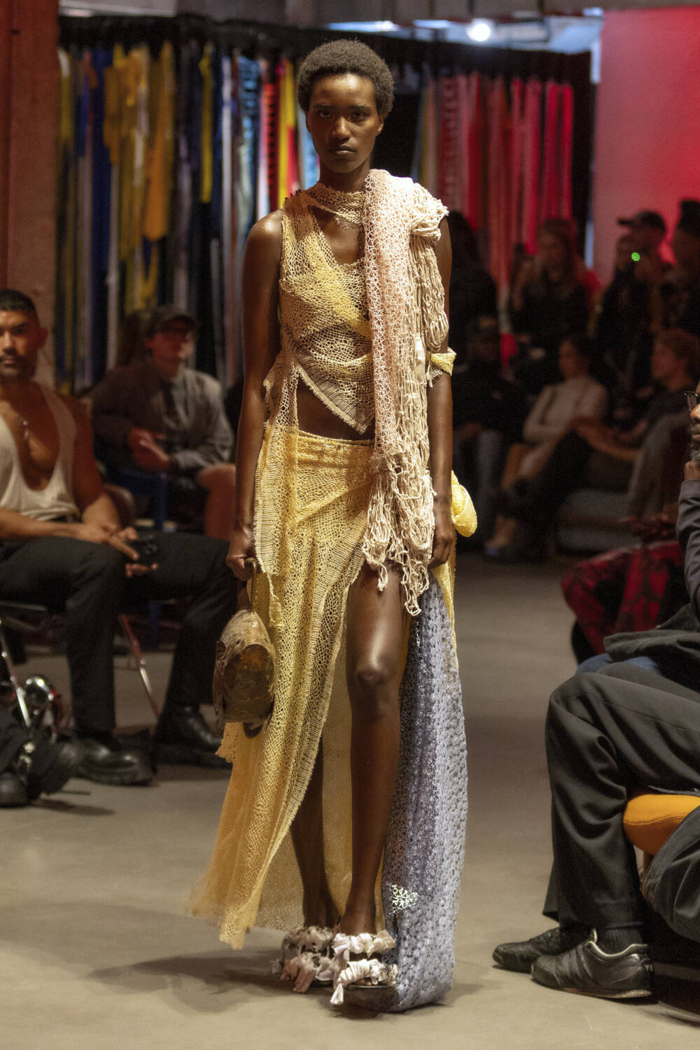 Alleyne continued to expand on his design lexicon with an intimate catwalk on the penultimate day of London shows, drawing on his Caribbean heritage and his life growing up on the Cayman Islands for inspiration. Models came in crochet dresses that resembled fishing nets, alongside tie-dyed looks that came with tattered hemlines. Elsewhere, there were nautical striped trousers and double waist-band jeans to round up the offering, completing the designer’s strongest collection to date.
