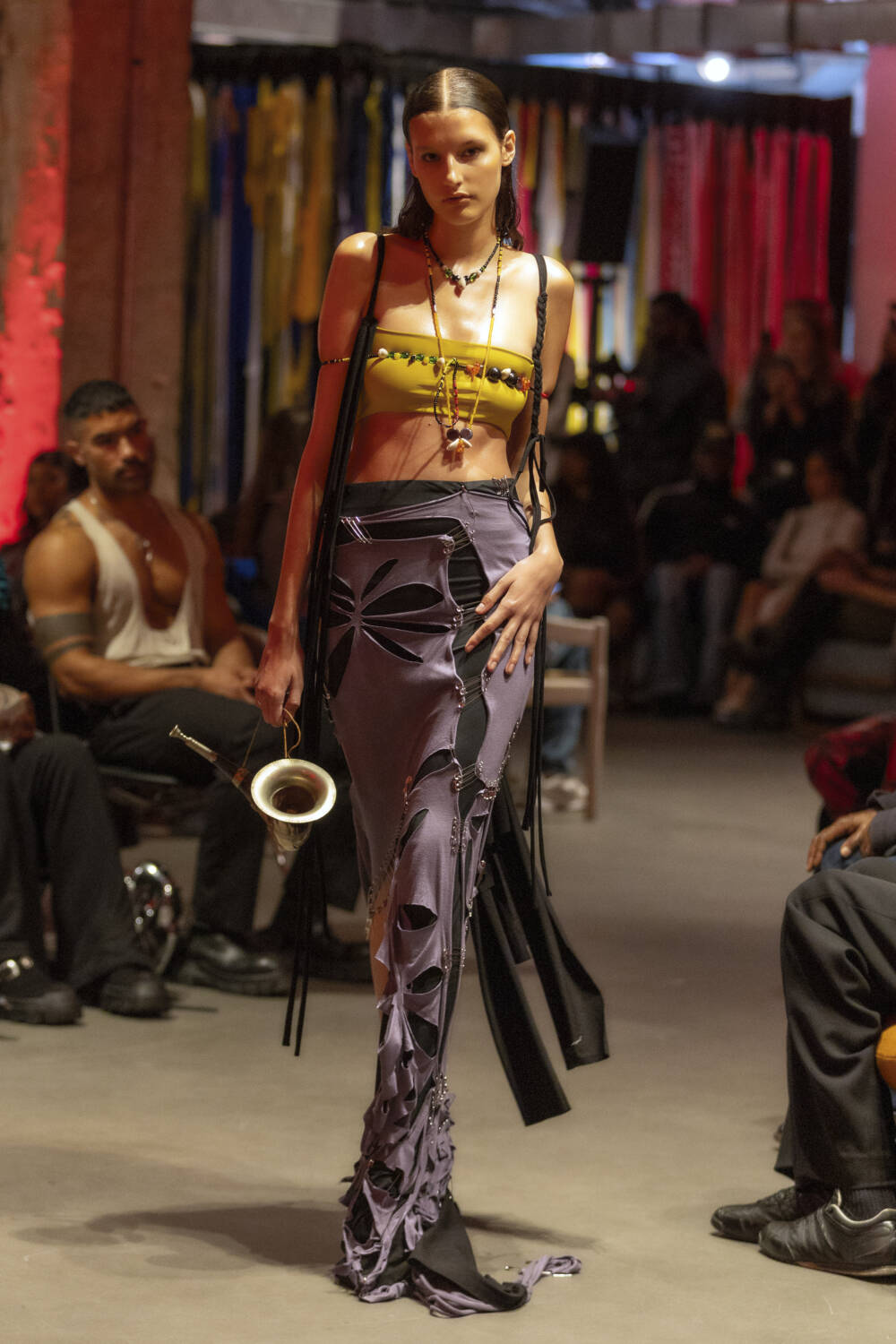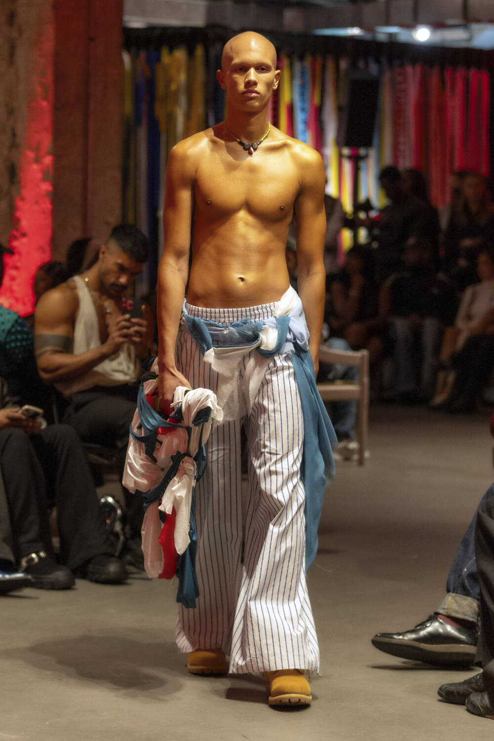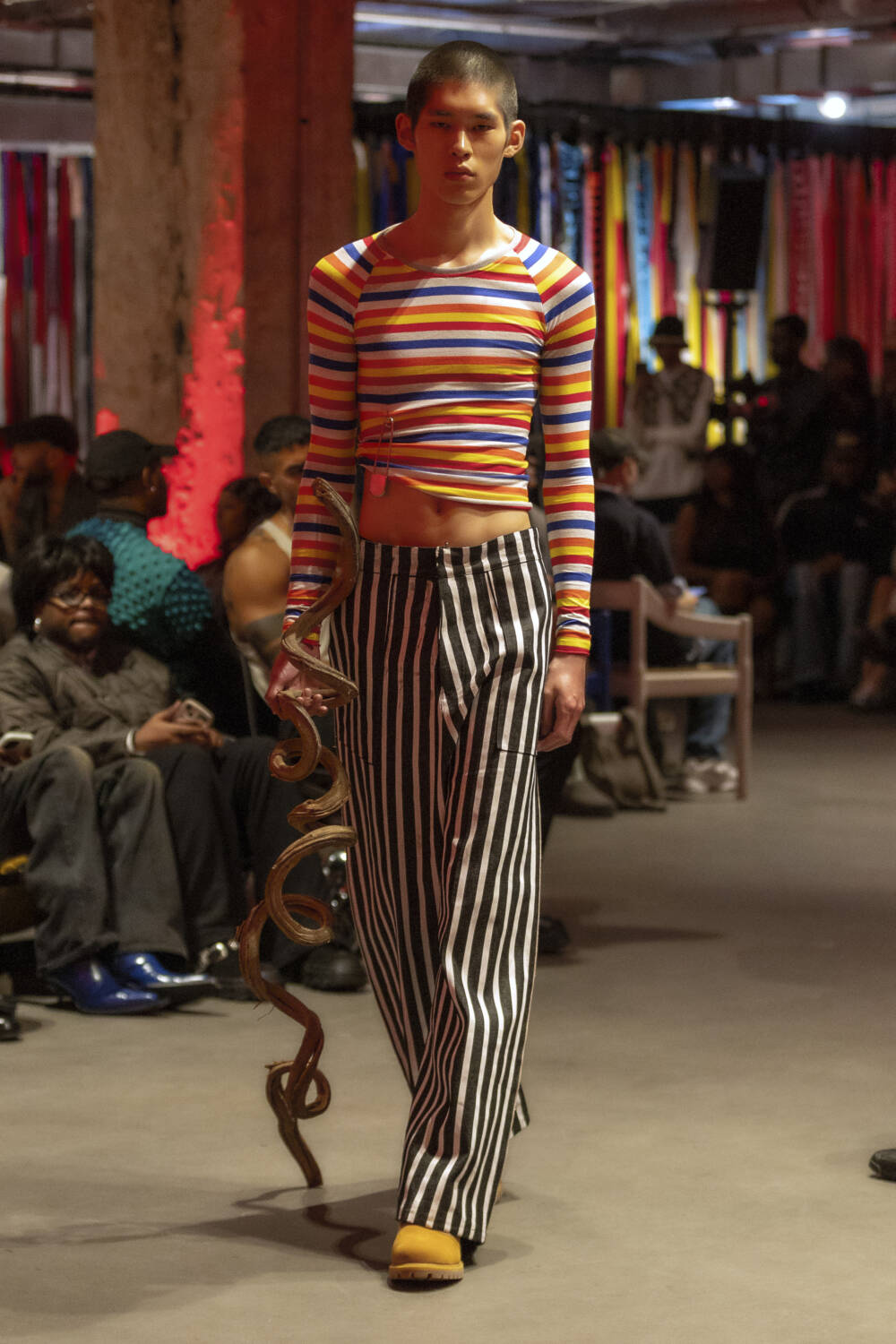 Alleyne continued to expand on his design lexicon with an intimate catwalk on the penultimate day of London shows, drawing on his Caribbean heritage and his life growing up on the Cayman Islands for inspiration. Models came in crochet dresses that resembled fishing nets, alongside tie-dyed looks that came with tattered hemlines. Elsewhere, there were nautical striped trousers and double waist-band jeans to round up the offering, completing the designer’s strongest collection to date.