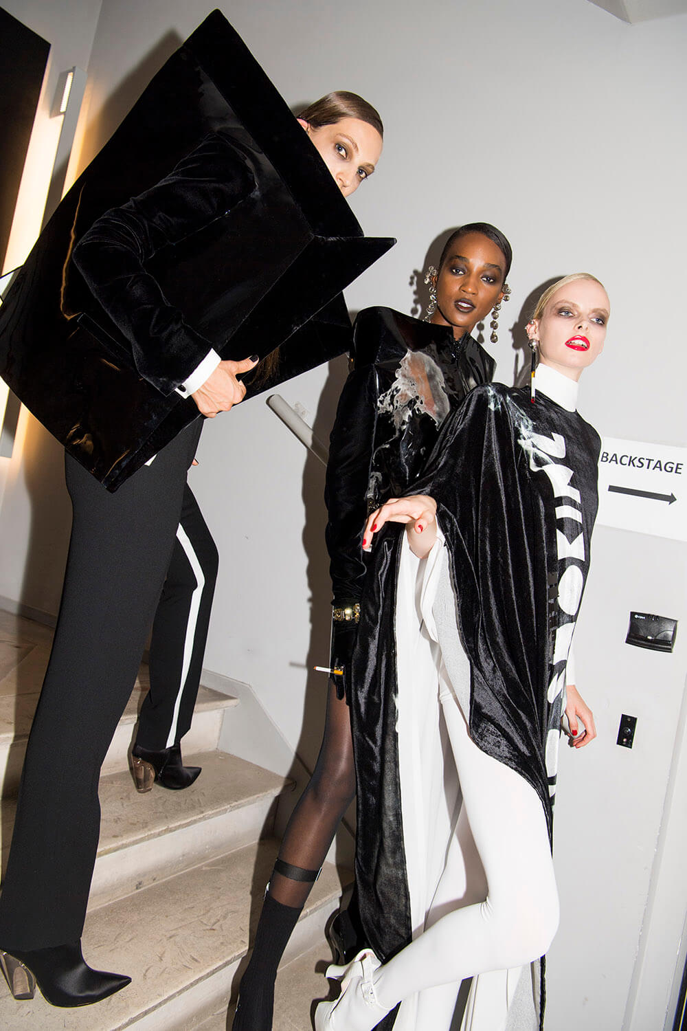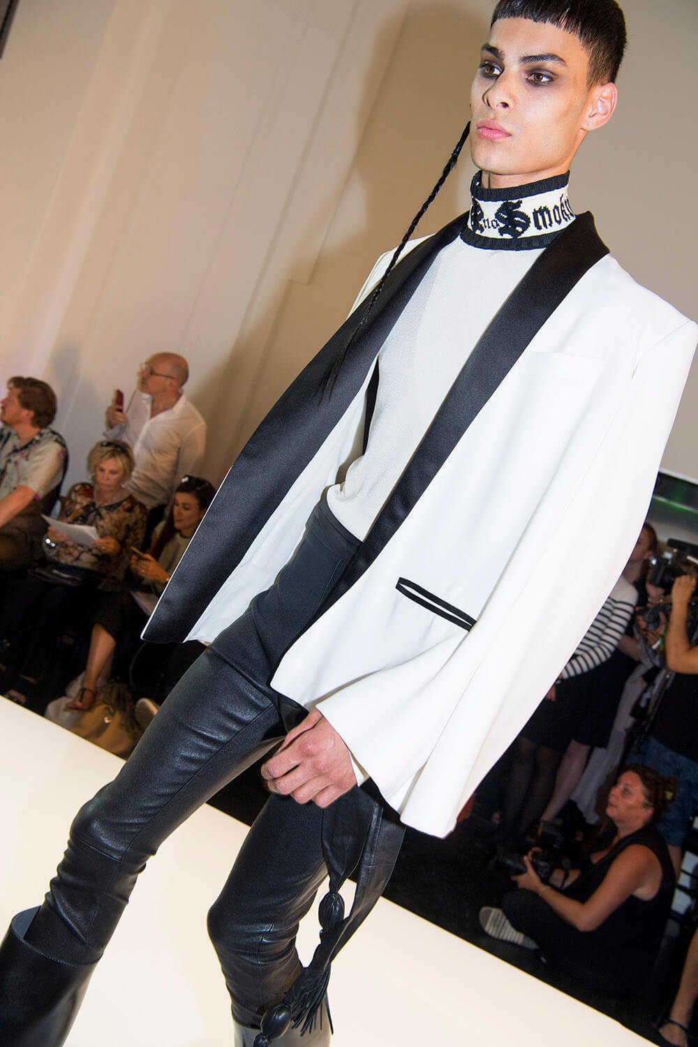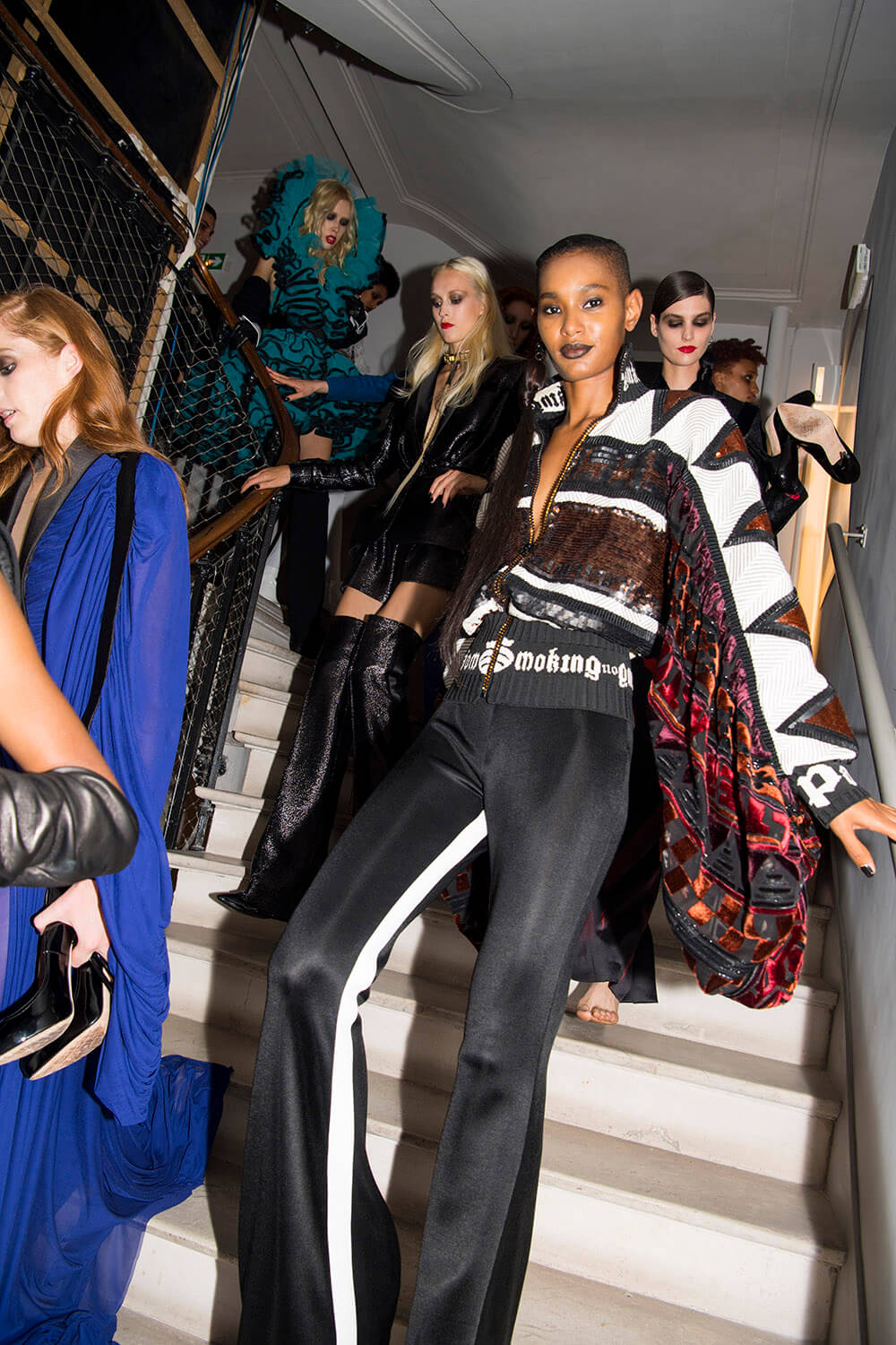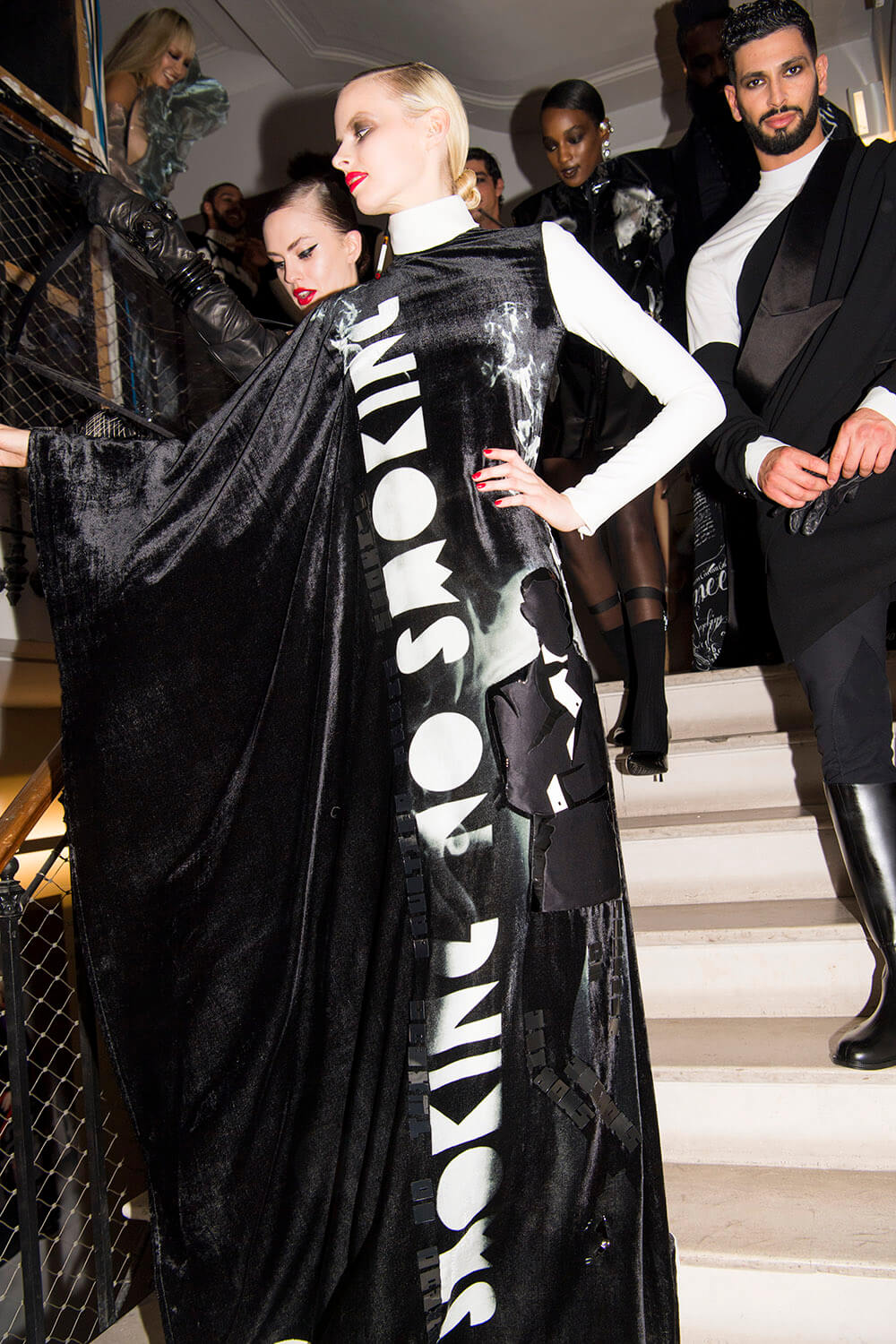 Warning: Smoking Kills. But Le Smoking can be positively life affirming. Jean Paul Gaultier based his couture show on the idea of tuxedo dressing and tuxedo attitude, both for men and women. The designer, who stepped away from ready-to-wear to focus on couture in 2014, riffed freely on tux dressing, happily blurring gender boundaries as he went. For men, the cummerbund was made in polished patent leather and widened so it became a corset. For women the frills on a masculine dress-shirt were exaggerated into a mini dress. There were witty his ‘n’ hers exits with men in black sequin maxi skirts or swagged bustiers and women in tux trousers with a spray of black feathers serving as a top. Every manipulation of the theme showcased Gaultier’s cutting skills. As for the health implications of smoking, Gaultier literally made light of it, with outfits bearing names that translated to: “Do you have a fag?” “Smokin’ Hot” and “Die Another Day. One model strode the runway in a smoke grey chiffon gown, trailing gossamer plumes of fabric behind her. Oh the glamour! Gaultier can remember a time when fags along with warm champagne, wicked gossip (and maybe a line or two) were the fuel of fashion. Now smoking is banned backstage and fashion is powered by the smoke and mirrors of social media. Pouf.