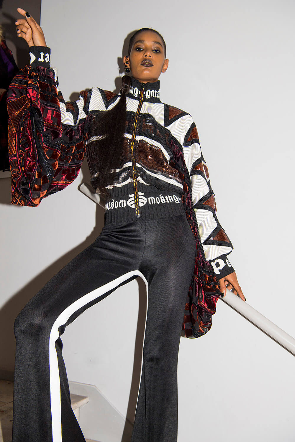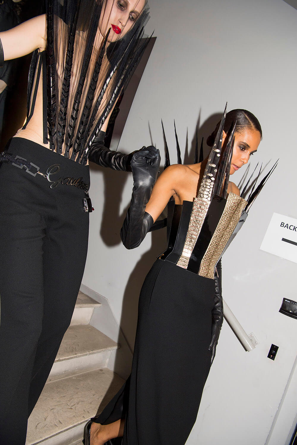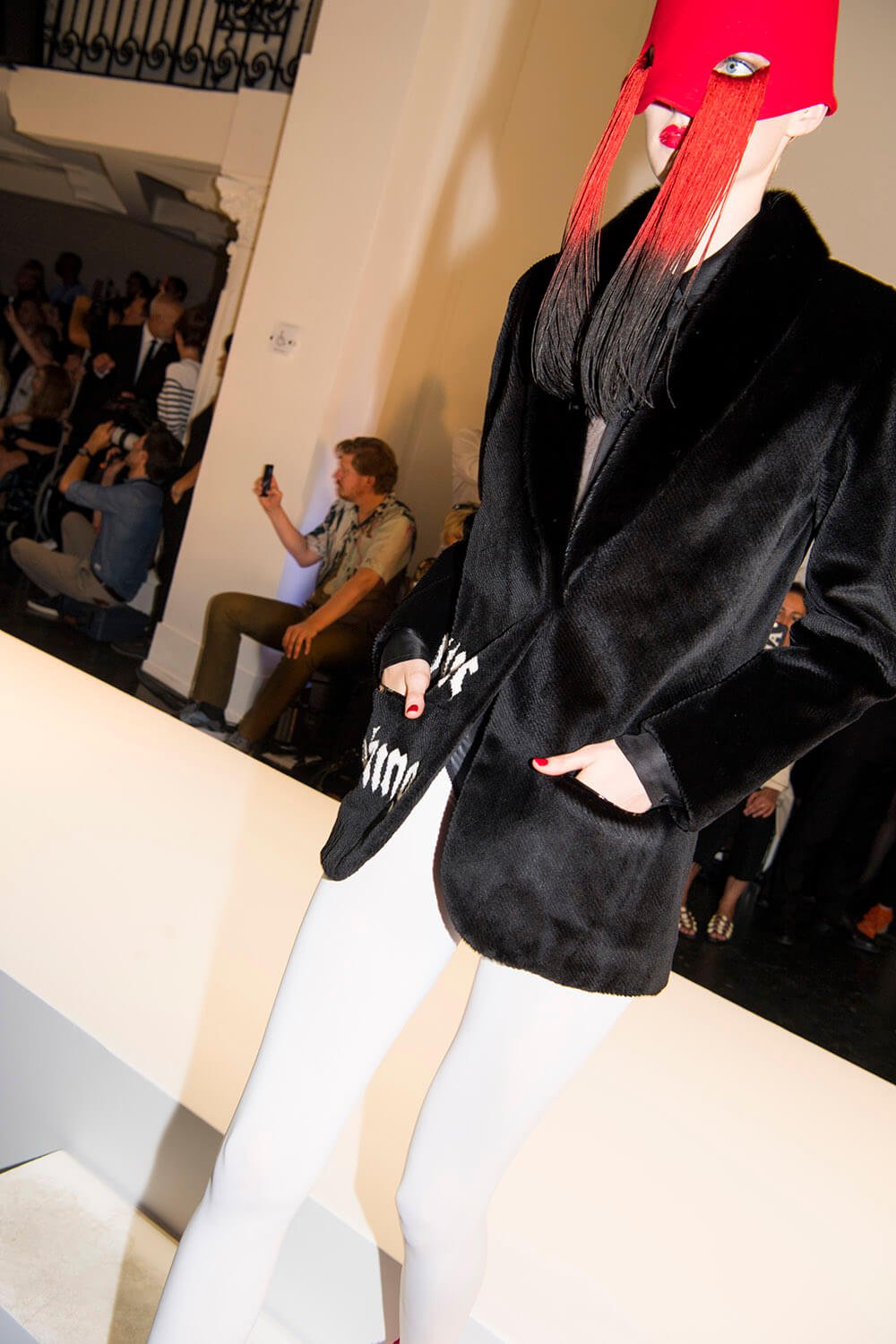 Warning: Smoking Kills. But Le Smoking can be positively life affirming. Jean Paul Gaultier based his couture show on the idea of tuxedo dressing and tuxedo attitude, both for men and women. The designer, who stepped away from ready-to-wear to focus on couture in 2014, riffed freely on tux dressing, happily blurring gender boundaries as he went. For men, the cummerbund was made in polished patent leather and widened so it became a corset. For women the frills on a masculine dress-shirt were exaggerated into a mini dress. There were witty his ‘n’ hers exits with men in black sequin maxi skirts or swagged bustiers and women in tux trousers with a spray of black feathers serving as a top. Every manipulation of the theme showcased Gaultier’s cutting skills. As for the health implications of smoking, Gaultier literally made light of it, with outfits bearing names that translated to: “Do you have a fag?” “Smokin’ Hot” and “Die Another Day. One model strode the runway in a smoke grey chiffon gown, trailing gossamer plumes of fabric behind her. Oh the glamour! Gaultier can remember a time when fags along with warm champagne, wicked gossip (and maybe a line or two) were the fuel of fashion. Now smoking is banned backstage and fashion is powered by the smoke and mirrors of social media. Pouf.