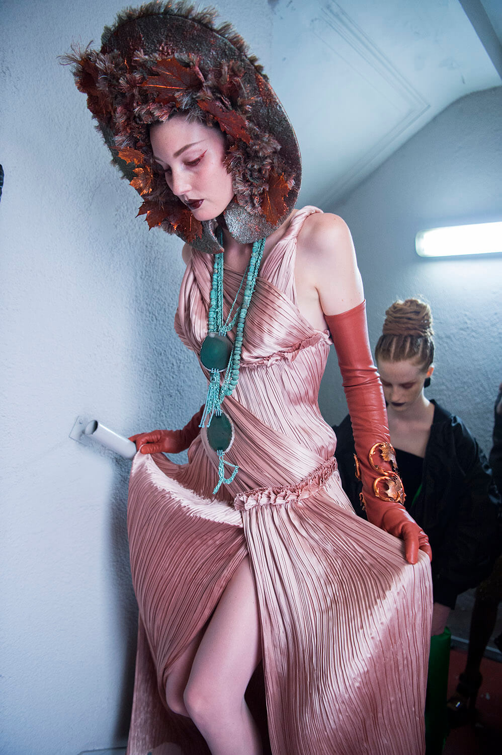 Got wood? Jean Paul Gaultier did. Trees, that is. They were on the walls, setting the scene for what was going to be a trip into the forest. But, as the old adage says, if you go down to the woods today you’re in for a big surprise. Yep, because as the show began we were presented with a cast of rather fetching woodland nymphs. But sexy. In a symphony of brown. Who knew? Think, outdoorsy – giant patchwork fur coats, bark prints, lioness hoods, a supersized backpack. A very glamorous selection of forest dwellers, to be sure – Anna Cleveland, Lindsey Wixson, Coca Rocha. Mr Gaultiers muses, in other words. Anna, in particular, did a rather nice turn as a kind of fluttering creature. Butterfly? Bird? Not important. It ended, as is tradition, with Gaultier and his bride walking down the runway to much applause. Because that’s what the spectacular Gaultier and his gang of girls do. They put on a show.