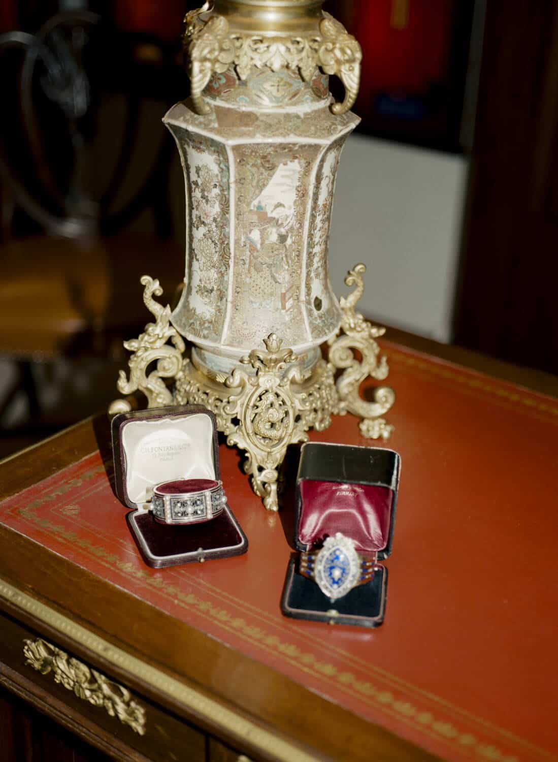 From left: art deco diamond rings; the Pennisi family; an antique parure in its original box; Guido and Gabrielle Pennisi