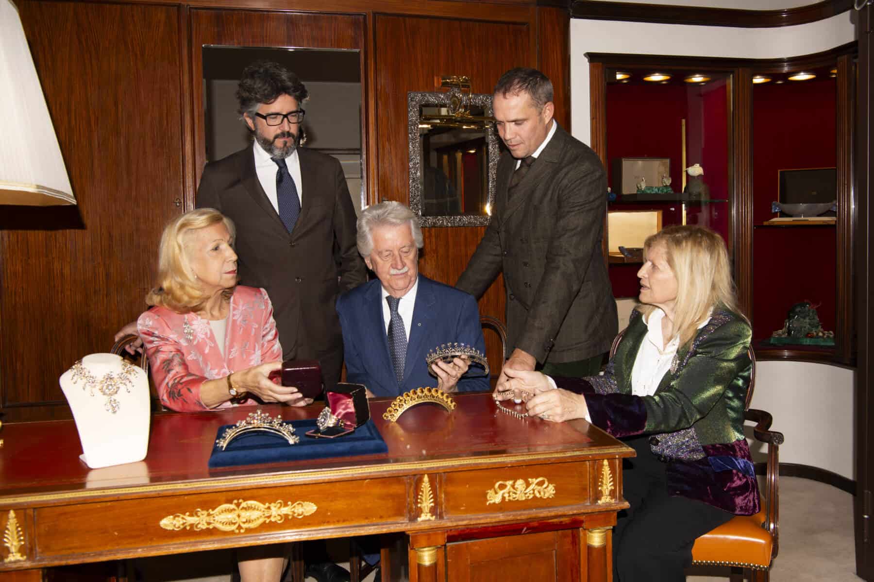 From left: Paola Pennisi; Gabrielle Pennisi holding a yellow gold and silver flower brooch with old-cut androse-cut diamonds, circa1860 and a diamond bird pin; Marina Pennisi, daughter of the founder; Emanuele Ferreccio-Pennisi