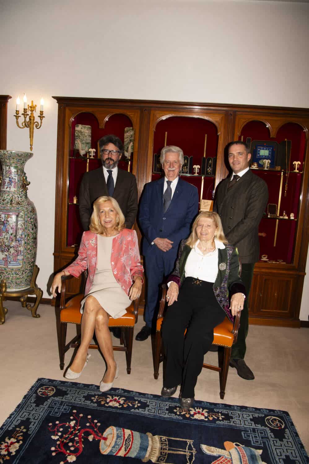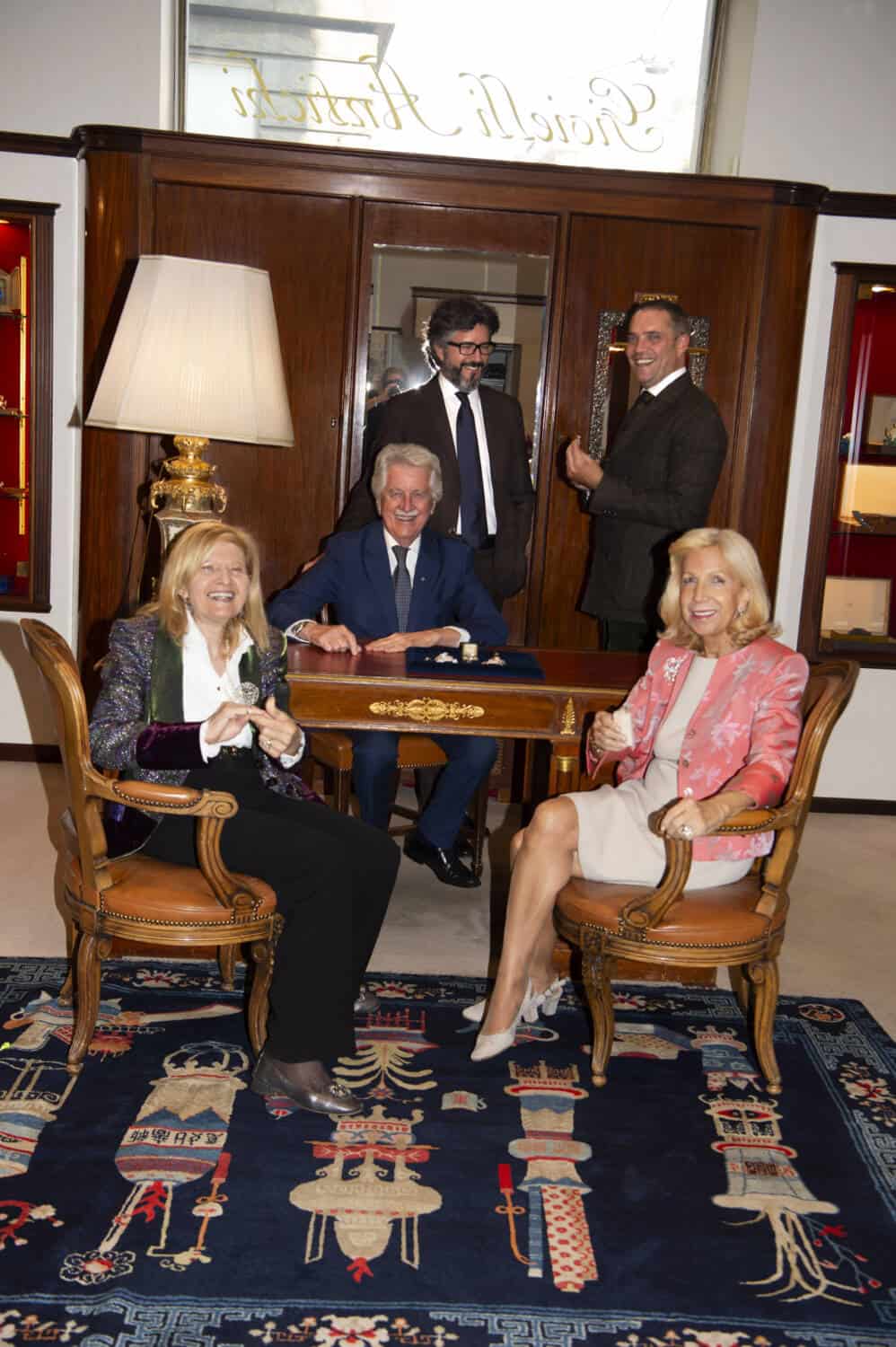 From left: Paola Pennisi; Gabrielle Pennisi holding a yellow gold and silver flower brooch with old-cut androse-cut diamonds, circa1860 and a diamond bird pin; Marina Pennisi, daughter of the founder; Emanuele Ferreccio-Pennisi