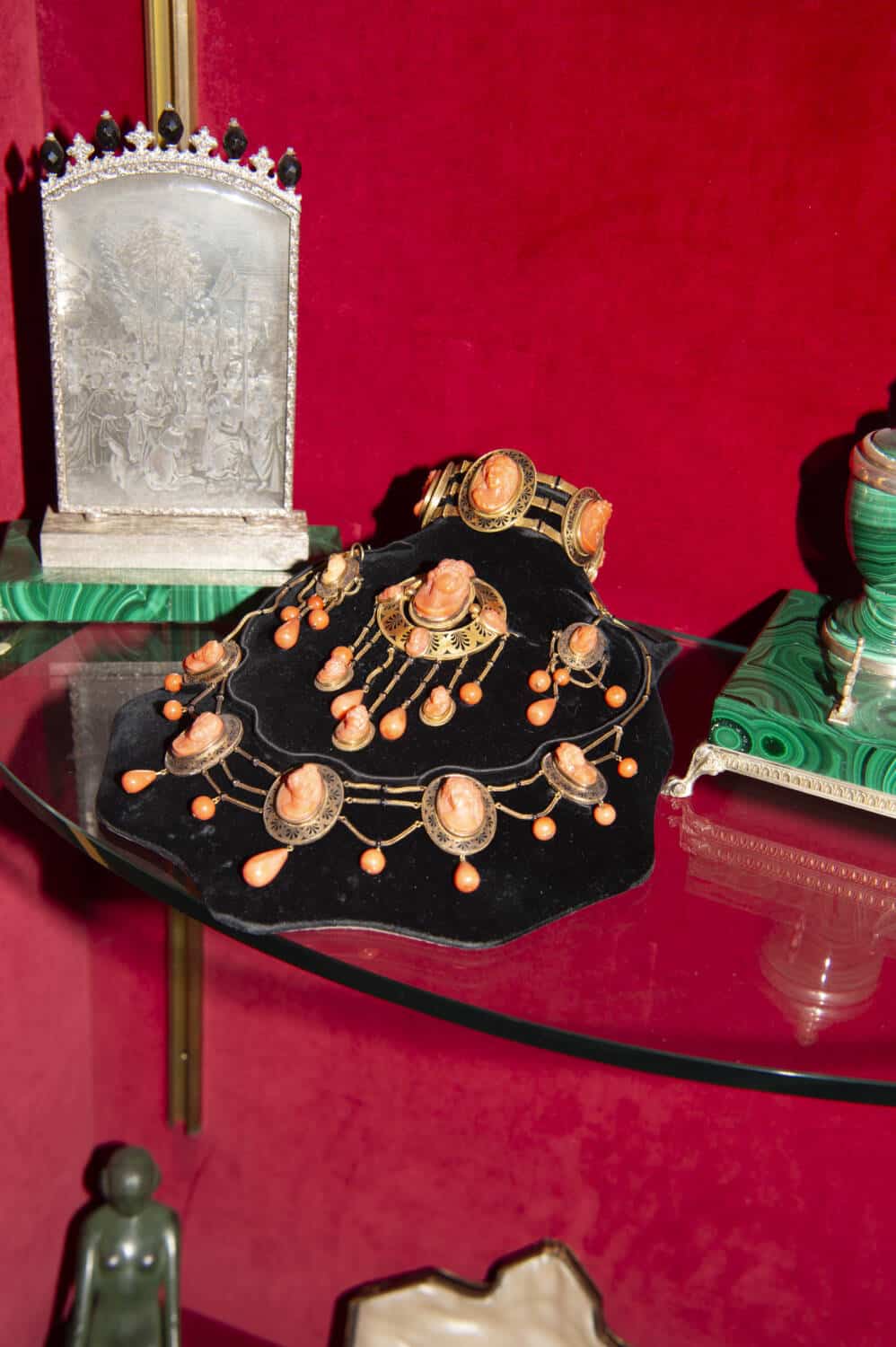 From left: 20th century Mario Buccellati engraved silver and malachite portable travel altar, antique coral cameo parure; 19th century, French antique gold, silver, rose-cut diamond and natural pearl bracelet. A yellow gold, silver, diamond, natural pearls and blue enamel bracelet, circa 1850.