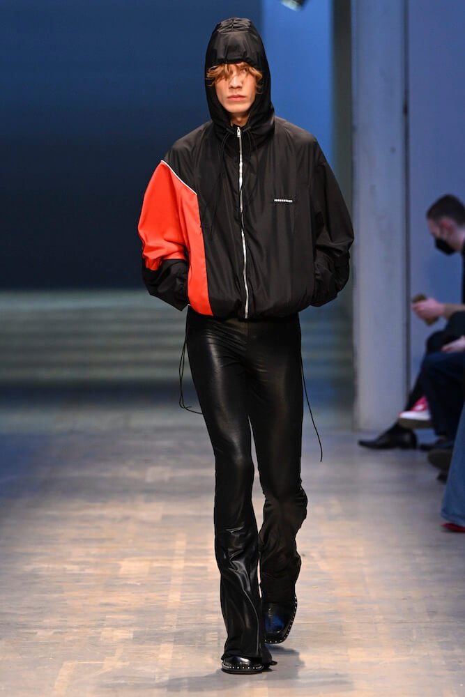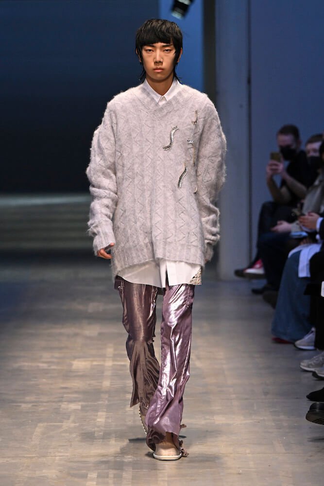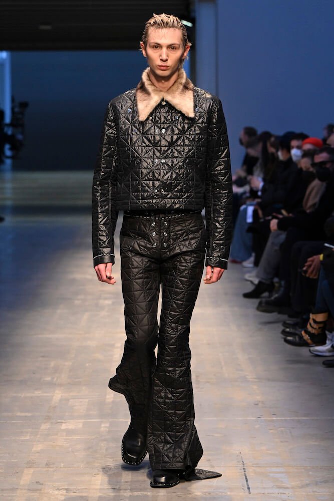 “Rage is a catalyst for creativity,” said the designers in their show notes, with ribbed, woollen gloves with fingers like Slender Man’s being the most anarchist ingredient of all. Add in broaches worthy of a magpie’s snatch, distressed denim and two, free NFTs to the equation,– guests could scan a barcode upon entry to claim theirs – and you have a young London label full of promise.