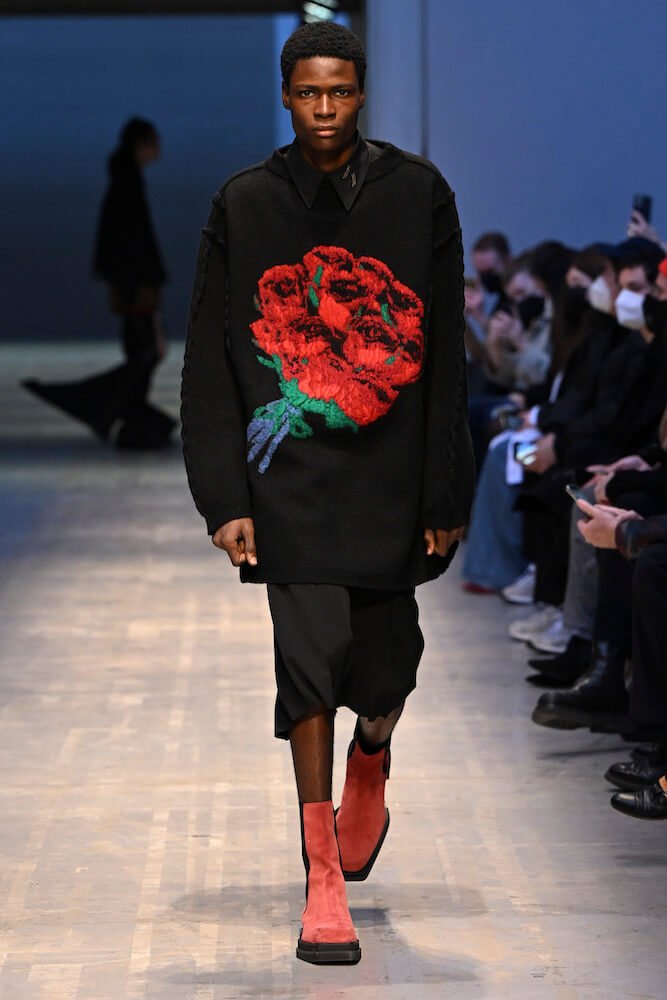 And it showed. This season was the brand’s strongest collection yet, with swollen mohair knits, blazer-school skirt combos and quilted outerwear proving to be super desirable. On the agenda were long lines, boxy shapes and elongated silhouettes – be it oversized jumpers stamped with bouquets of roses, or trousers that were tight on the thigh before falling into distressed flared hems that pooled over gothic loafers.
