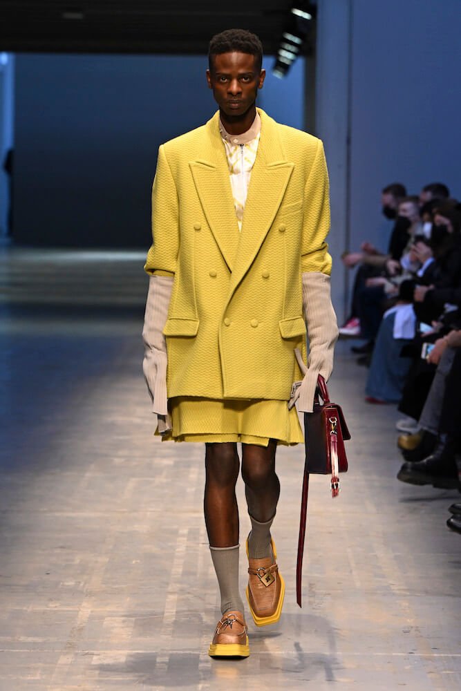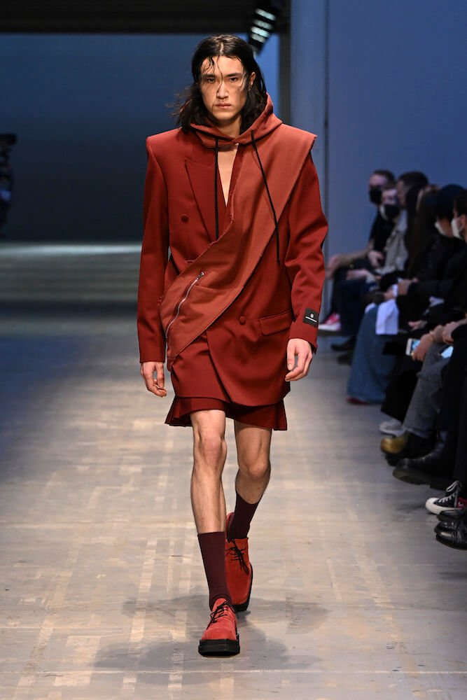 Refreshing. That’s one word that summed up JordanLuca’s Milan Fashion Week debut. It was hot, intense and steeped in oddball eroticism. Sex and seduction were on the minds of the London-based twosome. A balancing act between anger and fragility guided their design vocabulary, with the pair keen to illustrate how they’ve persevered through the hardships of the pandemic.